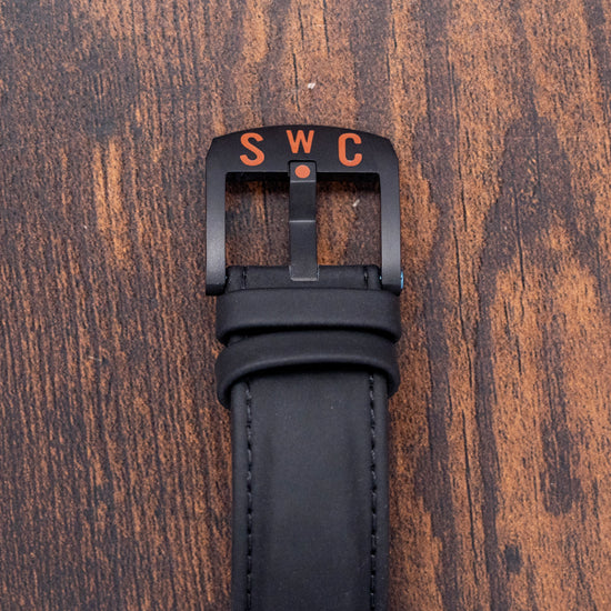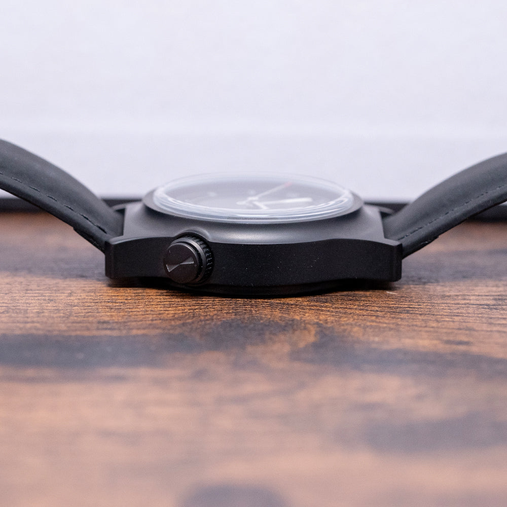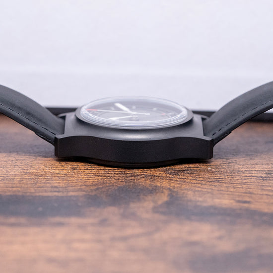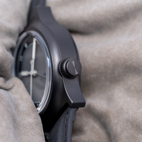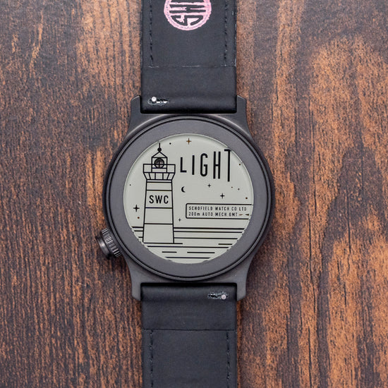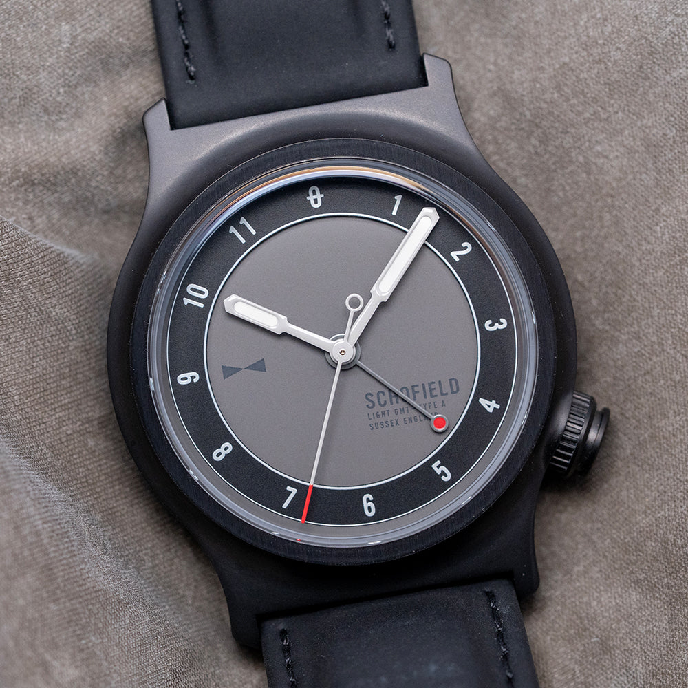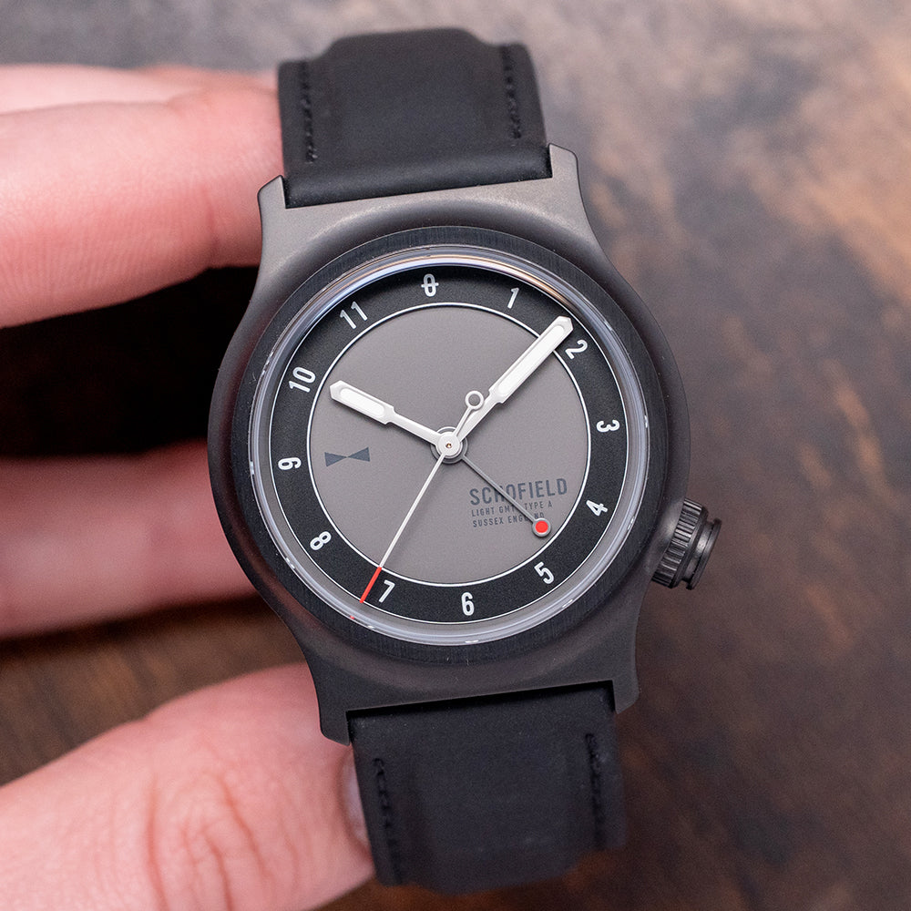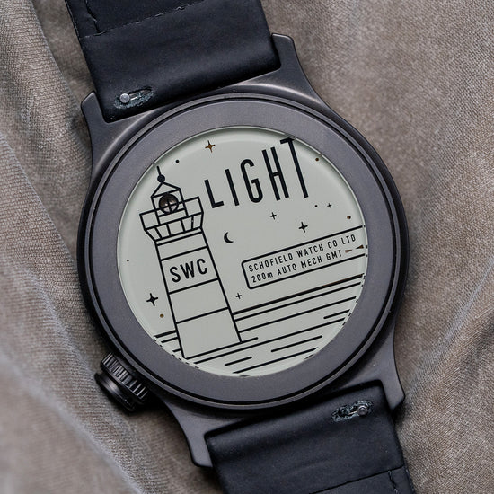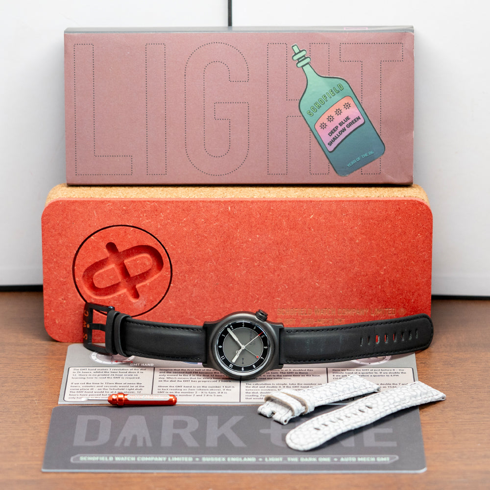 Here we have a 2024 Schofield Light "The Dark One" GMT Limited to 150 pieces, featuring a newly designed field watch housed in a curvaceous 40mm matte-finished black PVD-coated stainless steel case. This is the first time in 15 years that Giles has created a fresh case profile from the bottom up, featuring sweeping curves that lead to a lug-to-lug length of 48mm and a case thickness of 13.5mm, ensuring a comfortable fit. At 4 o’clock, we have a prominent stepped screw-down signed crown with deep knurling, sitting slightly recessed into the case. A smooth, vertically brushed bezel holds a box-shaped sapphire crystal above a black-and-grey stepped dial. The raised black ring has highly legible numerals and a new slashed zero; the pale grey hands are lacquered for a 3D effect, filled with Super-LumiNova C3 and complemented by a grey-tipped sweeping second hand; a grey GMT hand matches the lower grey level, tipped with a grey lollipop. At 4 o’clock, text in a colouring matching font “Schofield Light GMT- Type A Sussex England”, and at 9 o’clock, the Schofield motif completes this versatile adventurer travelling companion. The screw-down case back lighthouse design is printed on the inside of a mineral crystal. Transparent elements reveal the shiny metallic movement underneath, catching the light, an automatic Seiko Cal. NH34A, 24 jewels, beating at 21,600 beats per hour, to adjust the GMT hand, pull the crown out one position and turn clockwise. It comes paired with two quick-release 22mm Schofield straps and a signed buckle. The watch comes with its Schofield presentation box and paperwork.