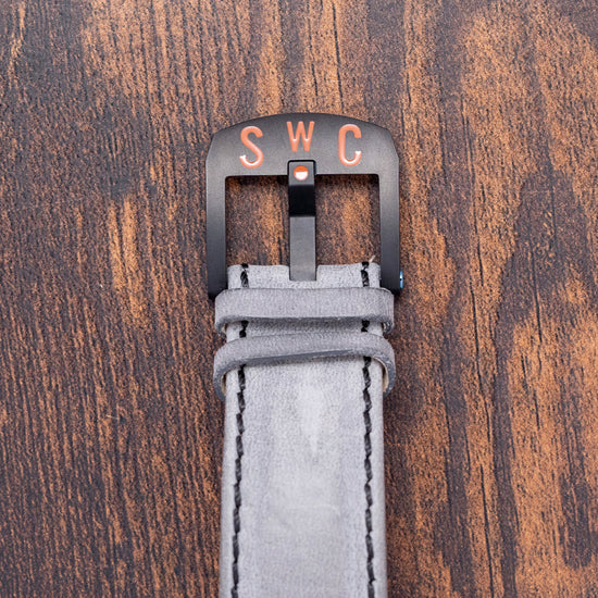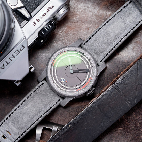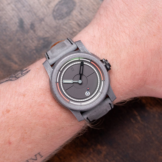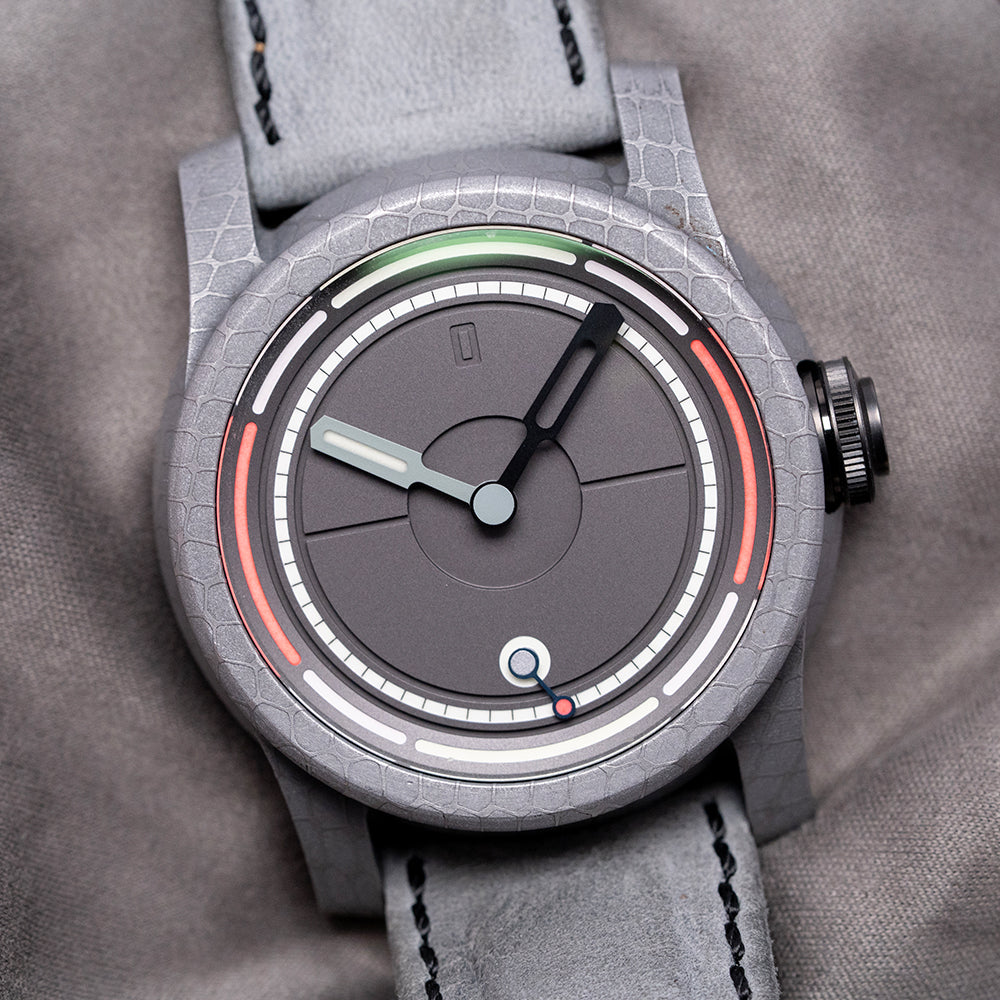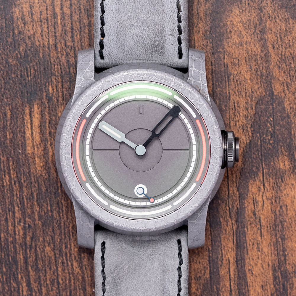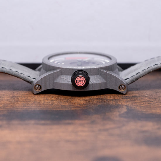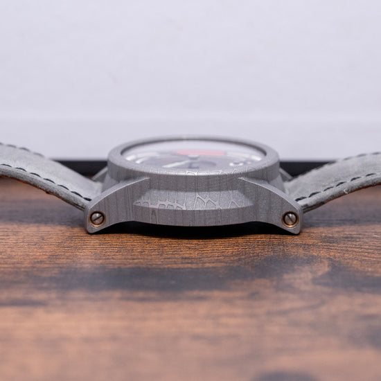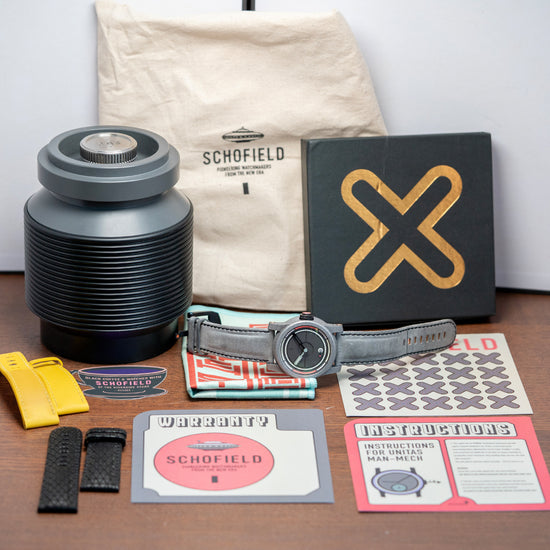 Here we have an incredible 2024 Schofield Obscura Damascus Steel Limited Edition of 40 pieces. Featuring a 44mm Damascus steel case made in the USA using heavy Nazel hammers to smash together the different steels to create its unique cellular pattern. Its traditional Schofield sculpted case shape is inspired by the powerful light used in a lighthouse, acid-etched to give that spectacular finish. The high-stepped flanks lead to angled, screwed thick lugs and a comfortable lug-to-lug length of 52mm, with a case thickness of 15mm, giving the watch an impressive wrist presence. At 3 o’clock, a black DLC-coated push/pull signed Double o-ring crown with a fine knurling for grip and a pink Super-LumiNova cap. The recessed double-dome sapphire crystal is AR-coated and sits above a stunning three-layer dark grey rhodium-plated dial. An upper layer features segments in two colours of Super-LumiNova above a minute track, and thirdly, a deep channel runs around and through the middle section, splitting it in half, with the characteristic deep-engraved zero at 12 o’clock. The hands are in two colours, with the minute hand skeletonised and the hour hand lumed; just for fun, when they align at 12 o’clock, the lume shows through the minute hand. Its seconds subdial is coloured white with a blue hand and red lollipop, a symbolic nod to its British manufacture. On the reverse, a DLC-coated screw-down case back with the details of the watch and a font of obscure ancient language, semaphore flag positions for N and D, the Schofield brand name and in the centre three grey PVD-coated sapphire domes that magnify sections of the Unitas movement underneath, their triangular formation is commonly seen in Sci-Fi and often described as UFOs, both subjects Giles is passionate about. Inside a manually wound Unitas Cal. 6498-2, 17 jewels, beating at 21,600 beats per hour. It comes paired with two 24mm Schofield straps and one pin buckle, plus a custom 24mm yellow strap. This watch is sold with its original Schofield obscure canister-shaped box, accessories and paperwork.