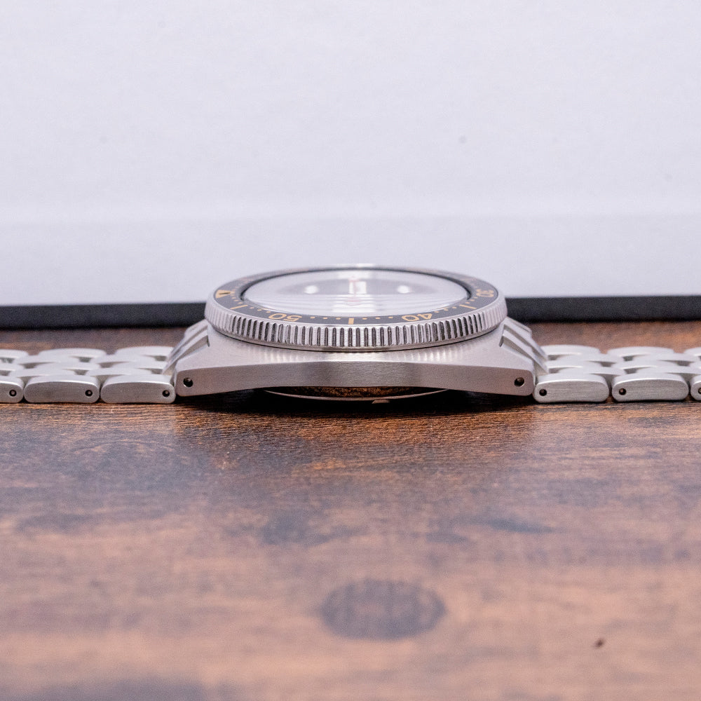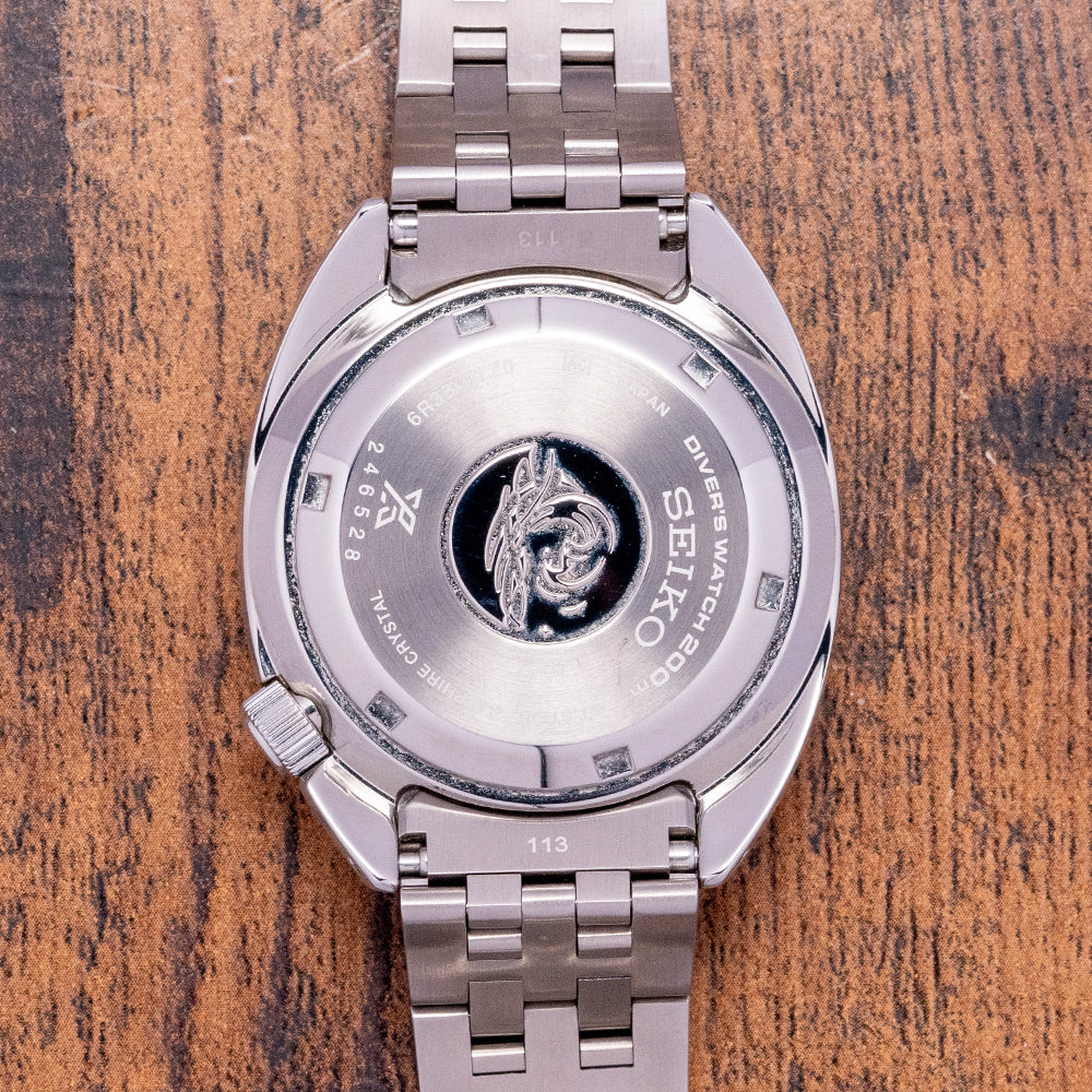 Here we have a 2024 Seiko Heritage Turtle 1968 Re-Interpretation SPB315J1, made to celebrate the anniversary of the 1968 Seiko ref: 6105-8009 “Professional” dive watches, designed to be robust with a recessed signed crown, which Seiko called “anti-snag” at 4 o’clock, introduced in 1968 as a replacement for the 62MAS. A brushed 41mm stainless steel C-shaped case, nicknamed the “Turtle” resembling a Sea Turtle shell, curves over your wrist with drilled lugs, a lug-to-lug length of 46.5mm, and a case thickness of 12mm give the watch an impressive wrist presence. The case and bracelet are coated in Diashield, a Seiko proprietary material, which gives the watch resilience to scratches and scuffs. Sitting like a cushion, Seiko gets wrist ergonomics so right on their dive watches. Down the right side at 4 o’clock, a screw-down crown sits recessed into the case for protection and a seamless profile; a unidirectional stainless steel bezel has a black 60-minute insert with gold-toned numerals holding a domed sapphire crystal AR coated on the inside above a matte black dial. A gold-toned outer minute track has applied gold-toned baton indexes liberally coated in LumiBrite, giving them dimension to mark the hours; between the 4 and 5 is a colour-matched date window, thick gold-toned sword hands are infilled with the same luminance complemented by a traffic light red and white counterweighted sweeping second hand. At 12 o’clock, we have the gold-toned Seiko motif, and at 6 o’clock, the gold-toned Prospex logo and “Automatic Divers 200m” are printed underneath, completing this vintage-inspired dive tool watch. On the reverse, a screw-down case back with the Seiko Tsunami in the centre, inside an automatic Seiko 6R35, 24 jewels, 21,600 beats per hour. The watch comes paired with its 20mm Seiko 5-link brushed stainless steel bracelet secured by a fliplock three-fold clasp, all links are provided, and the watch comes with its Seiko presentation box, swing tag and paperwork.