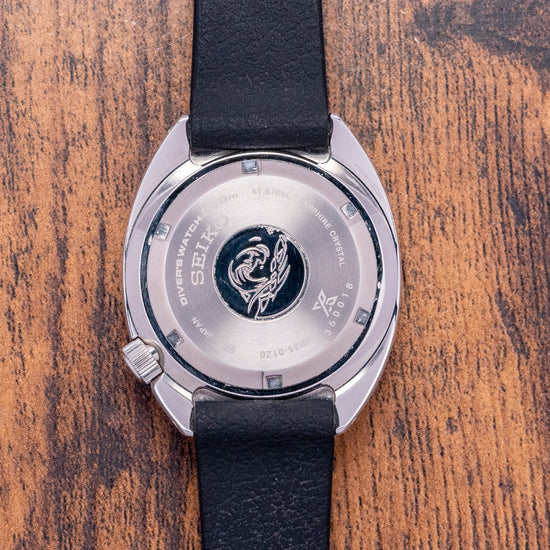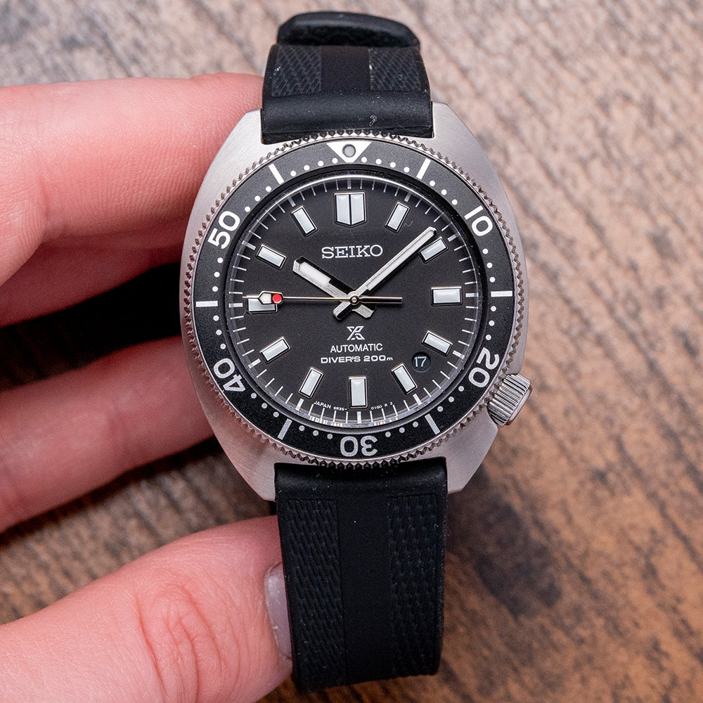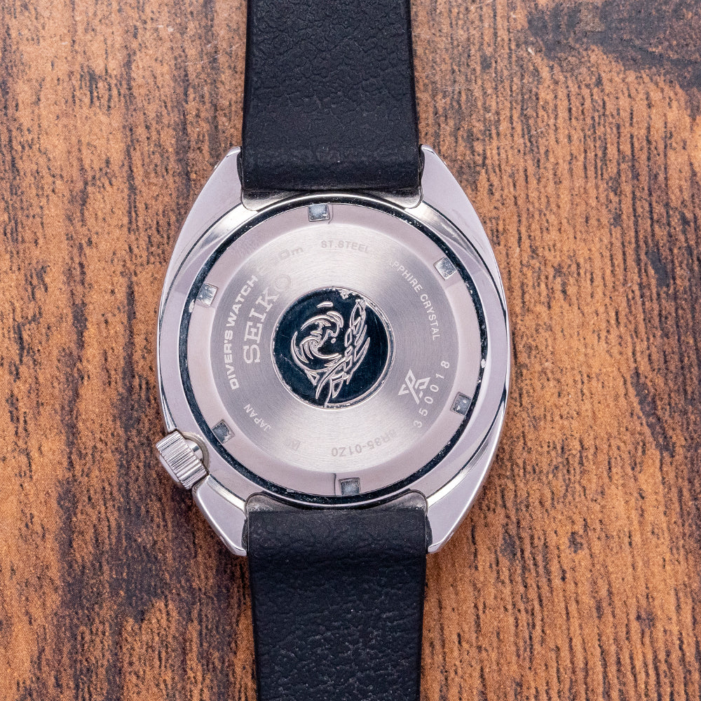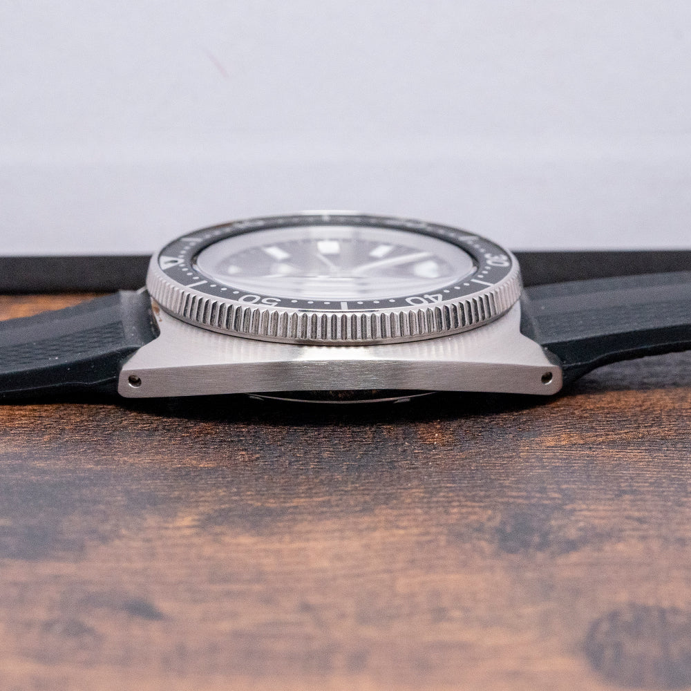 Here we have a 2024 Seiko Heritage Turtle 1968 Re-Interpretation SPB317J1, made to celebrate the anniversary of the 1968 Seiko ref: 6105-8009 “Professional” dive watches, designed to be robust with a recessed signed crown, which Seiko called “anti-snag” at 4 o’clock, introduced in 1968 as a replacement for the 62MAS. A brushed 41mm stainless steel C-shaped case, nicknamed the “Turtle” resembling a Sea Turtle shell, curves over your wrist with drilled lugs, a lug-to-lug length of 47mm, and a case thickness of 12mm give the watch an impressive wrist presence. The case and bracelet are coated in Diashield, a Seiko proprietary material, which gives the watch resilience to scratches and scuffs. Sitting like a cushion, Seiko gets wrist ergonomics so right on their dive watches. Down the right side at 4 o’clock, a screw-down crown sits recessed into the case for protection and a seamless profile; a unidirectional stainless steel bezel has a black 60-minute insert with silver numerals holding a domed sapphire crystal AR coated on the inside above a matte black dial. An outer minute track has applied steel baton indexes liberally filled in LumiBrite, giving them dimension to mark the hours; between the 4 and 5 is a colour-matched date window, and thick steel sword hands are infilled with the same luminance complemented by a traffic light red and white counterweighted sweeping second hand. At 12 o’clock, we have the Seiko motif, and at 6 o’clock, the Prospex logo and “Automatic Divers 200m” are printed underneath, completing this vintage-inspired dive tool watch. On the reverse, a screw-down case back with the Seiko Tsunami in the centre, inside an automatic Seiko 6R35, 24 jewels, 21,600 beats per hour. The watch comes paired with its 20mm Seiko black silicone strap, and the watch comes with its Seiko presentation box, swing tag and paperwork.
