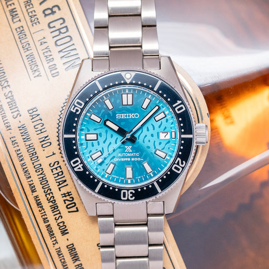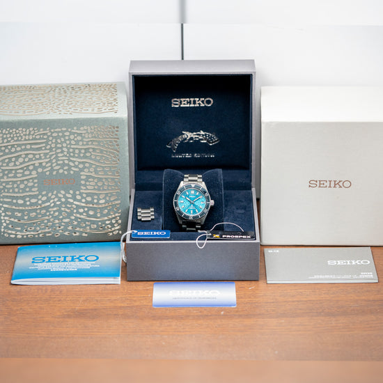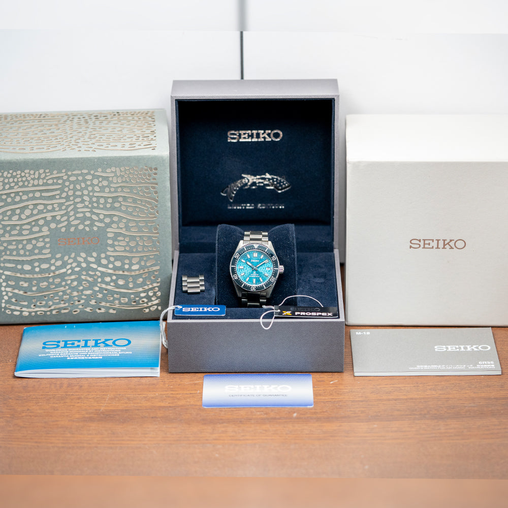 Here we have the distinctive 2024 Seiko Prospex Zimbe #19 Thailand SPB443J1 Limited Edition of 500 Pieces. This is the ‘last exclusive’ Zimbe collection to be offered by Seiko Thailand. Featuring a brushed and polished 40.5mm stainless steel ‘62MAS’ case that comfortably sits on your wrist, thanks to the fat-ended drilled lugs. Its curved, polished, chamfered-edged flanks lead to a lug-to-lug length of 47.5mm and a case thickness of 13mm. On the right side, a screw-down coin-edged crown. A coin-edged, polished unidirectional bezel features a metallic blue 60-minute dive insert coated in LumiBrite. The domed sapphire crystal, AR-coated on the inside, sits above an incredible sunburst whale shark-skin patterned blue dial. An outer minute chapter ring surrounds applied baton indexes filled with LumiBrite, marking the hours, at 3 o’clock, a date window. Steel hands filled with LumiBrite are complemented by a blue sweeping second hand. At noon, we have the Seiko motif, and at 6 o’clock, the Prospex logo, ‘Automatic Divers 200m’ completes this exclusive, versatile sports dive watch. On the reverse, a screw-down solid case back, etched with the details and Zimbe #19 Limited number surrounding an embossed Seiko Tsunami in the centre. Inside an automatic Seiko Cal. 6R35, 24 jewels, 21,600 beats per hour. It comes paired with its 20mm brushed 3-link stainless steel bracelet secured by a three-fold flip-lock clasp; all links are provided.