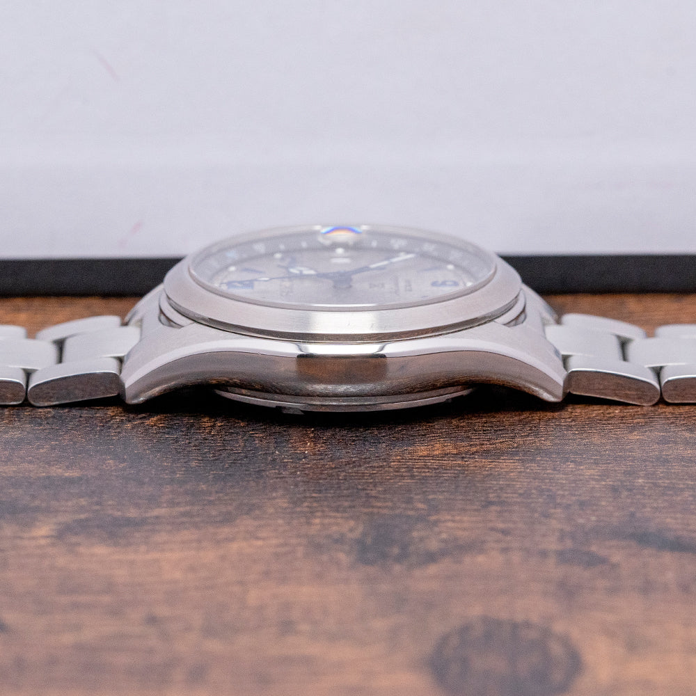 When it comes to modern Seiko and references, there really aren't many that come as close to fame as the Alpinist. Seiko introduced the Alpinist in 1961 under their sub-brand of Laurel, which is Seiko's oldest sub-brand, first seen in 1913. It was inspired by the Yama-Otoko Japanese for Mountain. These men required equipment to be robust and accurate as they led many expeditions. Seiko reintroduced the Alpinist in 1995 after a 30-year gap. The SPB355J1 was introduced in 2022, incorporating many of the features of the previous generations and was only available in Europe. A 2024 Seiko 'Rock Face' European 'Alpinist' SPB355J1 Limited to 1498/3000 pieces. A satin-brushed 39.5mm stainless steel case with tapering lugs, and polished and brushed flanks leads to a lug-to-lug length of 46mm and a thickness of 13.5mm, ensuring a comfortable fit on your wrist. On the right side, we have a screw-down crown with crown guards, and at 4 o’clock, a second crown is used to adjust the rotating inner compass bezel. A stepped smooth brushed bezel holds a flat scratch-resistant sapphire crystal AR coated on the inside. An outer rotating compass chapter ring encircles the striking textured silver dial. An outer minute track is precisely executed with LumiBrite pips. Attractive contrasting applied blue Arabic numerals with alternating dagger indexes mark the hours. At 3 o’clock, there is a date window with Cyclops magnification on the sapphire crystal. Elegant LumiBrite-filled cathedral hands are complemented by a fine blue centre-seconds hand with a lume tip. Giving the watch a vintage look and feel. On the reverse, there is a screw-down exhibition case back, inside an automatic Seiko 6R35, 24 jewels, 21,600 beats per hour. It is paired with a Seiko 20mm stainless steel bracelet secured by a signed folding clasp, plus the original two Seiko 20mm straps in the box. It also comes with a Seiko presentation box and papers.