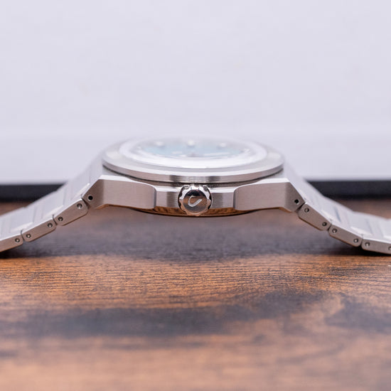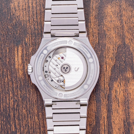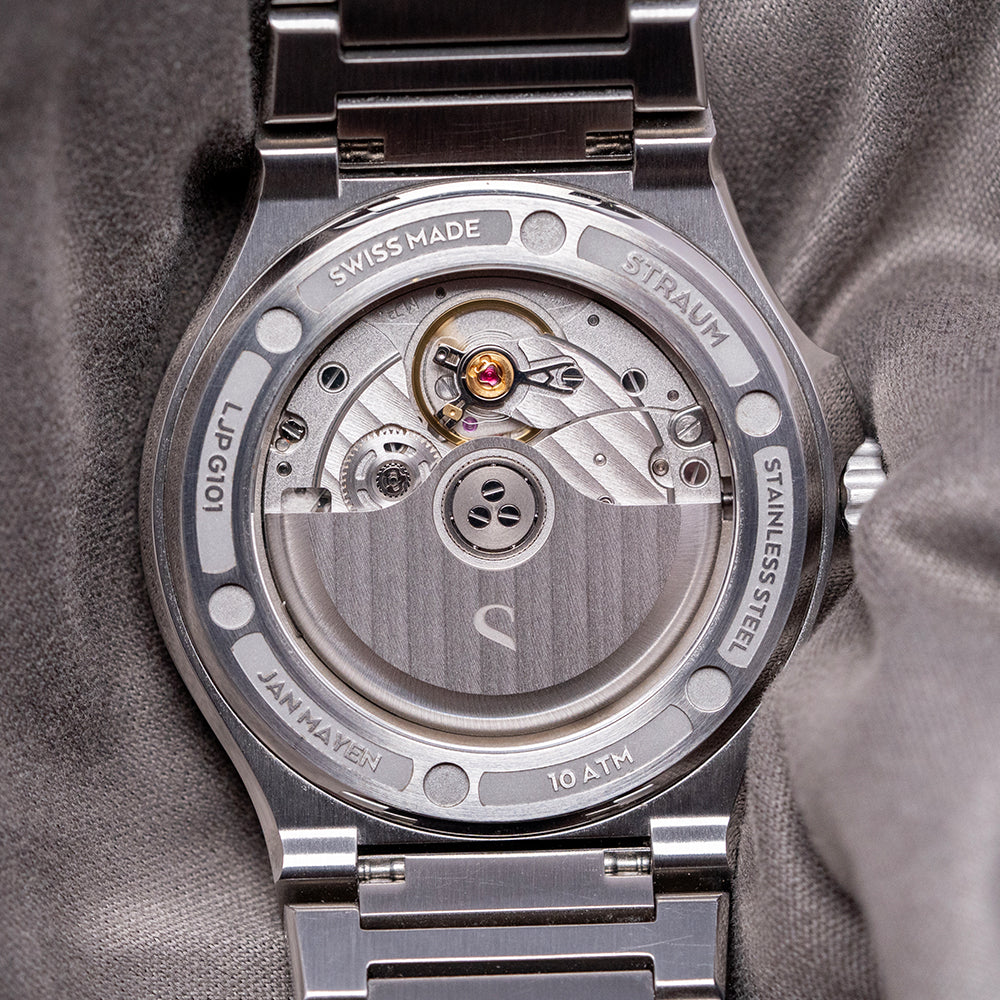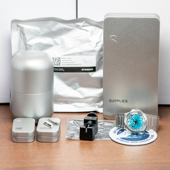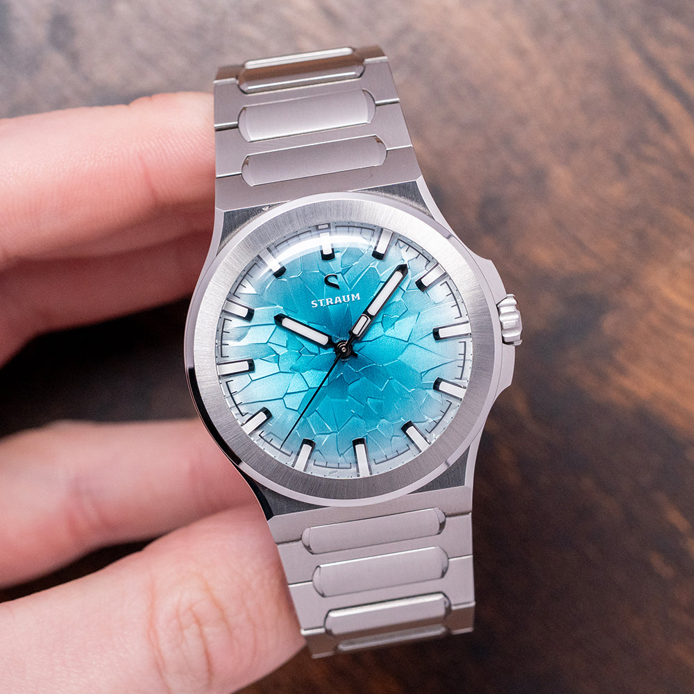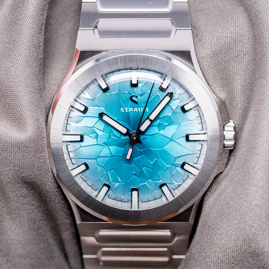 Here, we have a charismatic 2024 Straum Jan Mayen Glacial Rift Limited Edition 1 of 100 pieces. Its sculpted 39mm brushed and polished 316L stainless steel tonneau-shaped case comfortably curves over your wrist, thanks to the flowing integrated bracelet and drilled lugs. A polished chamfered edge leads to a lug-to-lug length of 45.5mm and a case thickness of 11mm, giving an impressive wrist presence. On the right side is a signed screw-down crown with deep knurling protected by crown guards. The polished and brushed smooth bezel features a sunburst-brushed top surface, holding a double-domed sapphire crystal with an AR coating on the inside, which draws the eyes toward the incredible Jan Mayen Glacial Rift dial. The dial is inspired by the inner sanctum of the constantly moving glacier on the Jan Mayen Norwegian volcanic island in the Arctic Ocean, with its blue hues, facets, and fissures. It is designed using the latest CAD design and CNC tooling to create an inverted fumé multi-layered lacquered texture, coated with a shiny top coat to achieve a glass-like finish. An outer minute track intersects with black outlined baton indexes coated in Super-LumiNova BGW9, marking the hours. Diamond-cut hands are filled with the same lume and complemented by a tapered sweeping second hand. The Straum motif can be found at 12 o’clock, completing the nature-inspired fiery sports watch. On the reverse, a screw-down sapphire exhibition case back with the details of the watch around its edge, inside an automatic La Joux-Perret Cal. G101, 24 jewels, beating at 28,800 beats per hour. La Joux-Perret designed and manufactured this quality movement in La Chaux-de-Fonds, Switzerland. It is paired with its 24mm integrated brushed 316L stainless steel bracelet secured by a push-button signed concealed butterfly clasp and strap adapters. It is sold with its original Straum presentation box, accessories, and paperwork.