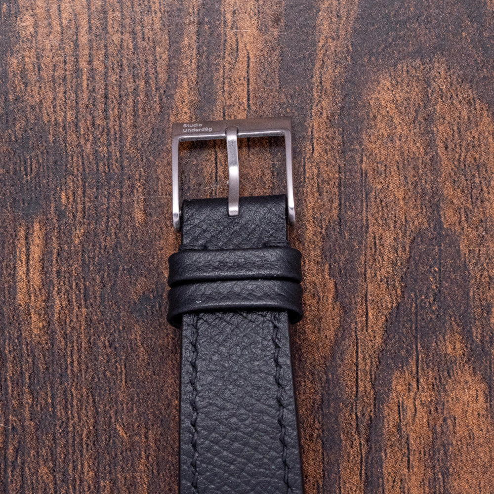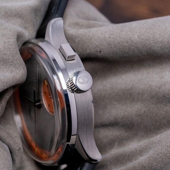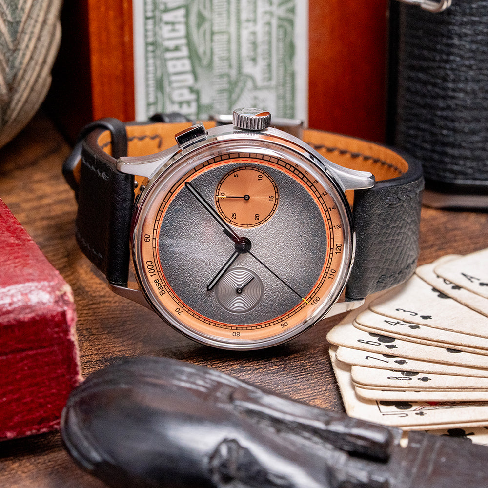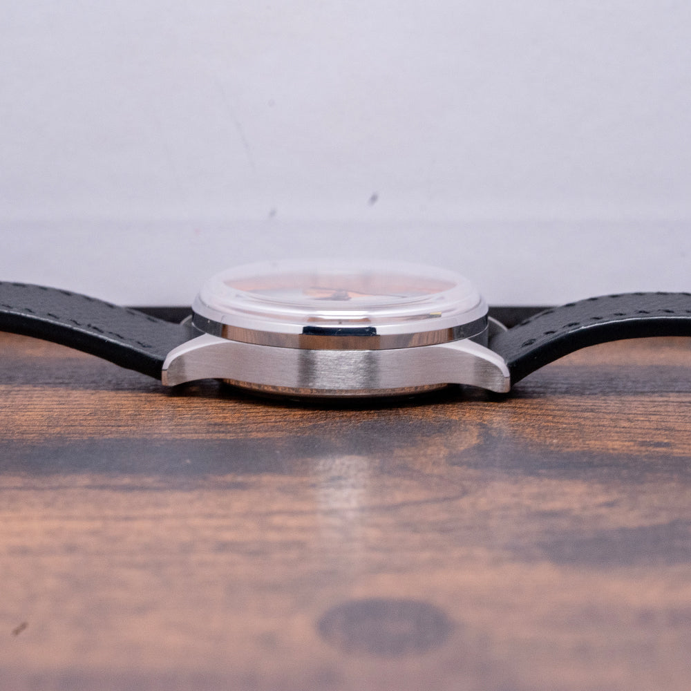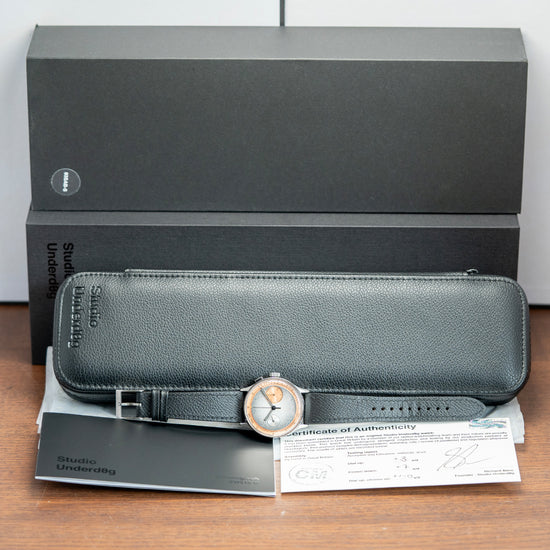 Here we have a 2024 Studio Underd0g 3 Series Smoked Salm0n inspired by the Japanese delicacy, salmon fillet sushi. Its curvaceous 38.5mm brushed and polished stainless steel case curves over your wrist with tapered lugs. A polished chamfered edge along its flanks leads to a lug-to-lug length of 44.5mm and a case thickness of 13.5mm, ensuring a comfortable fit. Down the right side, we have the single chronograph monopusher and a signed coin-edged crown in the centre. The bevel-edged stepped polished smooth bezel holds a double-domed sapphire crystal above the striking characteristic colourful dial. It is made up of two layers: a smooth metallic smoke salmon pink base layer and a coarse-textured gradient grey centre layer that transitions from a pale grey in the centre to a darker grey outer edge, emulating the skin of the salmon. The hour indexes are black pips; at 3 o’clock, a large 30-minute register is made up of sunburst pink and a black stick hand; at 9 o’clock, the small second register is in grey with a concentric circular pattern. The slender sword hands are filled with Super-LumiNova C3, complemented by a pink-tipped chronograph hand. On the reverse, a screw-down exhibition case back features the watch’s details engraved around its edge. Inside, a manually wound Sellita SW510 M, 23 jewels, beating at 28,800 beats per hour, this single pusher cam-operated chronograph is an Elaboré grade and decorated with Côtes de Genève. It comes paired with its 20mm StrapTailor quick-release leather strap and pin buckle. This watch is sold with its original Studio Underd0g box, travel pouch and paperwork.
