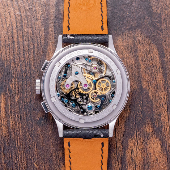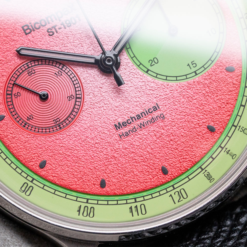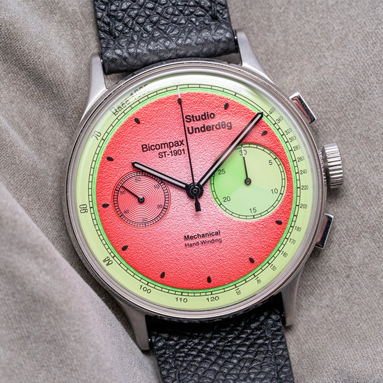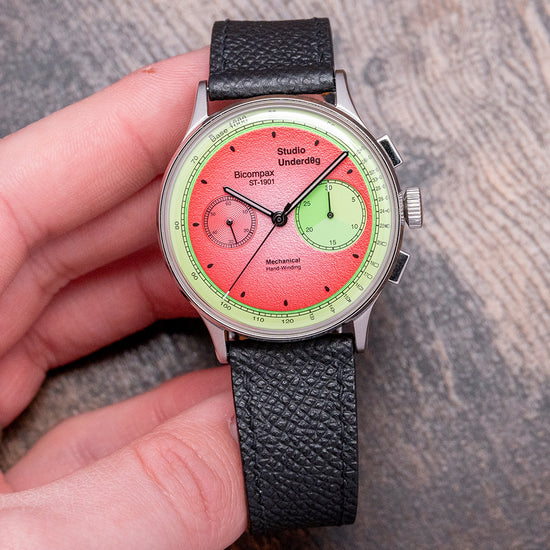 Here we have a 2024 Studio Underd0g Watermel0n, which is now assembled in Great Britain with a 38.5mm brushed stainless steel case. The elegant tapered curved lugs have a lug-to-lug length of 44.5mm and a case thickness of 13.5mm, giving the watch an impressive wrist presence. We have the signed crown and the polished chronograph pushers on the right side. The bevel-edged stepped polished smooth bezel holds a double-domed sapphire crystal above the striking characteristic colourful dial. Made up of 2 layers: a satin sandblasted base layer and a coarse-textured soft pink centre layer that graduates from a pale pink in the centre to a darker pink outer edge. An outer Tachymetre is precisely printed against the pale green-coloured layer. The hour indexes are an attractive black melon seed shape; at 3 o’clock, a large 30-minute register made up of varied hues of green-coloured segments and a pale green-tipped hand; at 9 o’clock, the small second register in pink with a concentric circular pattern. The slender sword hands are filled with Super-LumiNova, complemented by a green-tipped chronograph hand. Text is precisely applied with the bold Studio Underd0g motif sitting proudly off-centre. The combination of colour and textures makes this Bi-Compax a pleasure to wear. On the reverse is a screw-down exhibition sapphire crystal case back, inside a manually wound Seagull ST-1901 is a true workhorse of a movement that uses the technical drawings of the Swiss Venus calibre 175 but is made in China. Its simplicity in decoration adds interest both front and back to this watch. The watch comes fitted on its original 20mm Strap Tailor leather strap and signed pin buckle and comes with its Studio Underd0g presentation box and papers.