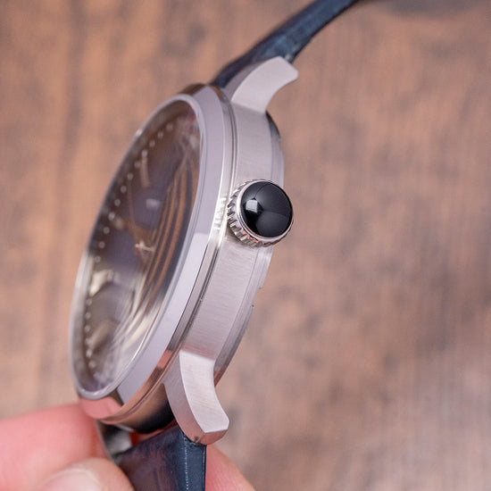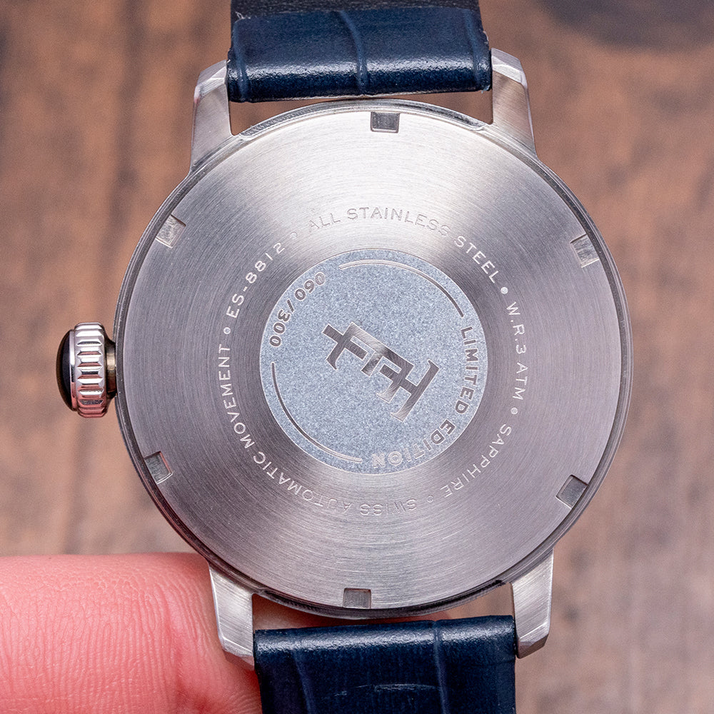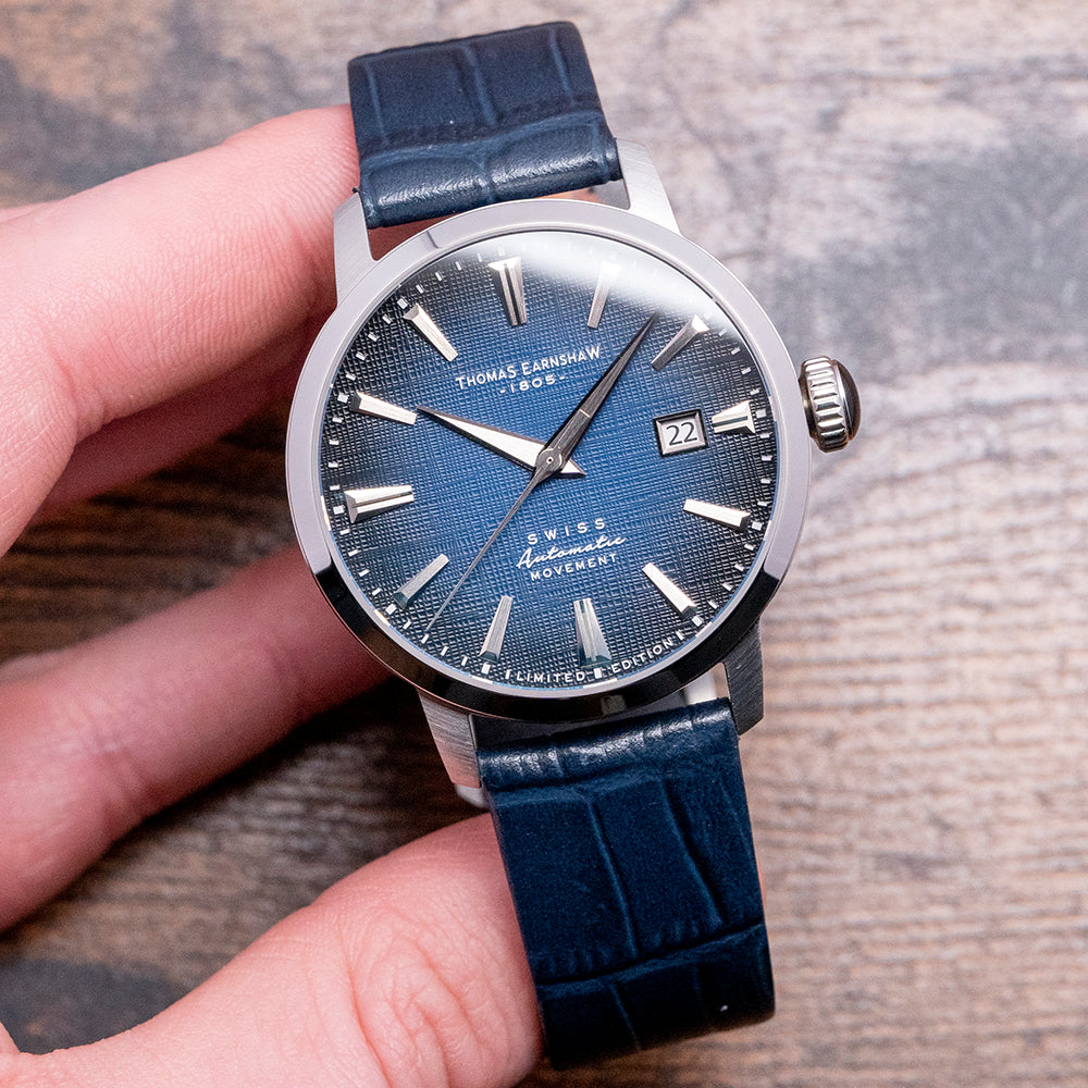 Here, we have an unworn 2024 Thomas Earnshaw Echelon Fumèe Blue Limited 060/300 pieces. The polished and brushed 40.5mm stainless steel case elegantly curves over your wrist with tapered lugs. A lug-to-lug length of 47.5mm and a case thickness of 11mm give the watch an impressive wrist presence. On the right side is a crown with deep knurling for grip and an attractive cabochon dome. A smooth polished bezel holds a flat crystal above a stunning fumée blue textured dial. An outer minute track surrounds steel applied facet brushed and polished sloping dagger indexes that catch the light as you rotate your wrist; at 3 o’clock, a framed date window, elegant Dauphine hands have polished razor edges and brushed surfaces and are complemented by tapered second-hand. At 12 o’clock, we have the Thomas Earnshaw 1805 motif. At 6 o’clock “Swiss Automatic Movement” and on the bottom edge “Limited Edition”. On the reverse, a solid case back, inside an Automatic Ronda Cal. R150, 25 jewels, beating at 28,800 beats per hour, with hand winding and hacking seconds. It comes paired with its 20mm blue leather strap and pin buckle. The watch is sold with its Thomas Earnshaw presentation box and Unsigned paperwork.