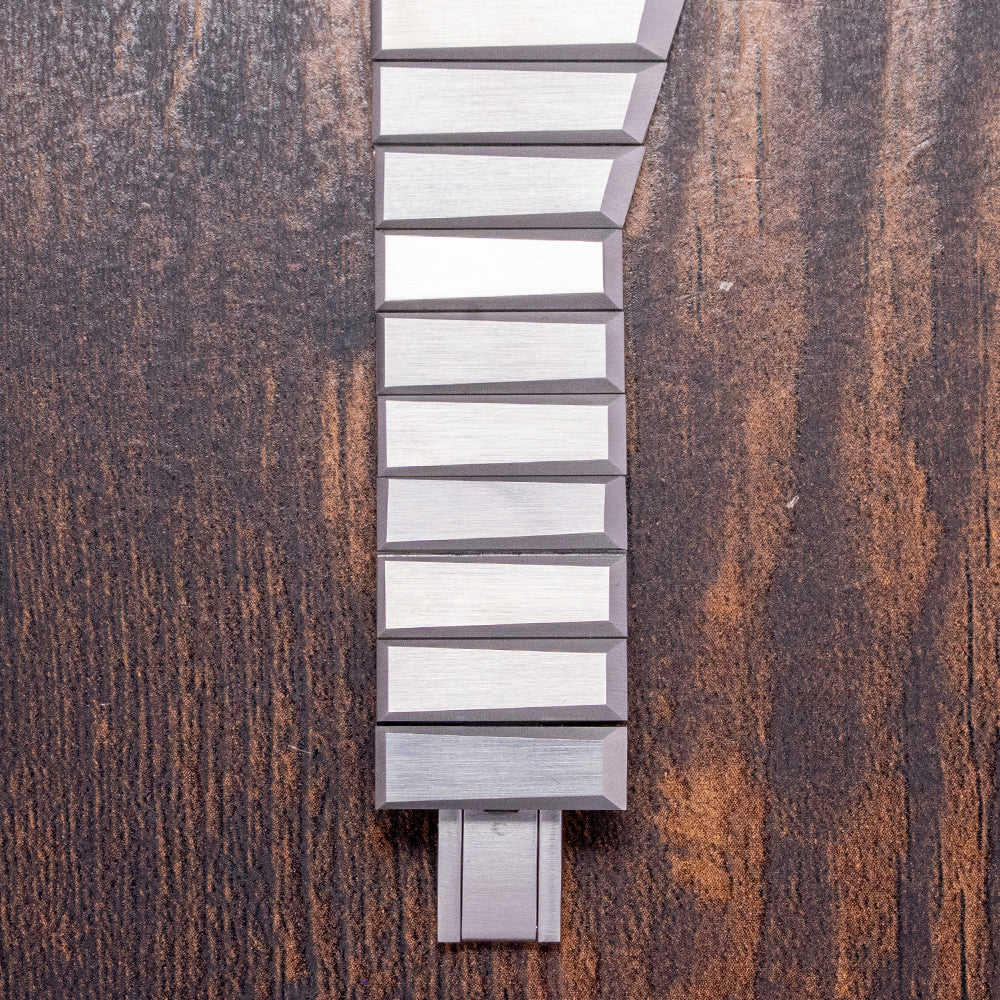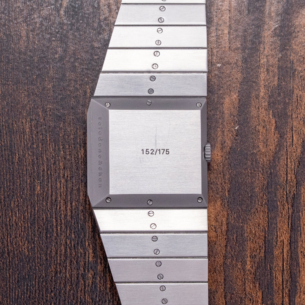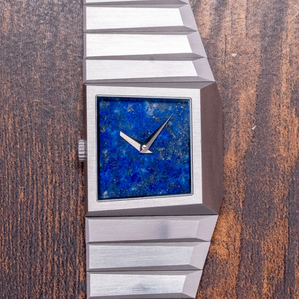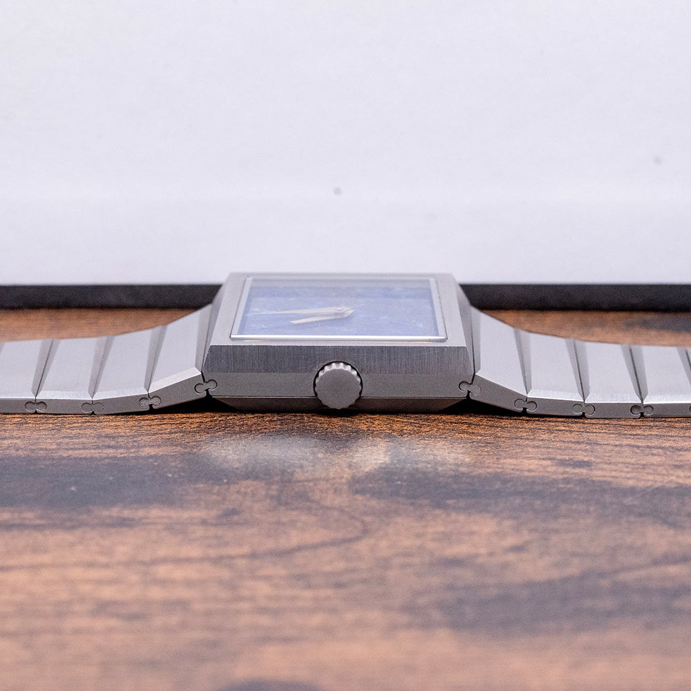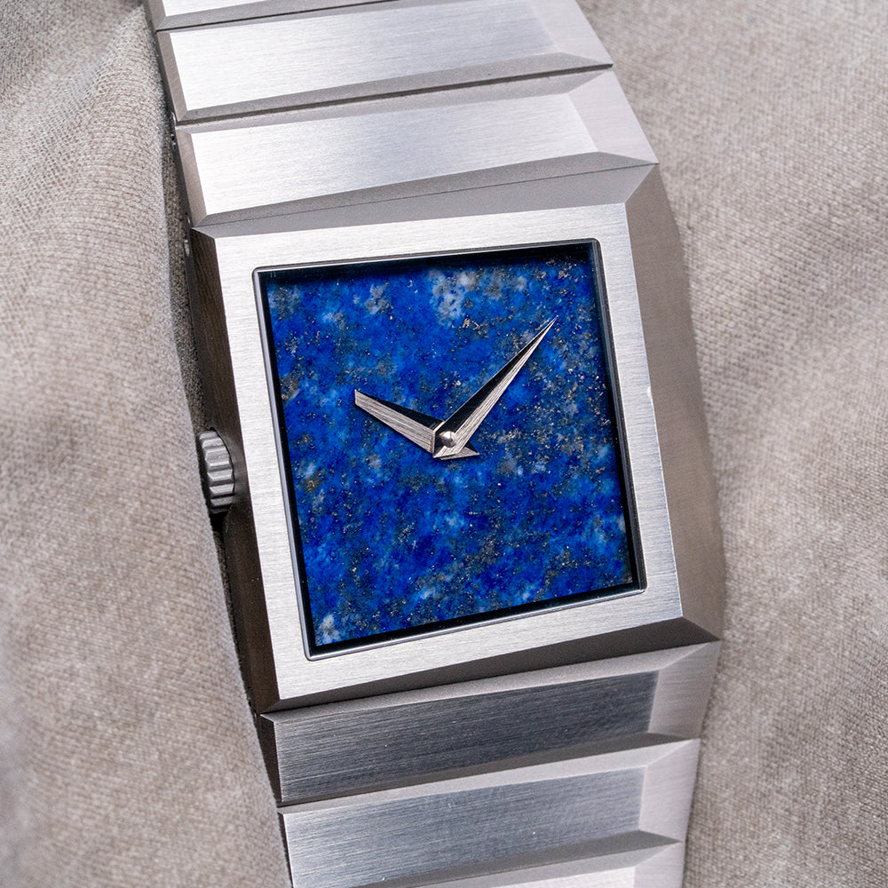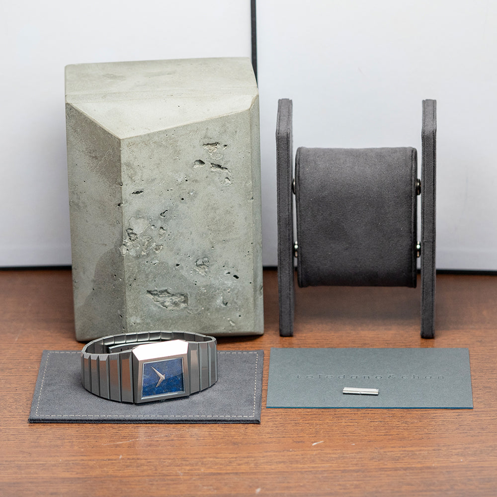 Here we have a 2024 Toledano & Chan B/1 Blue Lapis Dial automatic limited to 175 pieces. This watch features a 33.5mm horizontally brushed 904L stainless steel case with sharp-edged angles and a geometric, asymmetric design. Inspired by the distinctive lines of the Rolex King Midas but with a brutalist twist. Its unique, seamless integrated profile leads to a lug-to-lug length of 32mm and a case thickness of 10.5mm, giving the watch an impressive wrist presence. On the left side, we have a coin-edged crown. The slim bezel holds a flat sapphire crystal above a stunning blue Lapis sterile dial. Elegant ‘tanto’ blades, sharp-edged hands sit majestically in the centre, the spectacular stone dial shimmers in the light as you rotate your wrist. On the reverse, a sharp-angled, solid brushed case back, deeply engraved with Toledano & Chan and 175 in the centre. Inside an automatic Sellita Cal. SW100, 25 jewels, beating at 28,800 beats per hour. It comes paired with its integrated 32mm brushed geometric shape 904L stainless steel bracelet secured by a concealed deployant clasp; all links are provided. This watch is sold with its original Toledano & Chan brutalist-inspired concrete presentation box and card.