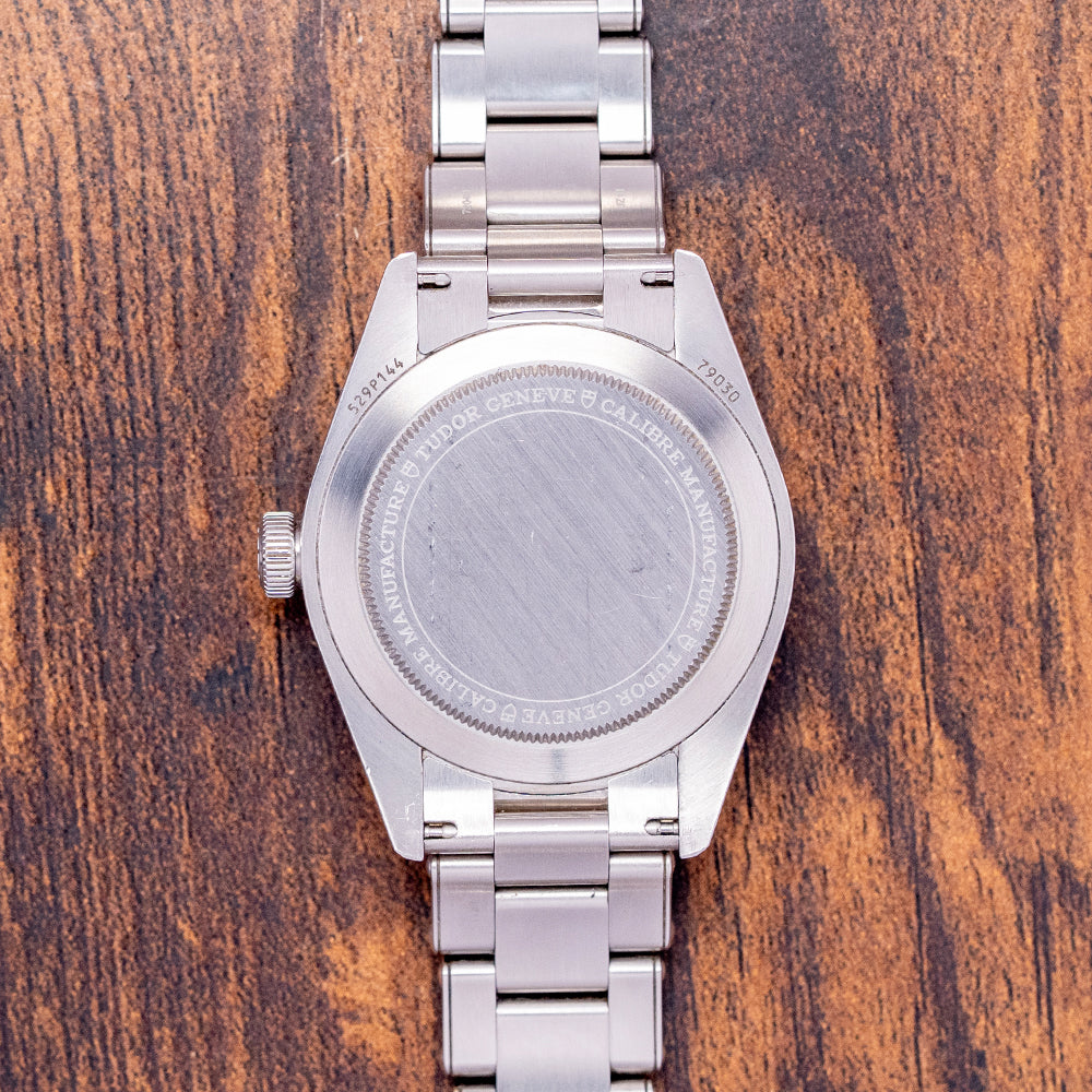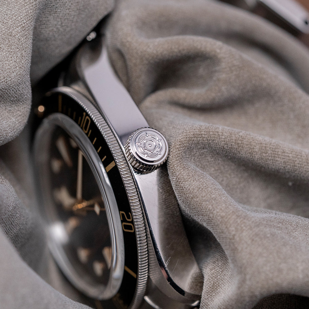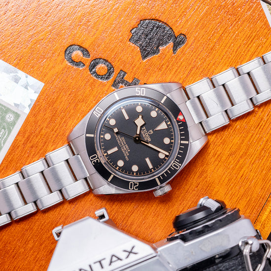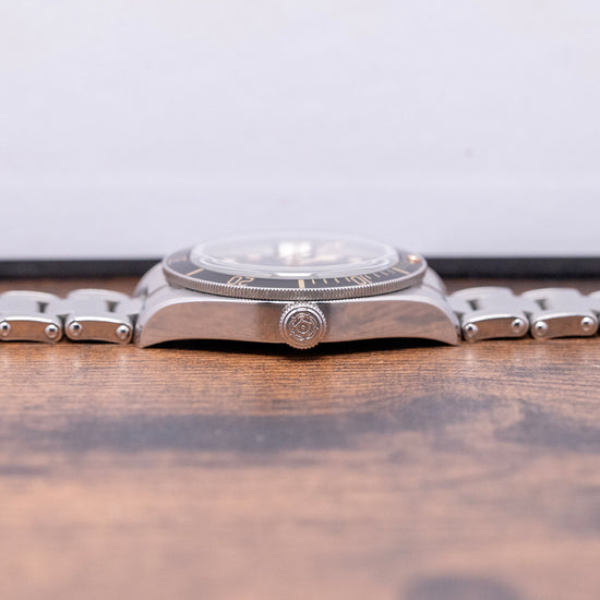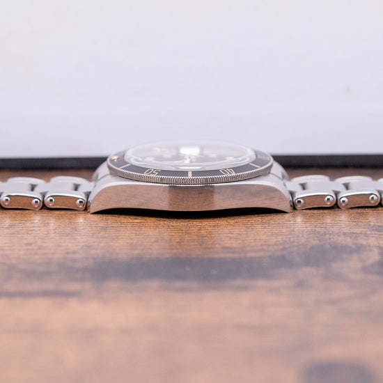 Here we have a 2024 Tudor Black Bay 58 Black on a Bracelet 79030N that pays tribute to their first divers; introduced in 1958, the Ref 7924 had a 39mm case and a big crown that achieved 200m water resistance, which was some achievement back then. A 39mm stainless steel case with polished and satin finishes, the curve of the case tapers towards the lugs with a lug-to-lug length of 47.5mm and a case thickness of 12mm, giving the watch an impressive wrist presence. On the right side is a screw-down signed crown, a unidirectional dive bezel with 60-minute numerals on a matte black aluminium insert, and at 12 o’clock, the characteristic red inverted triangle and lume pip. A domed sapphire crystal AR-coated protects a matte black dial; a gold-toned minute track is precisely executed, with applied gold-toned disc and baton hour markers coated in Super-LumiNova; and gold-toned Snowflake hands are coated in Super-LumiNova, complemented by a gold-toned Snowflake counterbalance sweeping second hand. The warm tones of the dial, indexes and hands add a vintage aesthetic to this distinctive dive watch. On the reverse, a coin-edged screw-down case back. Inside, their in-house automatic Calibre MT5402 (COSC) Certified Chronometer, 25 jewels, 28,800 beats per hour, and a bidirectional rotor system that provides a very impressive power reserve. It comes paired with its original full-size 20mm Tudor stainless steel Oyster simulated rivet-style bracelet, which uses screws to remove links; a signed deployment safety T-clasp with a glide lock system for on-the-fly adjustments and a clamshell lock; all links are included, plus a fitted Dassari black rubber strap and the watch comes with its Tudor presentation box, swing tag and paperwork.