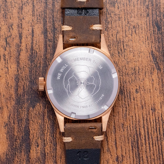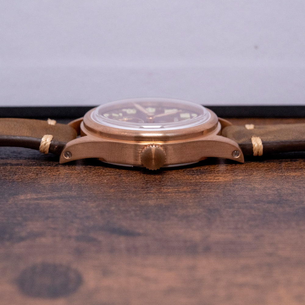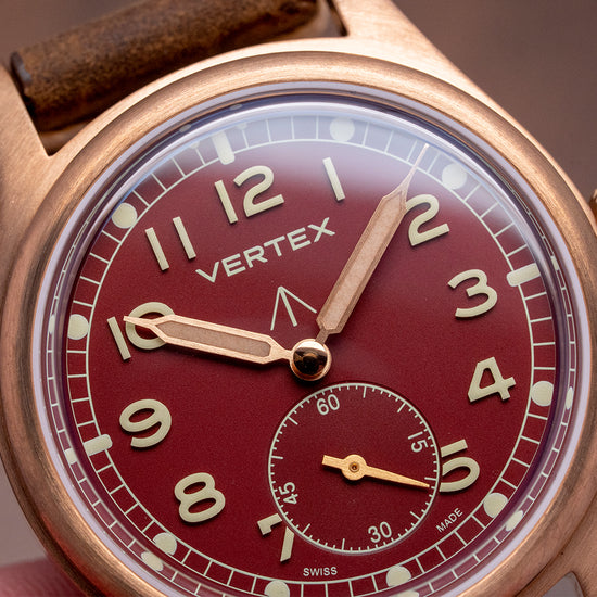 Here we have a 2024 Vertex M36 Armistice Day Red Dial Bronze Limited to 9 pieces, made to commemorate the 80th Anniversary of June 6, 1944, D-Day, a fitting tribute to the sacrifice many made during World War II, all proceeds from the original sale went to the Royal British Legion. The 36mm Bronze alloy case sits comfortably on your wrist thanks to the tapered screwed lugs. Its smooth curved flanks lead to a lug-to-lug length of 46.5mm and a case thickness of 11.5mm. On the right side is a coin-edged screw-down crown. The smooth domed bezel holds a double domed sapphire box-shaped crystal AR coated for that vintage aesthetic. Its distinctive burgundy dial has an outer minute track with X1 Super-LumiNova pips surrounding the characteristic moulded X1 Super-LumiNova Arabic numerals marking the hours; at 6 o’clock, we have a sub-seconds, rhodium syringe hands are filled with the same lume, at 12 o’clock in keeping with its military heritage there sits a Broad Arrow (pheon), the mark indicating British Government Issue property. On the reverse is a stainless steel screw-down case back engraved with “We Will Remember Them” and a poppy in the centre, Broad Arrow, and serial numbers. Inside an automatic Sellita Cal. SW261, 31 jewels, beating at 28,800 beats per hour; this movement has hacking seconds and hand winding for your convenience. It comes paired with an 18mm leather strap, a brown Vertex strap with a Bronze signed buckle, an additional bronze Vertex buckle and 2 18mm Vertex NATO straps; it comes in a custom tactical Peli case and paperwork.