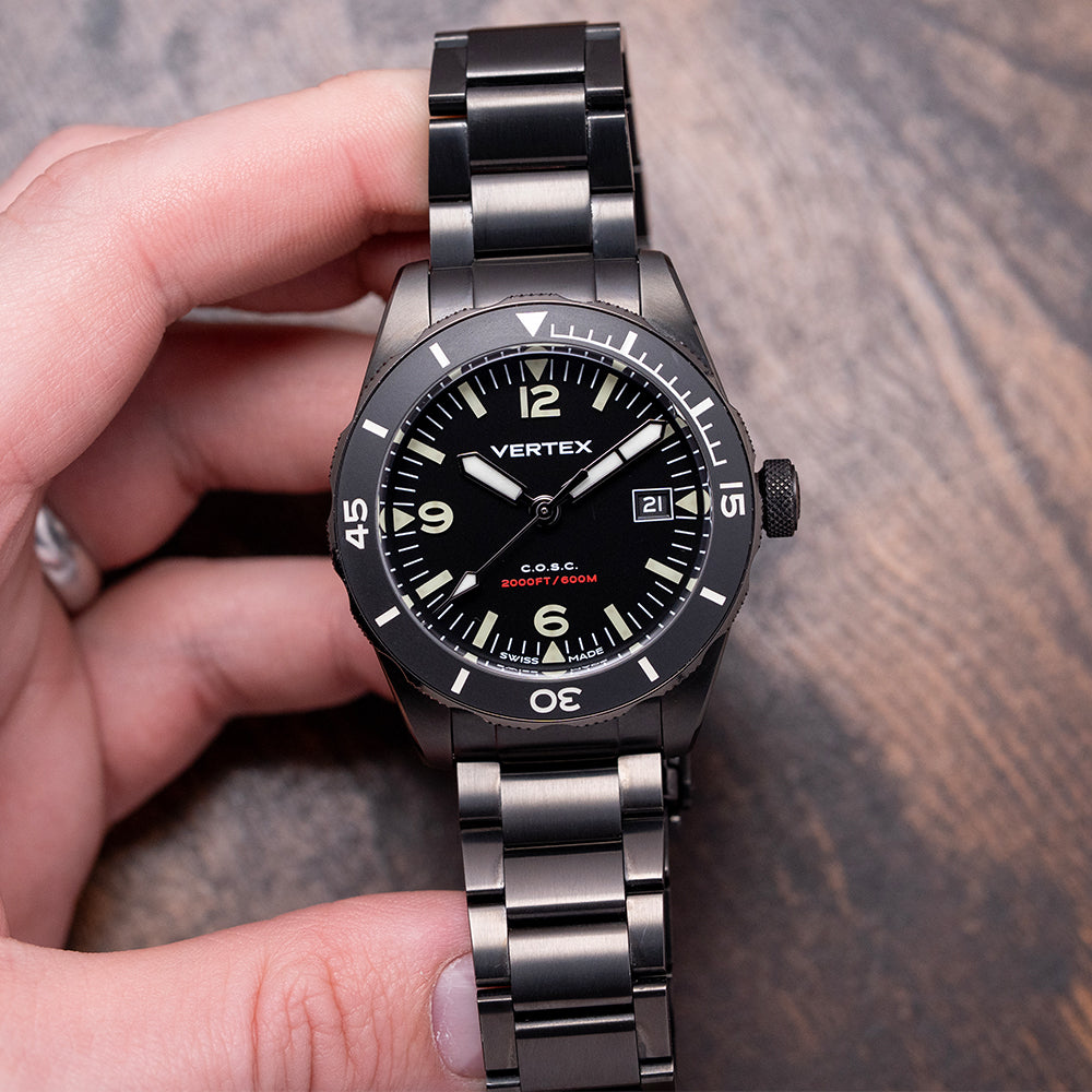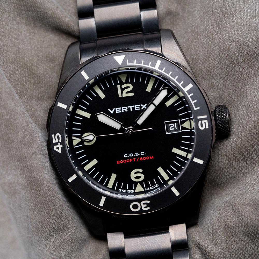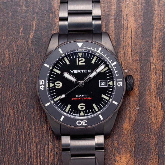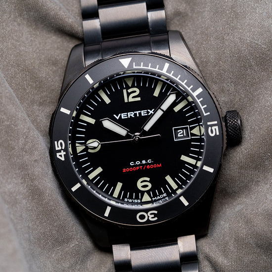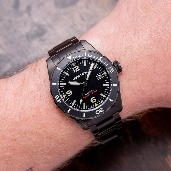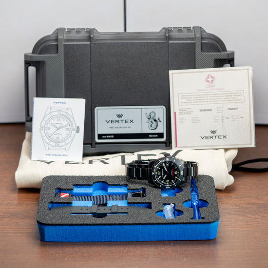 Here we have a 2022 Vertex M60C AquaLion No-Date, the C stands for Covert, with a brushed 40mm Black DLC (Diamond-like Carbon) stainless steel case for that stealthy aesthetic, that curves over your wrist with thick tapered lugs, Don has taken his inspiration from the Vertex dive watches of the 1950s and 60s and given them a more contemporary look and feel, using modern materials and technology, and a lug-to-lug length of 49mm and a case thickness of 14mm give the watch an impressive wrist presence. On the right side is a signed screw-down crown with knurling for extra grip. The watch has undergone rigorous tests to achieve ISO 6425 certification, which is no mean feat for any watch manufacturer. It shows that Vertex will go the extra mile to produce a tool watch worthy of that accreditation. A rotating dive bezel has a matte black ceramic insert, the first 15 minutes highlighted, all coated in Super-LumiNova Grade X1, holding a domed sapphire crystal above a matte black dial. An outer minute track has the characteristic moulded Super-LumiNova X1 batons, and 12, 6 and 9-hour markers as seen on the M100 series, steel sword hands are filled with Super-LumiNova X1 and complemented by a tapered sweeping second-hand. At noon, we have the Vertex motif, and at 6 o’clock, “C.O.S.C. 2000 FT/600 M” in red, complete this versatile dive tool watch with all the right credentials for any professional diver or adventurous skin diver. On the reverse, a screw-down case back with an engraved AquaLion Trademark in the centre, inside an automatic Sellita SW300-1, 25 jewels, beating at 28,800 beats per hour, COSC Certified, this workhorse movement has hacking seconds and hand winding for your convenience. It comes paired with its 20mm fitted Vertex quick-release brushed Black DLC (Diamond-like Carbon) stainless steel bracelet with a signed deployment clasp with fliplock; all links are provided, plus additional 20mm Vertex straps. The watch comes with its Vertex Peli Case, accessories and paperwork.