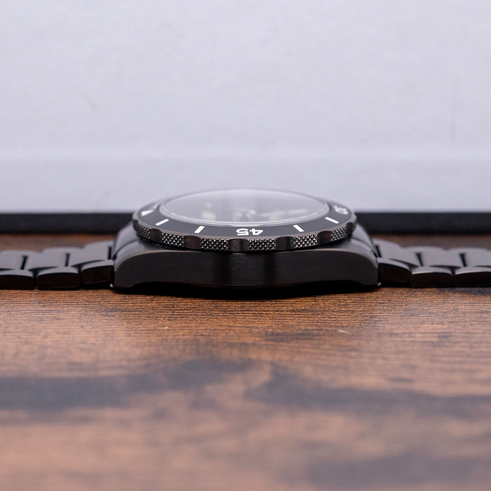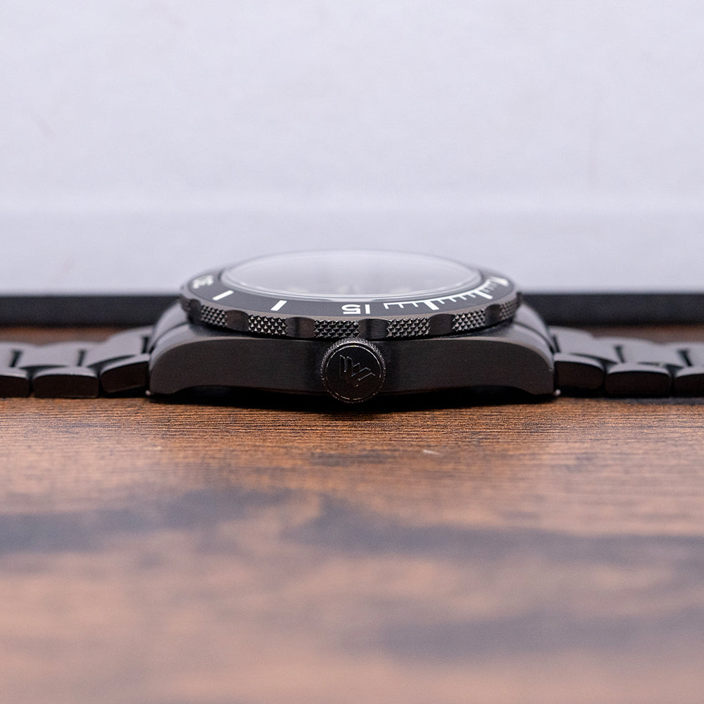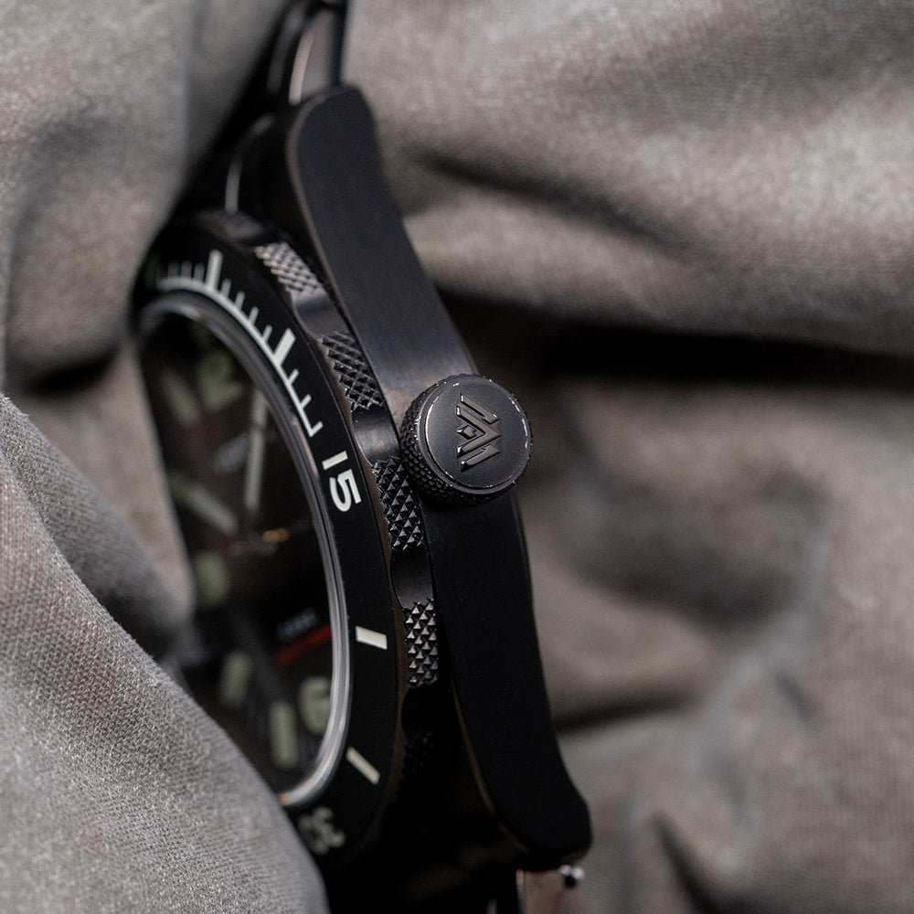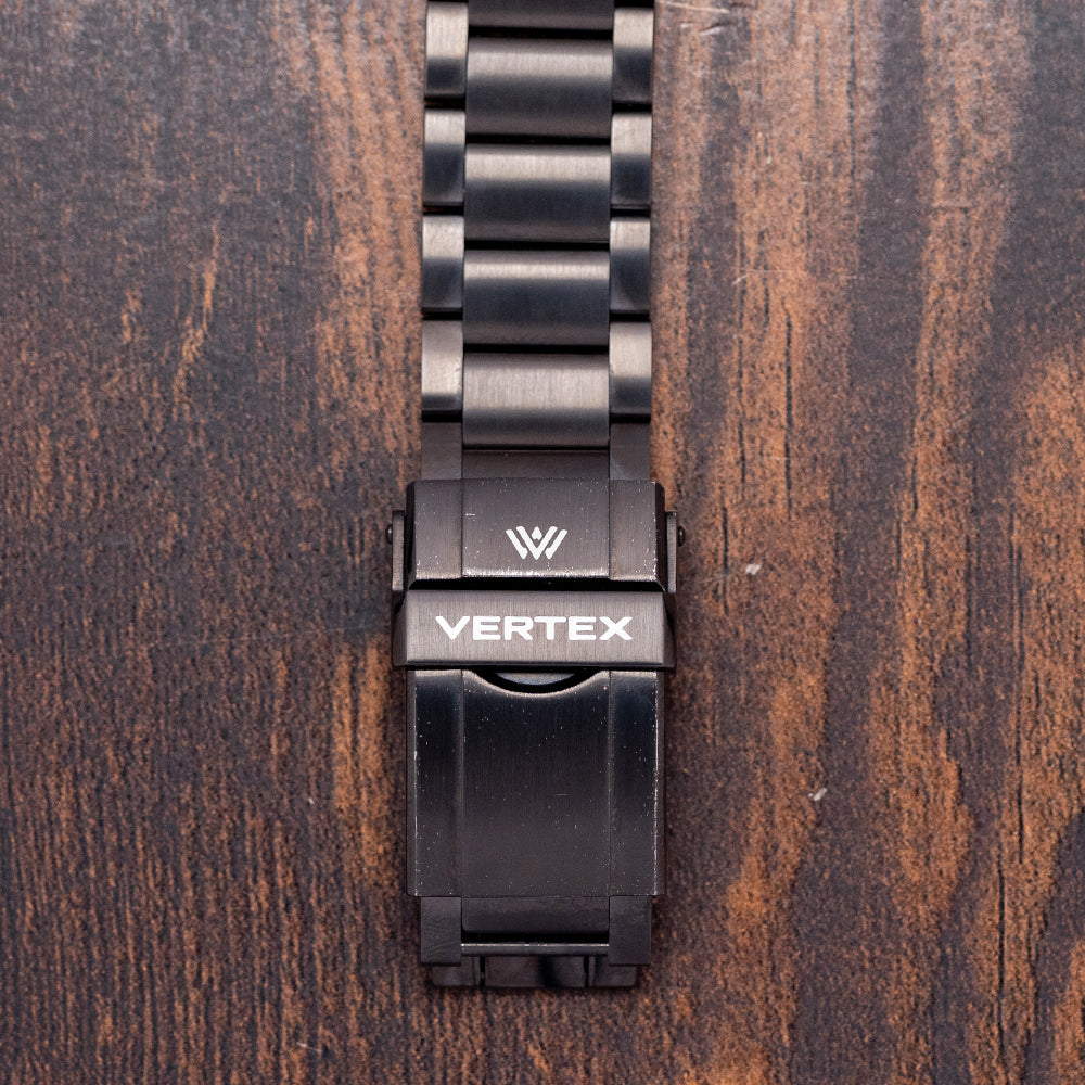 Here we have a 2022 Vertex M60C AquaLion No-Date, the C stands for Covert, with a brushed 40mm Black DLC (Diamond-like Carbon) stainless steel case for that stealthy aesthetic, that curves over your wrist with thick tapered lugs, Don has taken his inspiration from the Vertex dive watches of the 1950s and 60s and given them a more contemporary look and feel, using modern materials and technology, and a lug-to-lug length of 49mm and a case thickness of 14mm give the watch an impressive wrist presence. On the right side is a signed screw-down crown with knurling for extra grip. The watch has undergone rigorous tests to achieve ISO 6425 certification, which is no mean feat for any watch manufacturer. It shows that Vertex will go the extra mile to produce a tool watch worthy of that accreditation. A rotating dive bezel has a matte black ceramic insert, the first 15 minutes highlighted, all coated in Super-LumiNova Grade X1, holding a domed sapphire crystal above a matte black dial. An outer minute track has the characteristic moulded Super-LumiNova X1 batons, and 12, 6 and 9-hour markers as seen on the M100 series, steel sword hands are filled with Super-LumiNova X1 and complemented by a tapered sweeping second-hand. At noon, we have the Vertex motif, and at 6 o’clock, “C.O.S.C. 2000 FT/600 M” in red, complete this versatile dive tool watch with all the right credentials for any professional diver or adventurous skin diver. On the reverse, a screw-down case back with an engraved AquaLion Trademark in the centre, inside an automatic Sellita SW300-1, 25 jewels, beating at 28,800 beats per hour, COSC Certified, this workhorse movement has hacking seconds and hand winding for your convenience. It comes paired with its 20mm fitted Vertex quick-release brushed Black DLC (Diamond-like Carbon) stainless steel bracelet with a signed deployment clasp with fliplock; all links are provided, plus additional 20mm Vertex straps. The watch comes with its Vertex Peli Case, accessories and paperwork.