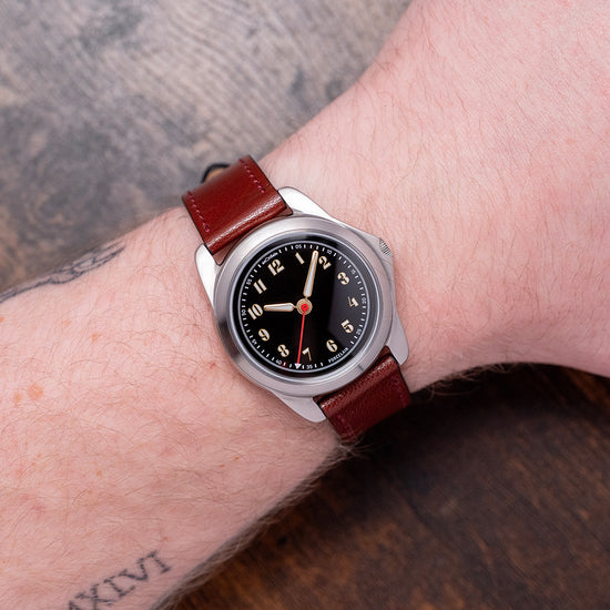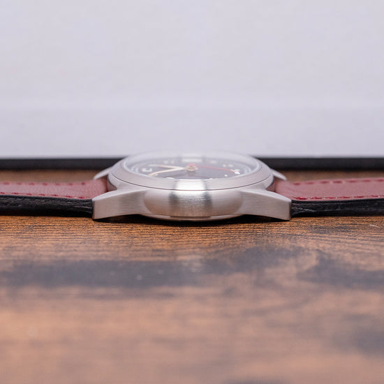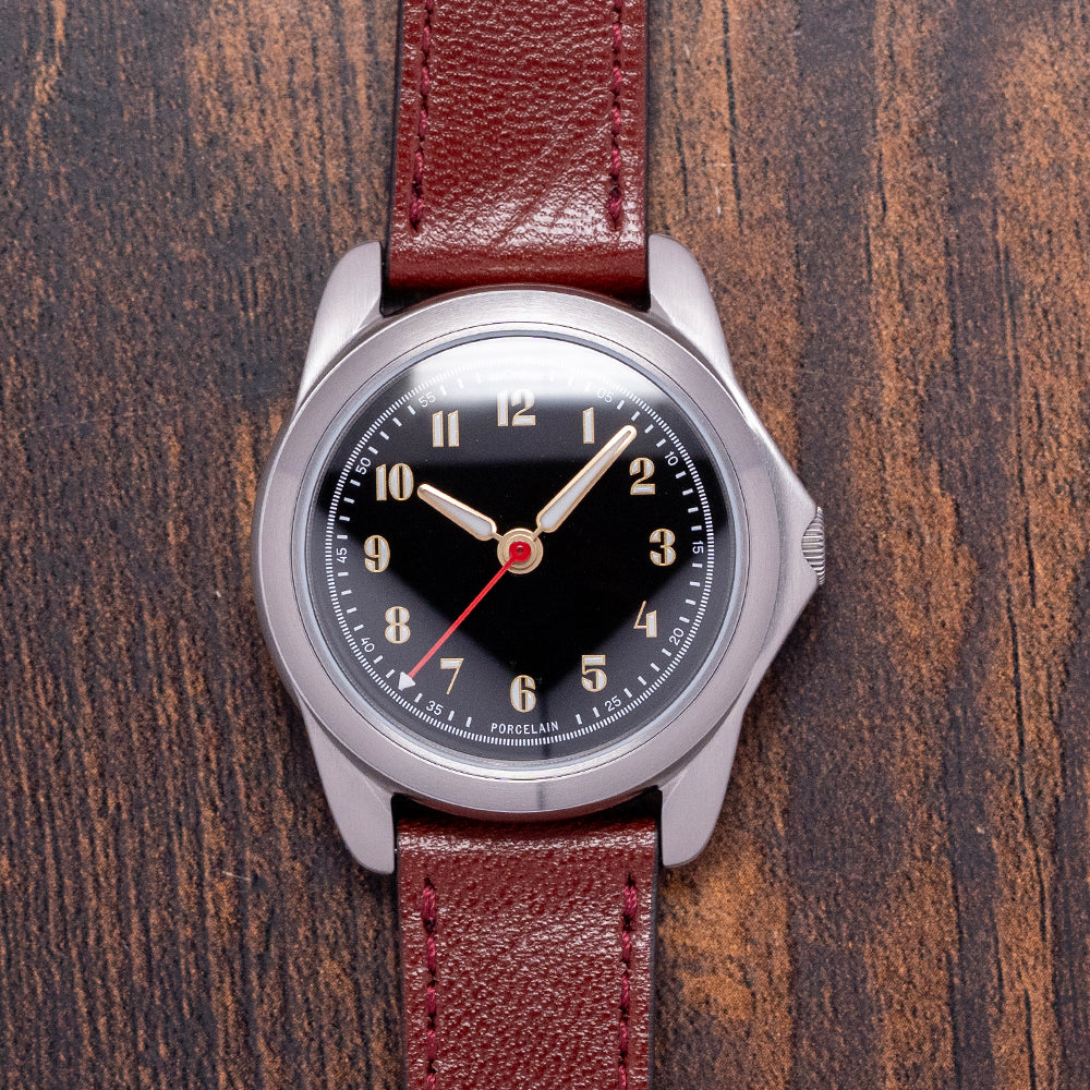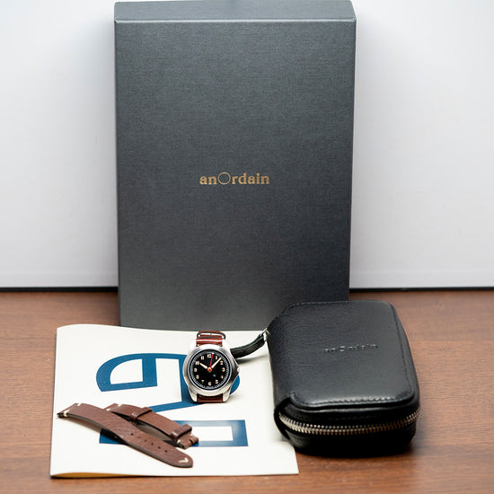Here we have a 2025 AnOrdain Model 2 Porcelain Black Medium Decorated featuring a curvaceous 36mm brushed stainless steel case that curves over your wrist with thick tapered lugs. Its sculpted, brushed flanks lead to a lug-to-lug length of 43mm and a case thickness of 11mm, ensuring a comfortable fit. On the right side, a coin-edged signed crown is protected by crown guards. The smooth brushed bezel holds a sapphire crystal with 3 layers of AR coating above a stunning black-glazed porcelain dial. This beautiful dial is handcrafted by their porcelain artist, Cara Louise, who uses traditional techniques and tools. An outer minute track, precisely executed, surrounds numerals filled with Super-LumiNova marking the hours. Elegant gold-plated hands are filled with the same lume and complemented by a red lacquer sweeping second hand. At noon, we have the AnOrdain motif completing this distinctive vintage-inspired field watch. On the reverse, a screw-down exhibition case back, engraved with the watch's details around its edge. Inside an automatic A1 – Decorated G101, 24 jewels, beating at 28,800 beats per hour, designed in collaboration with Glasgow-based artist Rachel Duckhouse, expertly engraved by their partners in Switzerland, who use the latest CNC and galvanic processes to achieve this beautiful skeletonised spiral rotor and movement decoration. It comes paired with its 18mm AnOrdain leather strap and pin buckle, plus an additional 18mm WatchGecko strap. This watch is sold with its original AnOrdain presentation box, travel case and paperwork.