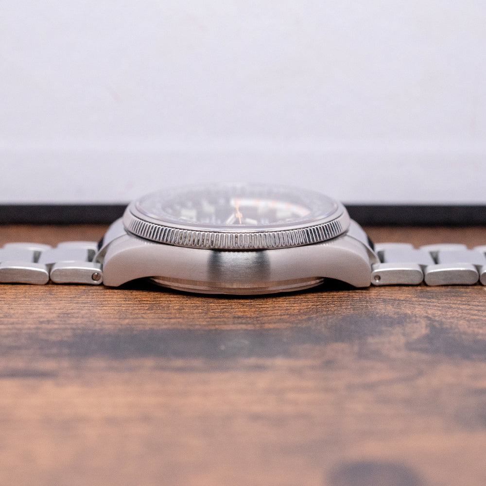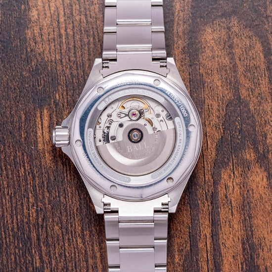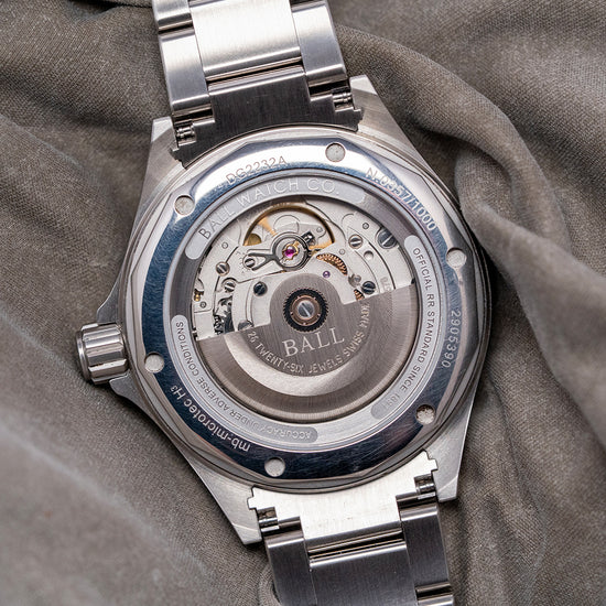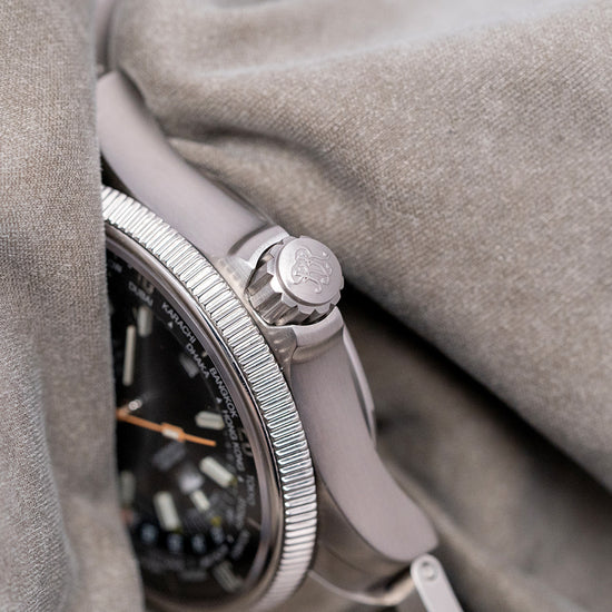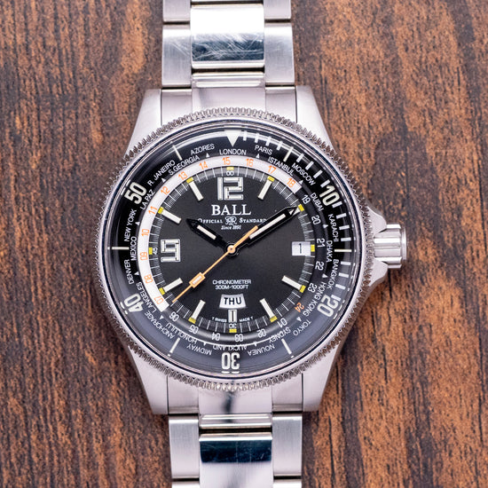 Here we have a 2025 BALL Engineer Master II Diver Worldtime Black Limited edition of 1000 pieces. Featuring a satin brushed 42mm stainless steel case that comfortably sits on your wrist thanks to the tapered lugs. Its curvaceous flanks lead to a lug-to-lug length of 48.5mm and a case thickness of 13.5mm, giving the watch an impressive wrist presence. On the right side, a depp knurled screw-down crown protected by crown guards. A polished coin-edged unidirectional bezel holds a domed sapphire crystal AR-coated above a dynamic black dial. The outer dive timer scale surrounds a 24-city world time ring that rotates using the outside bezel and works with the dive timer scale. At 3 o’clock a date window and at 6 o’clock a day window. A lower rotating 24-hour Day/Night ring surrounds the minute track and applied baton and ‘12’ and ‘9’ indexes marking the hours, topped with Tritium H3 Gas tubes for a satisfying green glow. The steel hands use the same Tritium H3 Gas tubes and a small tube on the counterweight of the orange seconds hand. At noon we have the Ball motif and at 6 o’clock ‘Chronometer 300m- 1000ft’, completing this distinctive traveller's sports tool watch. On the reverse, a screw-down exhibition case back engraved with the details of the watch around its edge, inside an automatic BALL Cal. RR1501-C, 25 jewels, beating at 28,800 beats per hour, this COSC Certified movement has a base of the ETA 2836-2. It comes paired with its 20mm satin brushed and polished stainless steel 3-link bracelet secured by a push-button signed concealed butterfly clasp; all links are provided. This watch is sold with its original Ball box, swing tags and paperwork.