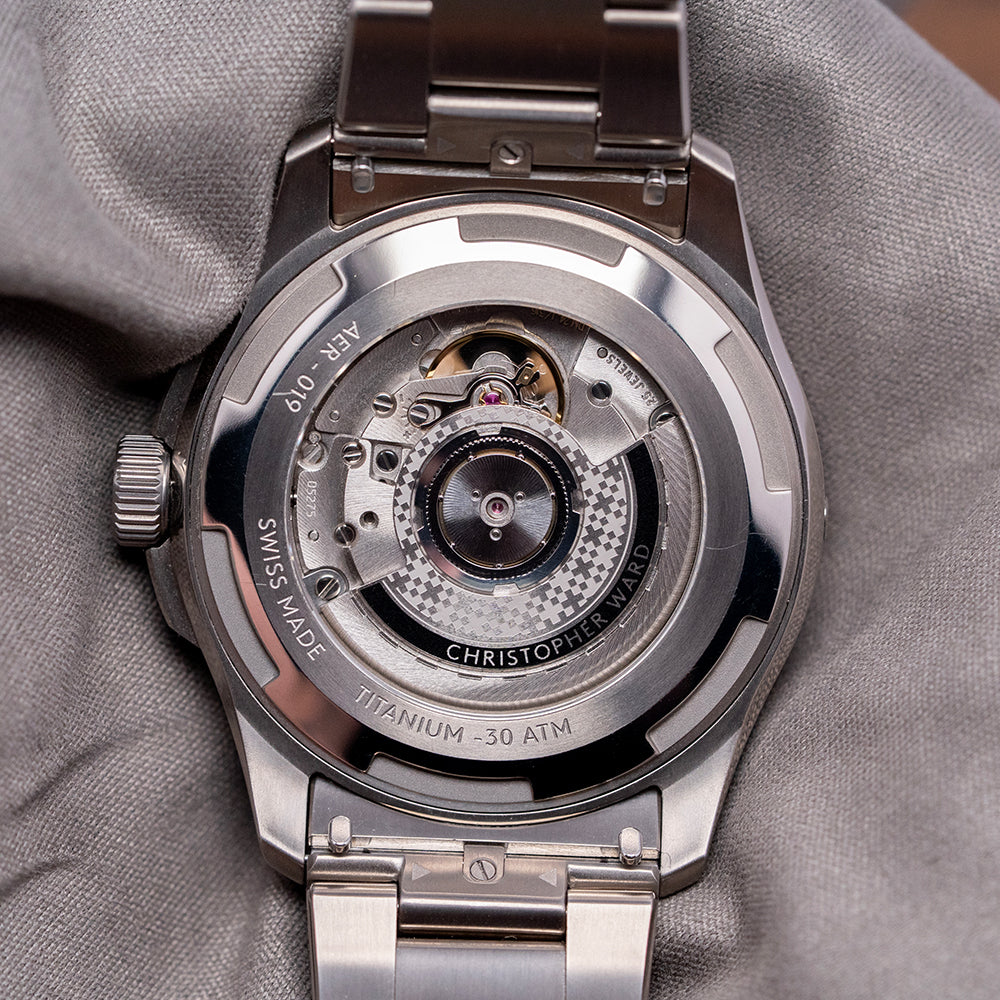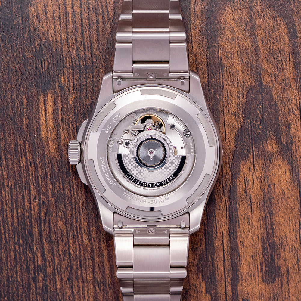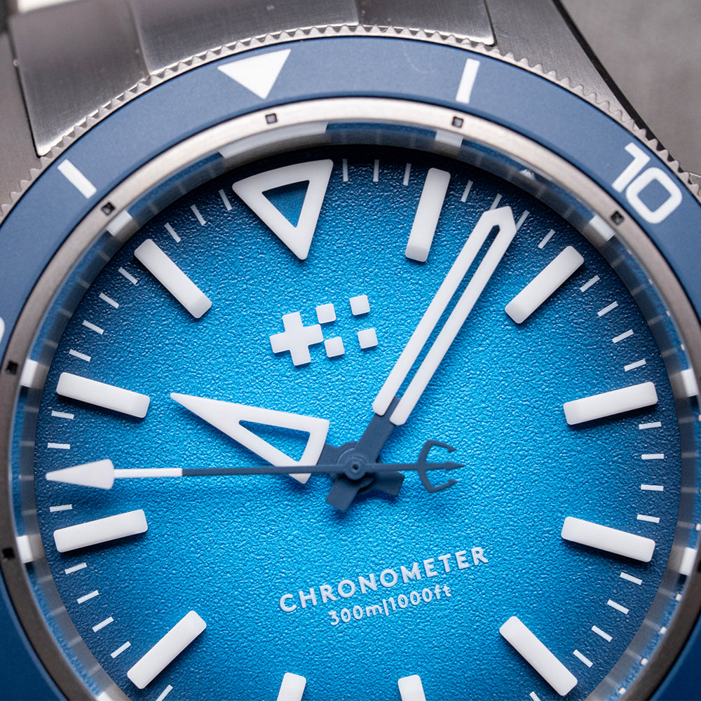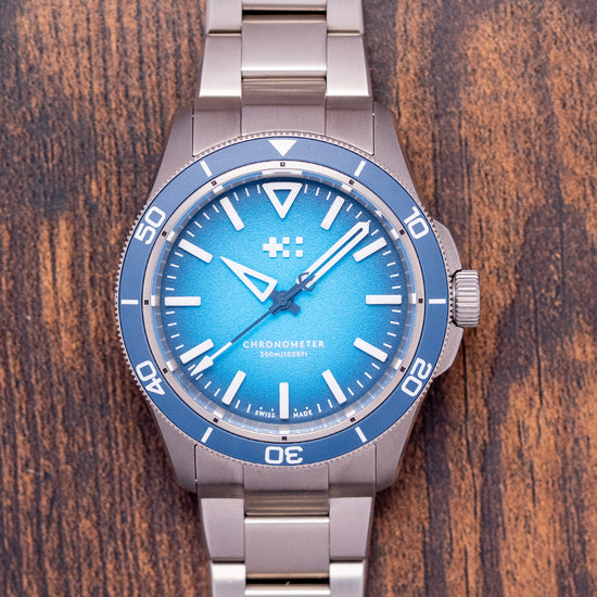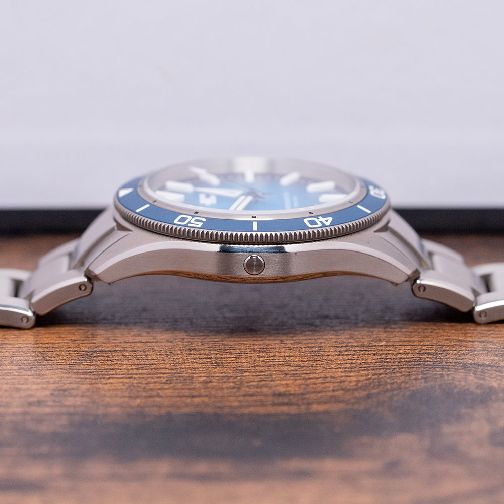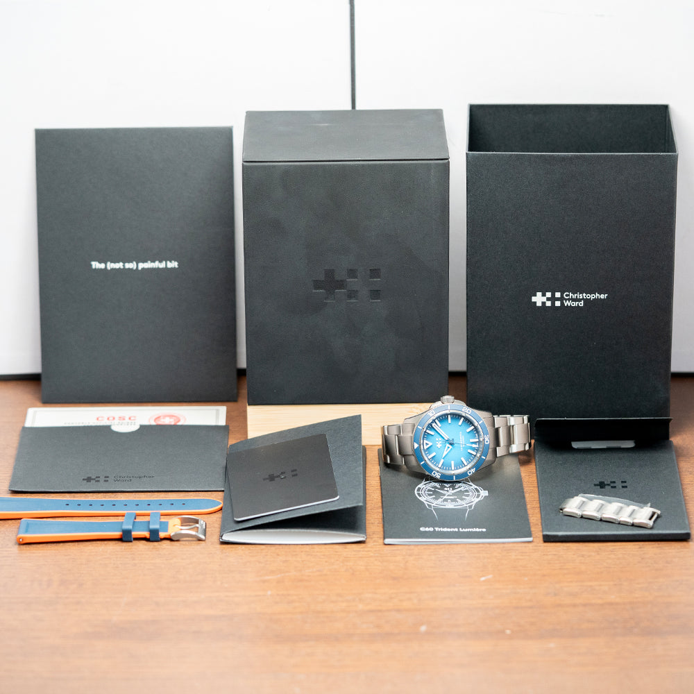 Here we have a 2025 Christopher Ward C60 Trident Lumière Blue featuring a curvaceous 41mm Titanium Grade 2 case that curves over your wrist with tapered lugs. A polished chamfered edge flows across the case, leading to a lug-to-lug length of 48mm and a case thickness of 11mm, giving the watch an impressive wrist presence. This striking Christopher Ward’s Light-catcher case has polished, brushed surfaces that transition with crisp edges. On the right side, a screw-down embossed signed crown protected by hex-screwed crown guards, on the left side, an automatic Helium escape valve. The uni-directional bezel has deep knurling for extra grip, and a blue ceramic insert with Super-LumiNova Grade SLN X1 BL C1 lumed 60-minute numerals, holding a domed sapphire crystal AR coated above a sand textured Lumière Blue fumé dial. An outer minute chapter ring has applied 3D sculpted baton indexes made from Globolight XP; a proprietary luminous ceramic made by Xenoprint, who make Super-LumiNova paint. The arrow and baton hands are made from the same Globolight XP complemented by a Globolight XP arrow-tipped trident counterweighted sweeping second hand. At noon, we have the Christopher Ward twin-flag Globolight XP motif; at 6 o’clock, ‘Chronometer and ‘300/1000ft complete this dynamic sports dive tool watch. On the reverse, a screw-down exhibition case back engraved with the details of the watch around its edge, inside an automatic Sellita Cal. SW300-1, 25 jewels, 28,800 beats per hour, a robust and reliable COSC Certified movement, with a bespoke “Colimaçoné” finishing (a type of twisting sunray graining), and the rotor has a double Twin-flag engraving across it. It comes paired with its original Christopher Ward 22mm quick-release push-button brushed grade 2 titanium bracelet with screw-links and a signed micro-adjusted ratchet clasp; all spare links are included, plus an additional CW 22mm strap. This watch is sold with its original Christopher Ward presentation box and Paperwork.