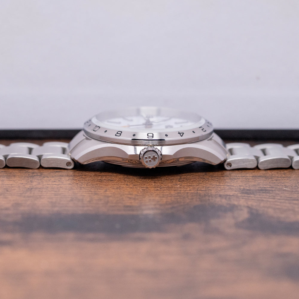 Here we have a 2025 Christopher Ward C63 Sealander GMT White, featuring a 39mm 316L marine-grade stainless steel Light-catcher case that gently curves over your wrist, with tapered lugs, a lug-to-lug length of 45.5mm, and a case thickness of 12mm, ensuring a comfortable fit. Brushed and polished surfaces transition with crisp edges that play with the light as you rotate your wrist, hence the name. On the right side is a screw-down signed crown with an embossed Christopher Ward motif. A fixed 24-hour circular brushed and polished bezel features black lacquer-filled numerals and supports a scratch-resistant anti-reflective sapphire crystal. The white, polished, lacquered dial has an outer minute chapter ring with printed Arabic numerals and an orange pip, applied, bevelled, gun-metal diamond-polished baton indexes with a strip of Super-LumiNova Grade X1 BL C1 down their centres to mark the hours; the polished edges catch the light. At 6 o’clock, a colour-matched date window. Brushed and polished gun-metal hands are filled with the same Super-LumiNova Grade X1 BL C1 complemented by an orange-tipped GMT arrow hand and an orange-tipped sweeping second hand, complete with the characteristic Trident counterweight. Text is precisely applied with a splash of orange at 6 o’clock, indicating its water resistance. This go-anywhere, do-everything watch is perfectly balanced. On the reverse, a screw-down exhibition case back, inside an automatic Sellita SW330-2, 25 jewels, 28,800 beats per hour, with a bespoke “Colimaçoné” finishing (a type of twisting sunray graining). The rotor has a double Twin-flag engraving across it. The watch comes paired with a Christopher Ward 20mm 3-link brushed stainless steel bracelet secured by a signed clasp; all links are provided, and the watch also comes with its Christopher Ward presentation box and papers.