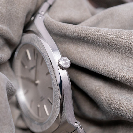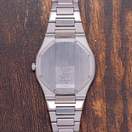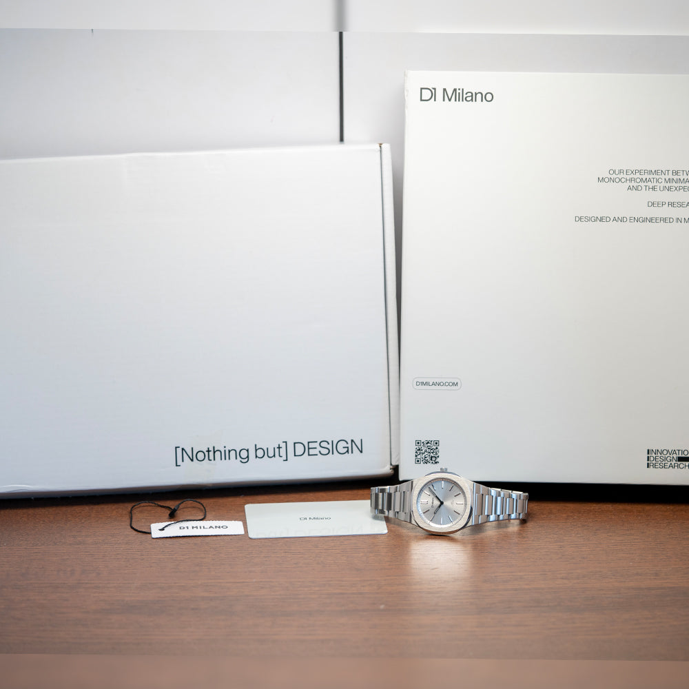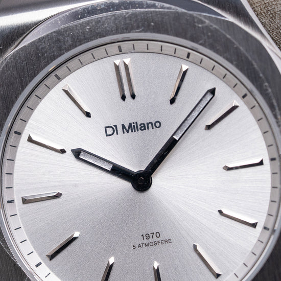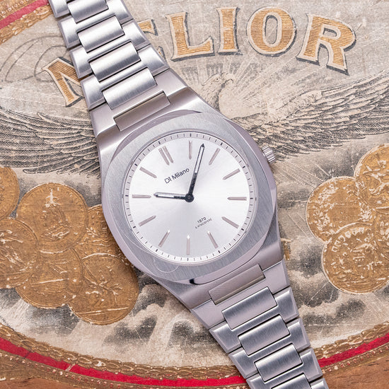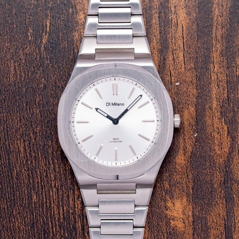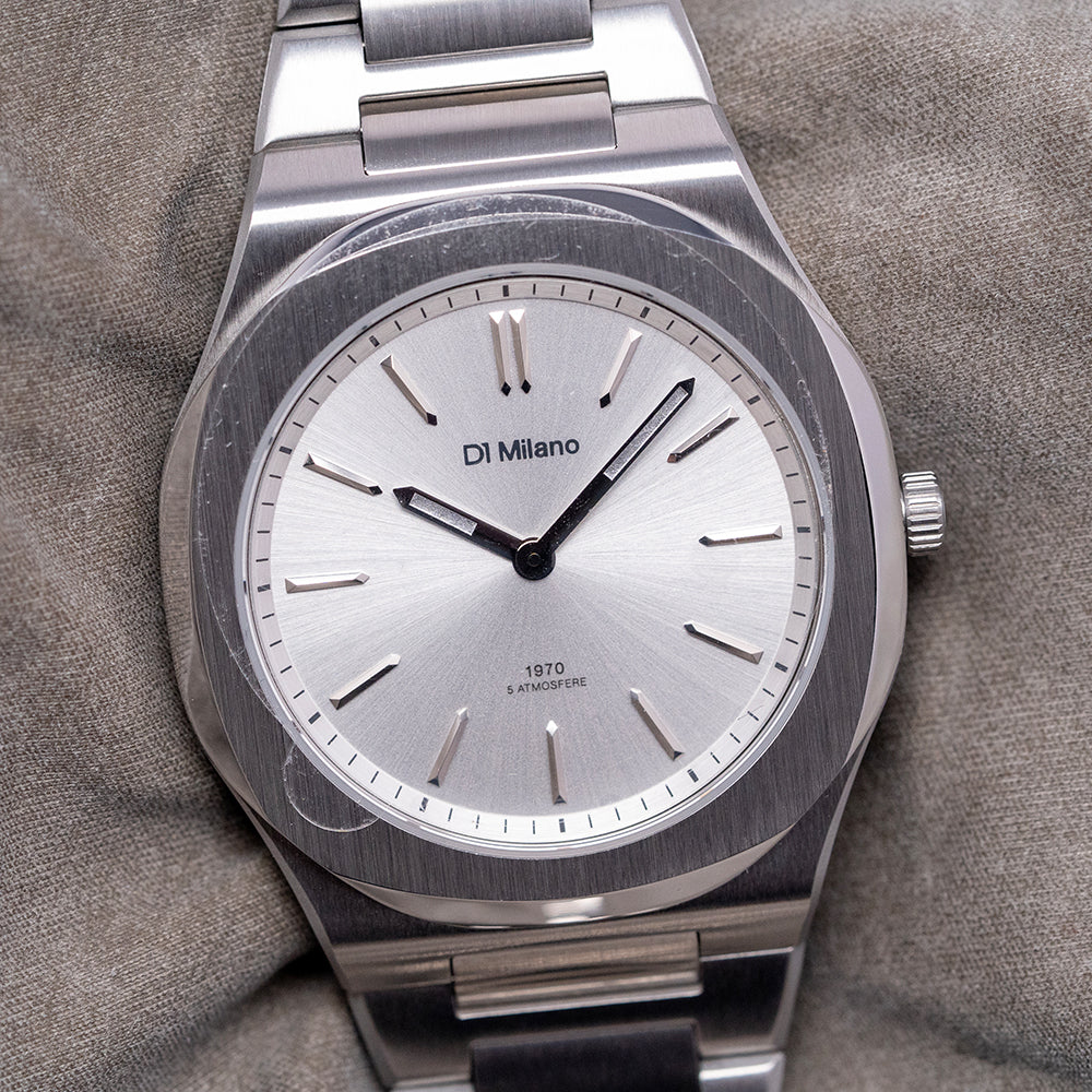 Here we have an unworn 2025 D1 Milano Ultra Thin 1970 Groovy Silver Quartz featuring a 39mm brushed tonneau-shaped case that flows over your wrist towards drilled angled lugs. The ultra-thin profile has all the charm of the 1970s with a contemporary aesthetic. The slim flanks lead to a lug-to-lug length of 45mm and a case thickness of just 6mm, ensuring a comfortable fit on the wrist. On the right side, we have a deep knurled crown. An attractive octagonal, smooth bezel features vertical brushing and polished chamfered sides, holding a flat sapphire crystal above a sunburst silver dial. An outer minute chapter ring surrounds slim-applied faceted baton indexes, marking the hours. Elegant, slim baton hands with lume-filled sit majestically in the centre. At 12 o’clock, we have the D1-Milano motif, and at 6 o’clock ‘1970, 5 Atmosphere’ completes this minimalist, sophisticated 1970s-infused watch. On the reverse, a screwed-down case back etched with the watch's details, housing a Quartz Miyota GL22 movement. It comes paired with its original D1-Milano integrated brushed stainless steel H-link bracelet with a concealed signed butterfly clasp, all links included, and the watch comes with its D1-Milano presentation box and paperwork.