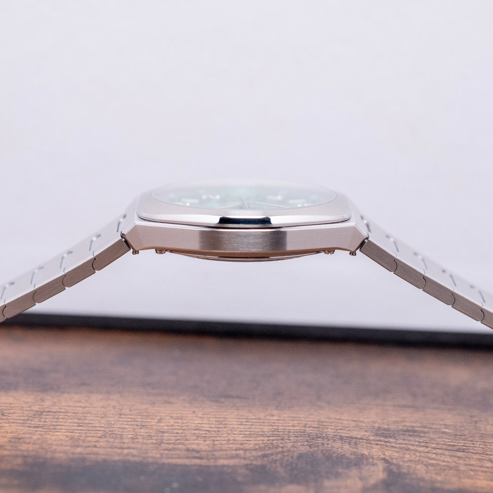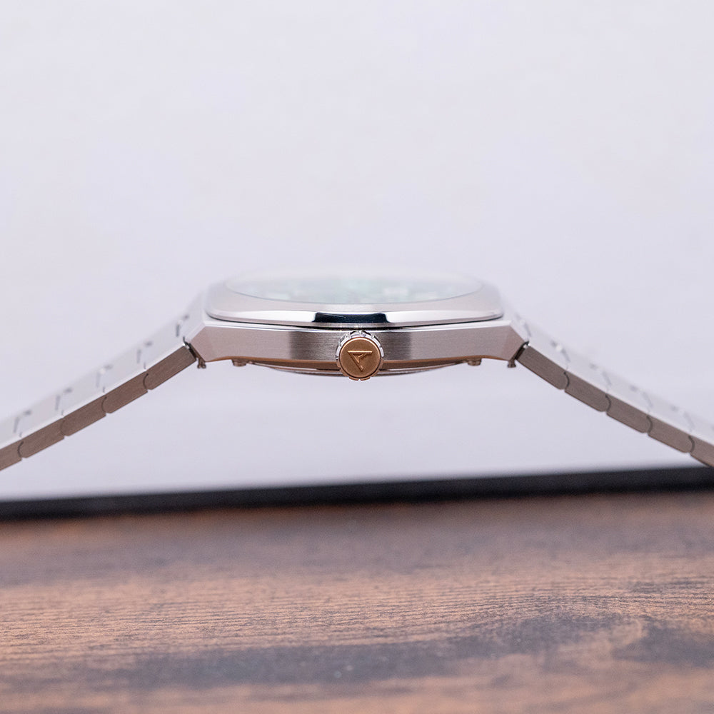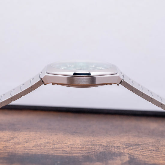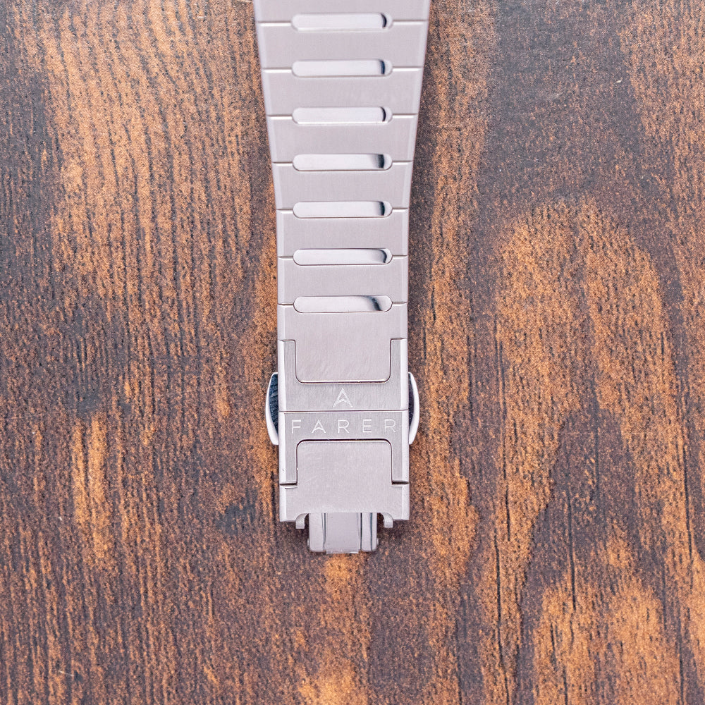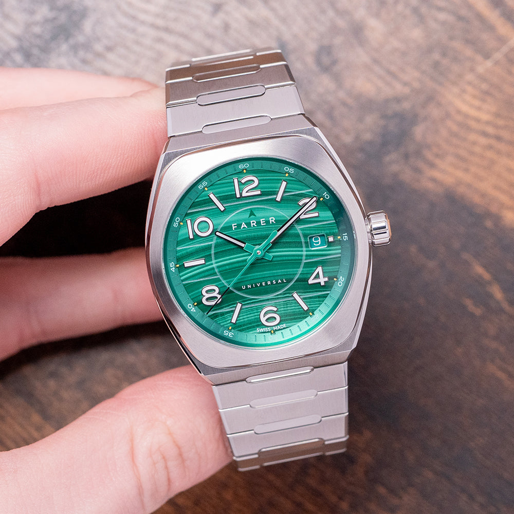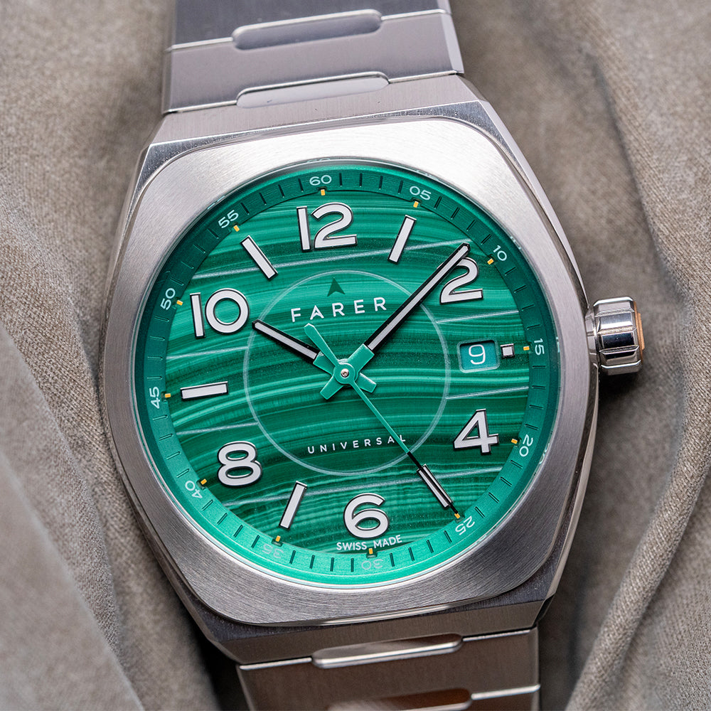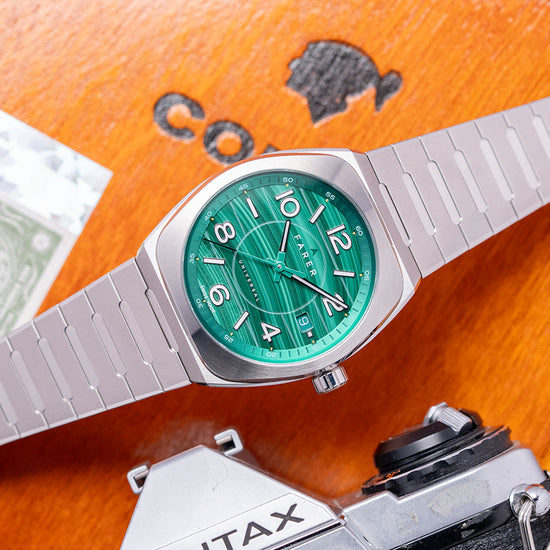 Here we have a 2025 Farer Integra Viridis Malachite Dial Automatic, featuring a sculpted 38.5mm polished and satin-brushed three-part 316L stainless steel Cushion Case that gently curves over your wrist, thanks to the flowing integrated bracelet. Its satin-brushed and polished chamfered edges flank a lug-to-lug length of 42mm and a case thickness of 10.5mm, ensuring a comfortable fit on your wrist. On the right side, there is a coin-edged, crown-capped with the bronze Farer “A”. The polished and satin-brushed stepped bezel holds a domed AR-coated sapphire crystal above an attractive green Malachite dial with its beautiful horizontal ribbon striping. Its outer brushed metallic minute rehaut surrounds the applied polished steel baton and Arabic 12, 2, 4, 6, 8, and 10 indexes filled with Grade X2 Super-LumiNova, marking the hours. Green and steel hands filled with SuperLumiNova are complemented by a tapered green seconds hand. At noon, the Farer motif completes this distinctive, colourful, natural-stone timepiece. On the reverse, a screwed-down sapphire exhibition case back, inside an automatic Sellita Cal. SW300-1, 25 jewels, beating at 28,800 beats per hour, attractive green skeletonised fully circular rotor vapour-coated to match the dial. It comes paired with its integrated quick-release 24mm Farer polished chamfers and centre links, a satin-brushed finished stainless steel bracelet secured by a signed concealed butterfly clasp; all links are included, plus a 24mm Farer green strap and pin buckle. This watch is sold with its original Farer Box, swing tag, and paperwork.