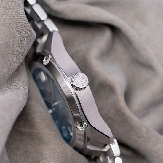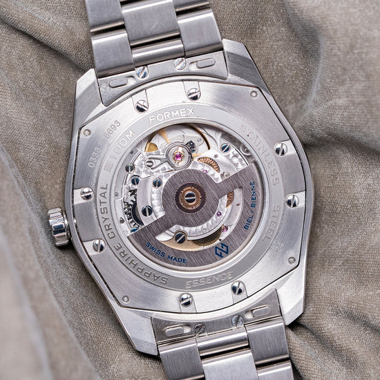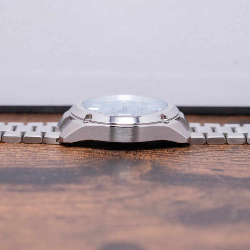 Here we have a 2025 Formex Essence ThirtyNine Auto "Space Glacier" on a Bracelet. Featuring a 39mm brushed and polished stainless steel case that curves over your wrist with thick tapered lugs. The patented Case Suspension System consists of 4 springs between the upper and lower watch case. This flexes with your wrist and provides excellent shock absorption. Its brushed flanks lead to a comfortable lug-to-lug length of 45.5mm and a case thickness of 10mm. On the right side is a signed deep-knurled crown. The brushed and polished, smooth bezel holds a flat, AR-coated sapphire crystal above a stunning Muonionalusta meteorite "Space Glacier" dial. This incredible dial is electroplated with 98% pure silver and then finished with six layers of translucent blue zapon lacquer. An outer minute chapter ring surrounds applied facet-edged baton indexes filled with BGW9 Super-LumiNova, marking the hours. At 6 o’clock, a date window. Elegant hands are filled with the same lume and complemented by a tapered sweeping second hand. At noon, the applied Formex motif is visible, and at 6 o’clock, ‘Essence Chronometer’ completes this icy, space-infused timepiece. On the reverse, an exhibition screwed-down case back featuring the watch's details around its edge, with an automatic Sellita SW200-1, 26 jewels, beating at 28,800 beats per hour, COSC Chronometer-certified. The movement has been customised with a skeletonised rotor, thermally blued screws, and perlage finishing. Has hacking and manual winding. It comes paired with its chunky, quick-release 20mm Formex brushed-and-polished 3-link stainless steel bracelet, secured by a signed deployant clasp with micro-extension; all links are included, plus an additional 20mm Formex strap. This watch is sold with its original Formex Box and Formex Paperwork, including the COSC certificate.