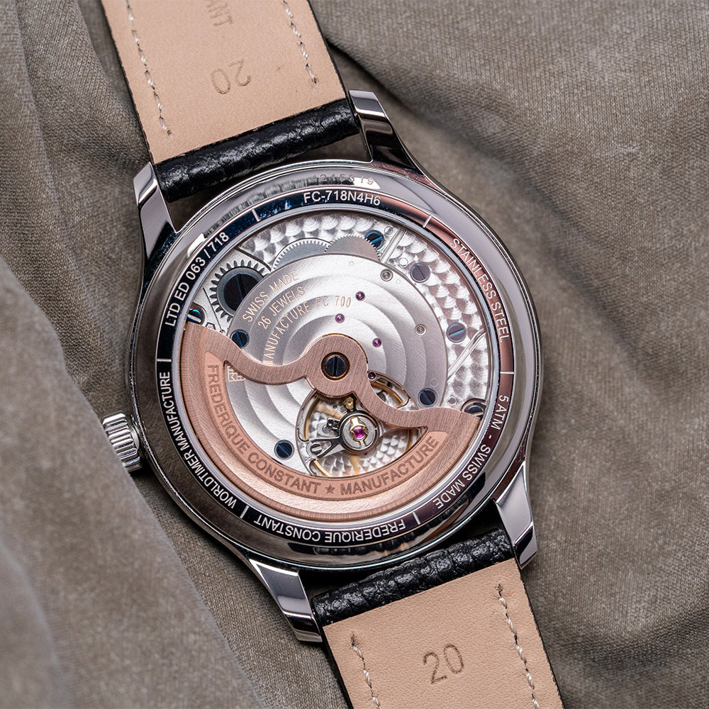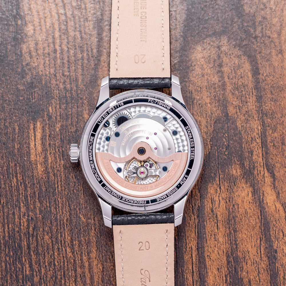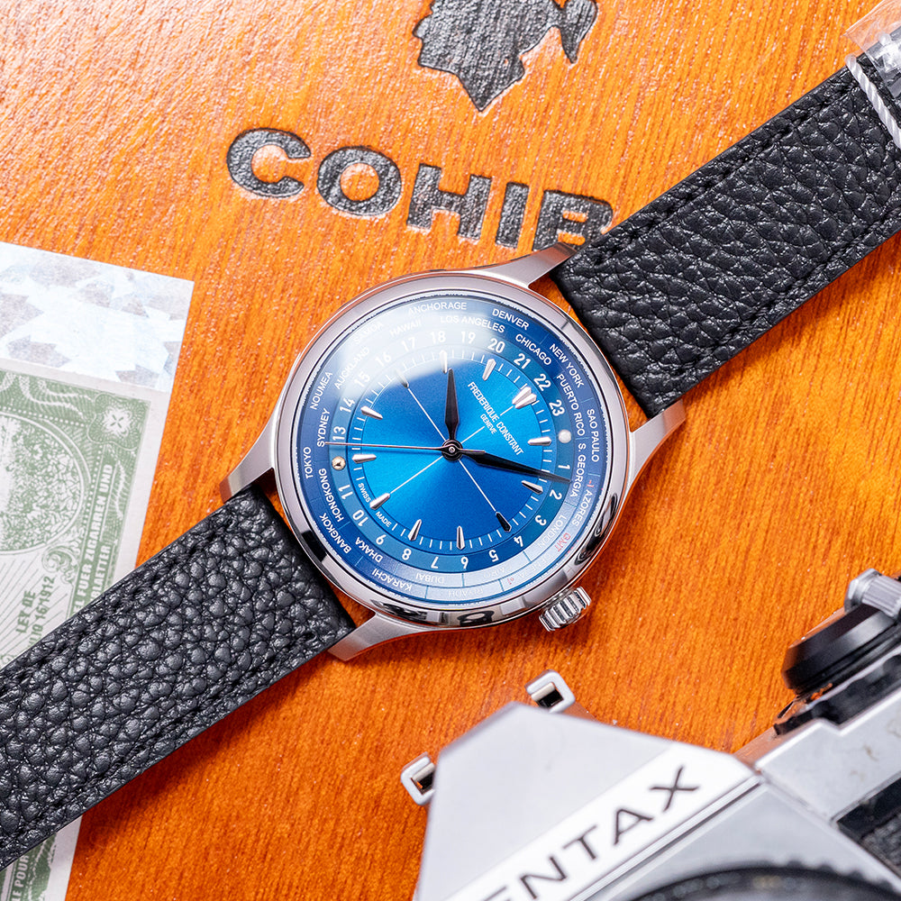Here we have a 2025 Frederique Constant Worldtimer Watch Angels Limited to 718 pieces. Featuring a 40.5mm brushed stainless steel case that gently curves over your wrist with fine tapered lugs. Its polished bevel edge flows effortlessly across the case towards a comfortable lug-to-lug length of 49mm and a case thickness of 13.5mm. On the right side, a signed, deep knurled crown. The polished bezel holds a sapphire crystal above a stunning sunburst crosshair blue dial. A sloping two-tone 24-city disc and a 24-hour GMT time zone disc segmented into day and night by a gold sun and a silver crescent moon. The circular-grained minute track surrounds the applied rhodium-coated indexes, marking the hours. Elegant polished steel hands are complemented by a tapered sweeping second hand. At noon, the Frederique Constant motif completes this dynamic traveller's companion. On the reverse, a screw-down sapphire exhibition case back, engraved with the watch details and limited number around its edge, inside an automatic FC Cal. FC-718, 26 jewels, beating at 28,800 beats per hour, the movement features a skeletonised gold-toned rotor, decorated with perlage and Côtes de Genève. It comes paired with its 20mm Frederique Constant calf leather strap and folding buckle. This watch is sold with its original Frederique Constant box, travel case and paperwork.