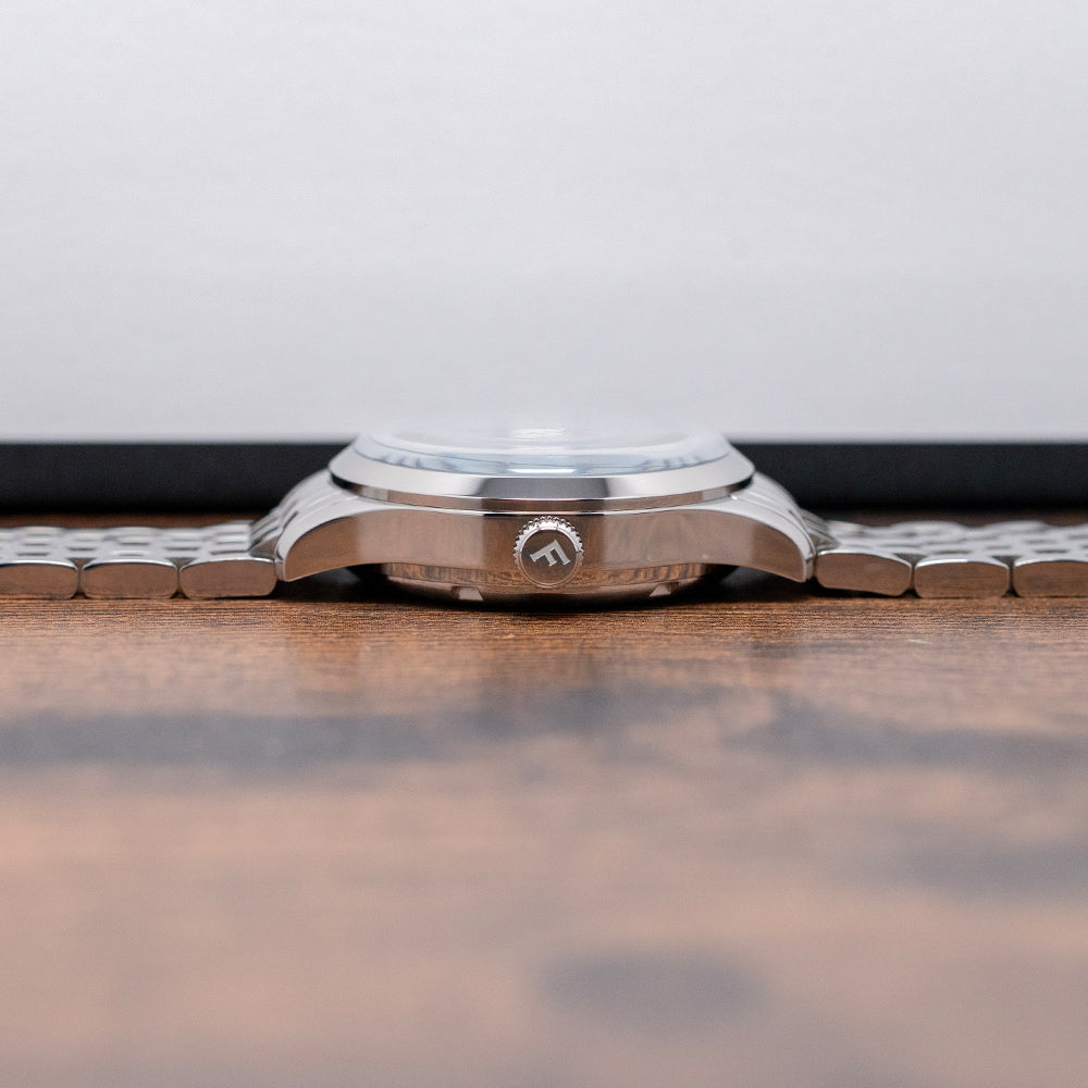 Here we have a 2025 Fukushima Watch Company Futaba Silver Auto featuring a 34mm mirror-polished stainless steel case that sits elegantly on your wrist with fine tapered lugs. Its curved mirror-polished flanks lead to a comfortable lug-to-lug length of 42mm and a case thickness of 12.5mm. On the right side, a coin-edged signed crown. The domed mirror-polished smooth bezel holds a mineral crystal above a striking two-tone silver dial. An outer minute railroad surrounds applied mirror-polished Breguet-style numerals marking the hours. Elegant leaf hands are complemented by a tapered second hand. At noon, we have the Fukushima Watch Company motif completing this sophisticated dress watch. On the reverse, a screw-down exhibition case back is engraved with the watch details around its edge, inside an automatic Miyota Cal. 82S0, 21 jewels, beating at 21,600 beats per hour, featuring a signed skeletonised rotor. It comes paired with its 18mm 7-link mirror-polished stainless steel bracelet, secured by a push-button, concealed, double-folding clasp; all links are included.