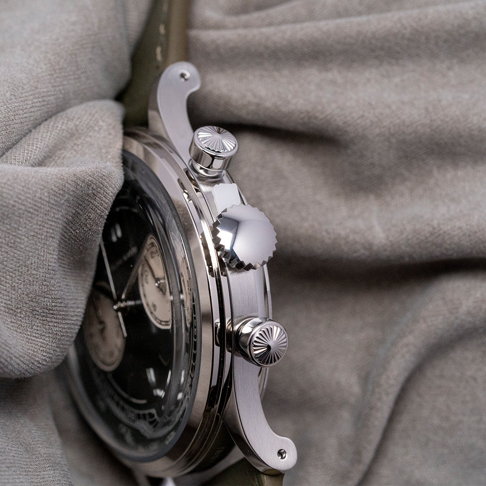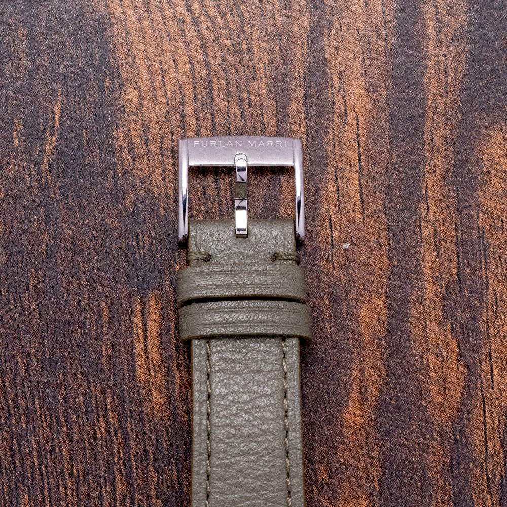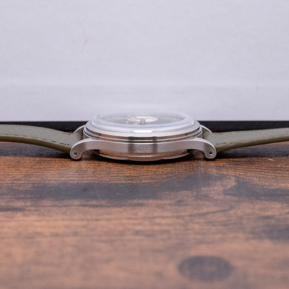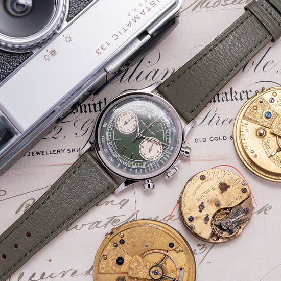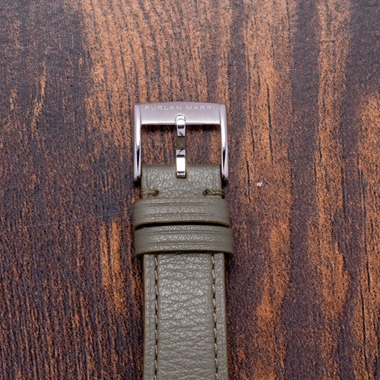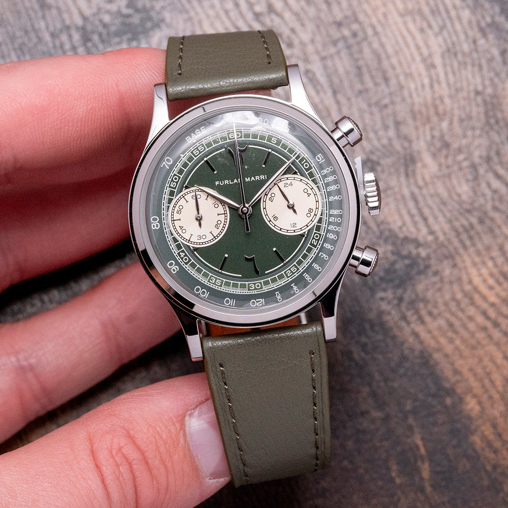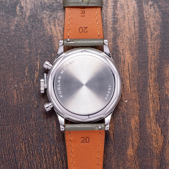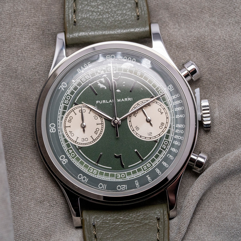 Here we have a 2025 Furlan Marri Sage Green Special Edition featuring Hindi-Arabic numerals. The 38mm polished and satin-brushed stainless steel case gently curves over your wrist, ending with elegant, rounded, and tapered drilled lugs. It has a lug-to-lug length of 46mm and a thickness of 11.5mm, giving the watch an impressive wrist presence. Inspired by vintage chronographs such as the Patek 1463 and the dramatic colours found in the undulating landscapes of the Arabian deserts and oases. We have chronograph piston pushers with engraved "Tasti Tondi" caps and a large crown on the right side. The stepped, polished, and satin-brushed smooth bezel features a double-domed sapphire crystal with five layers of anti-reflective (AR) coating. A dual-toned sage green dial features an outer Tachymeter scale and an inner minute track, both precisely printed within a dark green ring. Applied polished Hindi-Arabic numerals at 12 and 6 and steel baton indexes mark the hours. At 3 o’clock, a 24-hour recessed register and at 9 o’clock, a 60-minute register, the contrast of cream against the sage green dial is striking. Elegant-leaf hands have polished edges and a subtle domed curve that catches the light as you rotate your wrist. A fine, tapered chronograph hand completes this well-balanced bi-compax dial; the text is minimalist with a “Furlan Marri" motif printed at 12 o’clock. On the reverse, a screw-down decagonal case back features an attractive machine-turned design, housing a Seiko Meca-Quartz movement. This mechanical quartz hybrid utilises a tuning fork-type quartz crystal. You get the same kind of mechanical resistance when you engage the pushers and a satisfying snap back of the chronograph seconds hand on reset. The watch comes paired with two 20mm Furlan Marri leather straps and signed pin buckles. It is sold with its original Furlan Marri box, travel case, and paperwork, and includes a Certificate of Origin and an Archive for the Future certificate.