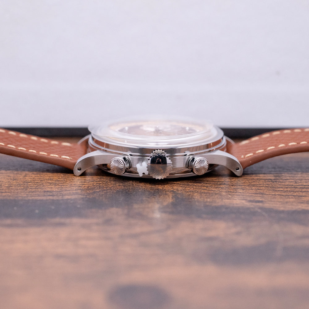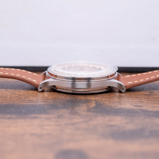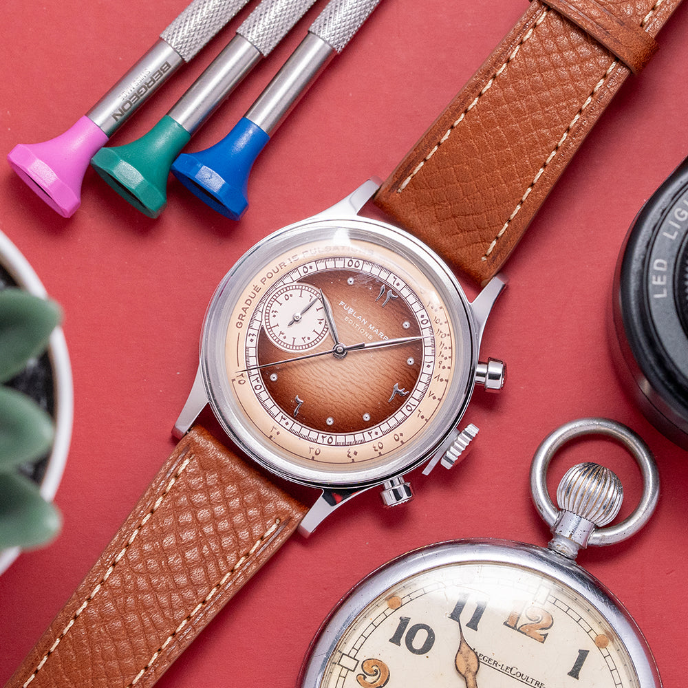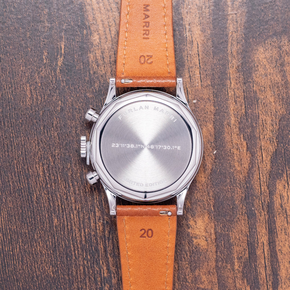Here we have a 2025 Furlan Marri Sahra Edition Limited Chronograph, inspired by the culture and textures of the Sahra Desert and limited to 750 pieces. The Sahra Edition is a collaboration with CLE: The Gallery, which was founded in London in 2013 by Saudi entrepreneur Yasmine Al Shathry. Initially, CLE operated as a luxury concierge service for art collectors in Saudi Arabia and the Gulf region. Over time, it has become a destination for unique design items, artwork, and limited-edition pieces. Featuring a polished 38mm stainless steel case that gently curves over your wrist with fine tapered drilled lugs. Its curved flanks lead to a comfortable lug-to-lug length of 46mm and a case thickness of 11.5mm. We have chronograph piston pushers with radial-pattern caps and a large centre crown on the right side. The stepped, polished bezel holds a double-domed sapphire crystal. The textured brown gradient sector dial features a Pulsations scale in Hindi-Arabic numerals surrounding an off-white, precisely executed minute track with the same numerals. Above, polished Hindi-Arabic 12, 3, and 6 numerals and pips marking the hours. Delicate, polished leaf hands are complemented by a tapered chronograph hand, set majestically at the centre of a dune-textured brown gradient disc that reflects the beautiful hues of the Sahara desert at midday and at 9 o’clock, an off-white 60-minute register. At noon, we have the Furlan Marri motif and ‘Editions’ printed beneath it, completing this distinctive collaborative limited edition. On the reverse, a solid screw-down case back is engraved with coordinates to Riyadh’s desert, which inspired this watch, and houses a Mecha-Quartz Seiko Cal. VK64 is a mechanical quartz hybrid with a tuning-fork-type quartz crystal. You get the same mechanical resistance when you engage the pushers, a satisfying snap-back of the chronograph seconds hand on reset, and a smooth sweep. It comes paired with two Furlan Marri straps and a steel pin buckle. This watch is sold with its original Furlan Marri box, travel case and paperwork and comes with its Certificate of Origin and an Archive for the future certificate.