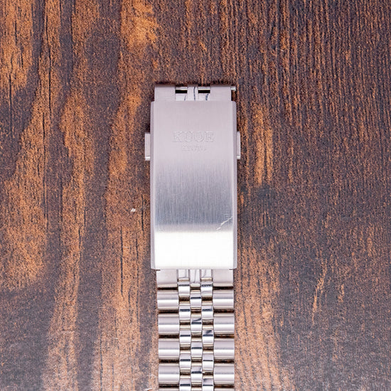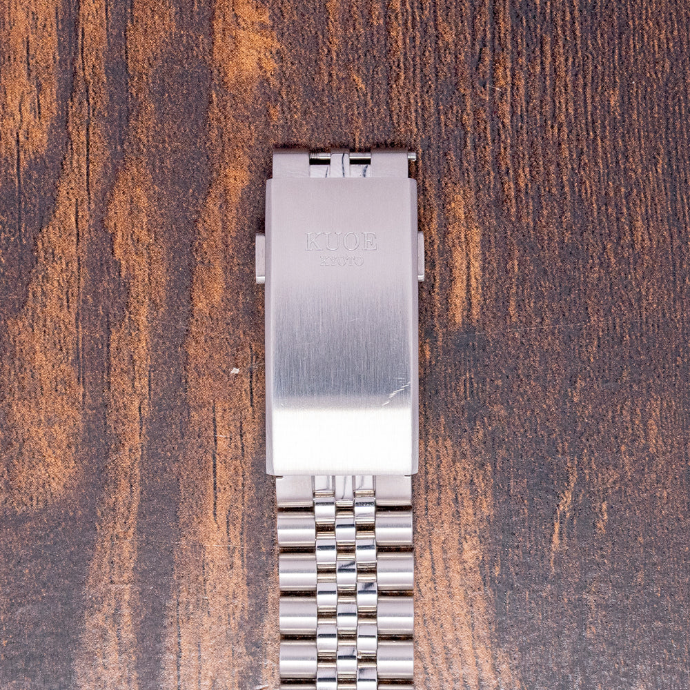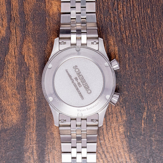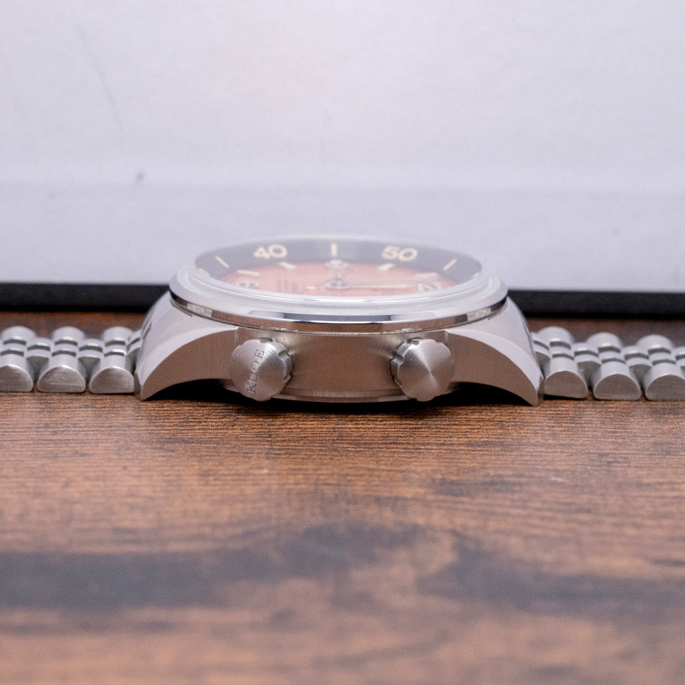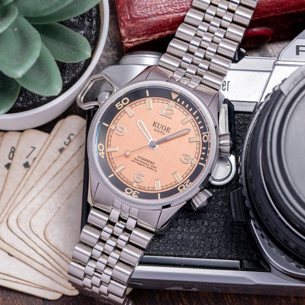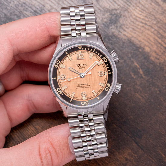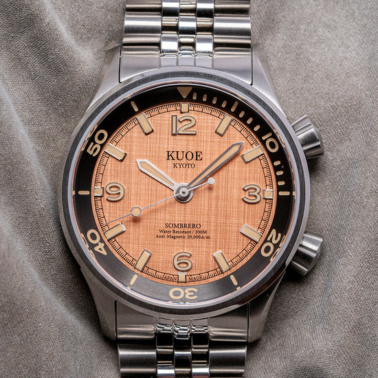 Here we have a 2025 Kuoe Sombrero 90-011 Salmon Linen Dial Compressor named after the Sombrero Galaxy, which is known as the most beautiful place in space. The 38mm 316L stainless steel compressor-style case comfortably sits on your wrist, thanks to the tapered, polished, and brushed lugs. Polished and brushed surfaces transition with crisp lines along its flanks, leading to a lug-to-lug length of 45.5mm and a case thickness of 12.5mm, giving the watch an impressive wrist presence. Down the right side, we have a screw down crown at 2 o’clock to rotate the black inner bi-directional 60-minute bezel coated in old radium SuperLuminova. This system is perfect for when diving avoiding accidental rotation, at 4 o’clock a screw down crown to adjust the time, a thin polished and brushed bezel holds a domed box shaped sapphire crystal AR on the inside and AF (anti -fingerprint) coated for perfect viewing of the striking Salmon pink linen textured dial. An outer minute track is precisely executed with applied 12, 3, 6 and 9 numerals and baton indexes filled with old radium SuperLuminova, elegant sword hands filled with the same lume are complemented by a lollipop sweeping second hand, at noon we have the Kuoe Kyoto motif and at 6 o'clock SOMBRERO Water Resistant/200m Anti-magnetic 20,000 A/m. Indicating the magnetic field it can withstand before the watch's accuracy is affected. Completing this distinctive tool watch. On the reverse, a screw-down solid case back features the details of the watch around the edge, with the embossed inscription "SOMBRERO 90-011 Assembled by Kuoe Kyoto" at the centre, inside an automatic Miyota Cal. 9039, 24 jewels, 28,800 beats per hour. It has hand-winding and hacking functionality. This movement belongs to the Miyota Premium Automatic range. It was first introduced in 2018. It comes paired with its 20mm brushed stainless steel bracelet secured by a signed push-button deployant clasp, and all links are provided. This watch is sold with its Kuoe Kyoto presentation box and paperwork.