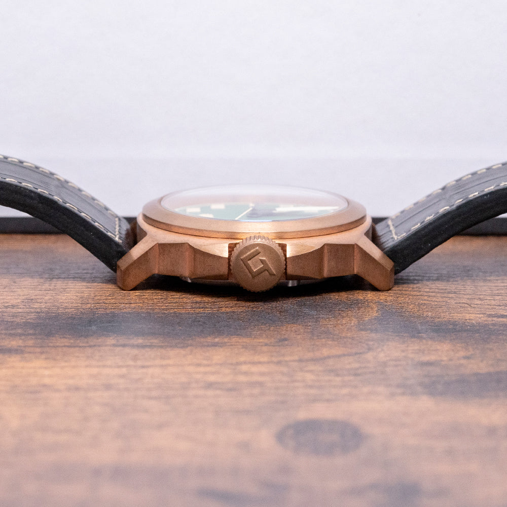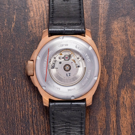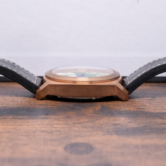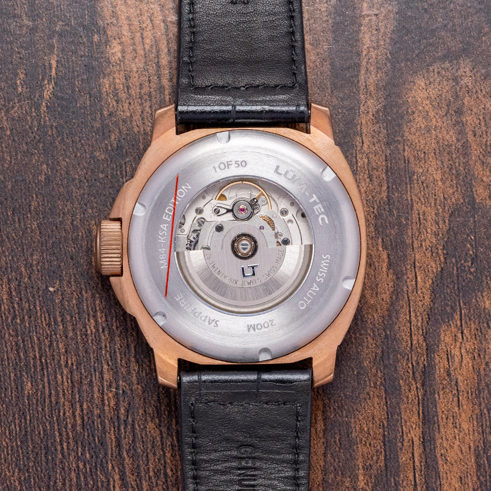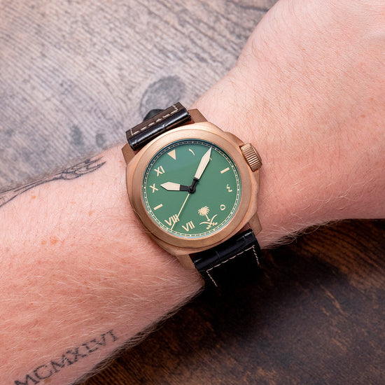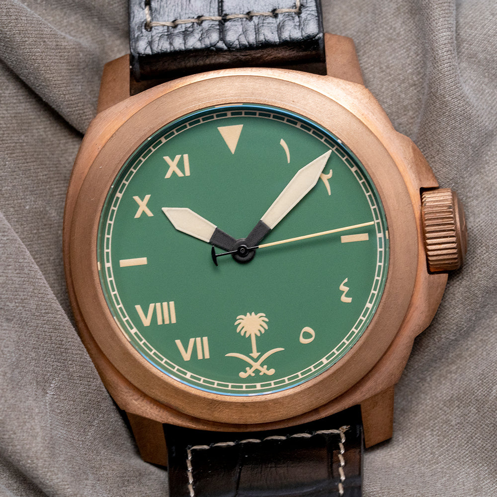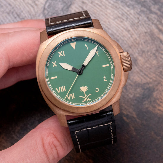 Here we have a 2025 Lum-Tec x Al Meshkah Bronze Saudi Arabia 'California Dial', a Limited Edition of 50 celebrating KSA National Day, commemorating the proclamation of the first King of Saudi Arabia, Abdulaziz Al Saud, on September 23, 1932, who unified the nation under the House of Saud. This is a collaboration between LÜM-TEC x Al Meshkah. Al Mekshah is rooted in "Al Keshah," which means the ‘start of hunting’. Founded by Mohammad Al Falasi and based in Dubai, a city in the United Arab Emirates (UAE). They offer a wide range of watches for the discerning adventurer. The 44mm bronze cushion case sits comfortably on your wrist, thanks to its short, angled lugs. Its curved flanks lead to a lug-to-lug length of 51mm and a case thickness of 13mm, giving the watch an impressive presence on the wrist. On the right side, a large screw-down crown features high-tech Viton gaskets, protected by crown guards. The smooth bezel features a flat sapphire crystal, AR-coated on the inside, above a striking matte green dial. An outer minute track surrounds gold-toned Roman and Hindu–Arabic numerals, marking the hours. Broad sword hands, coated in MDV Technology Lume, are complemented by a tapered second hand. At noon, we have the LÜM-TEC motif, and at 6 o’clock, the two crossed swords and palm tree, the national symbol of Saudi Arabia. On the reverse, a screw-down sapphire exhibition case back houses an Automatic Sellita SW200-1, 26 jewels, beating at 28,800 beats per hour. It features hand-winding, hacking seconds, and quick-set date functions for your convenience. It comes paired with two LÜM-TEC 24mm straps with a bronze-tone buckle. This watch is sold with its original LÜM-TEC box and paperwork.