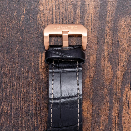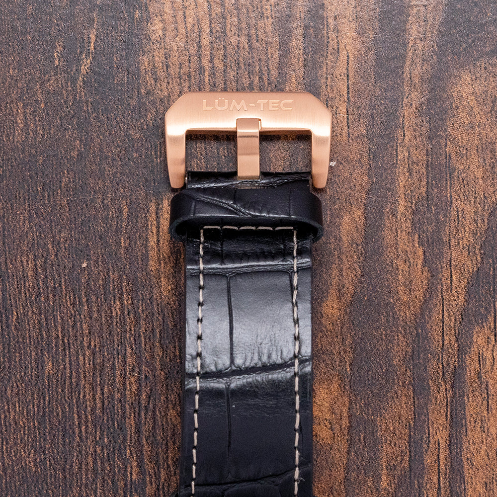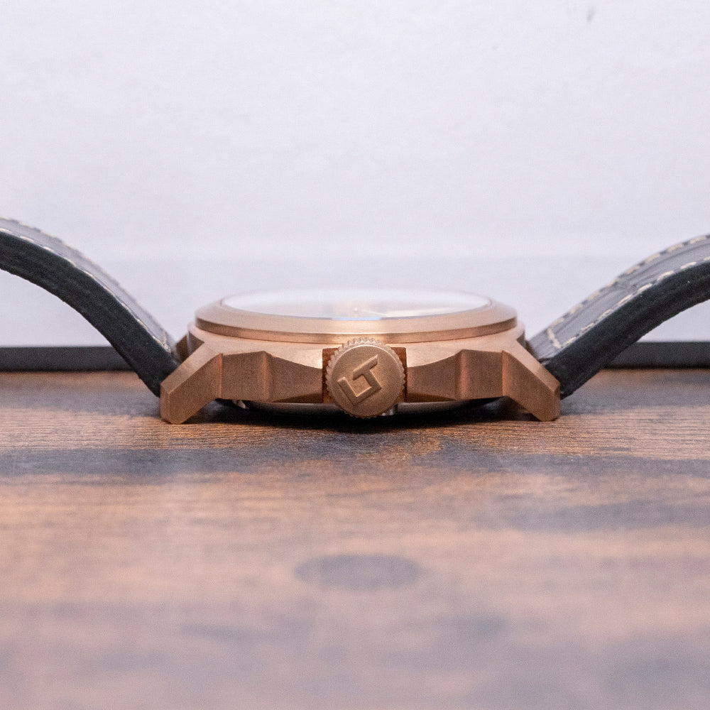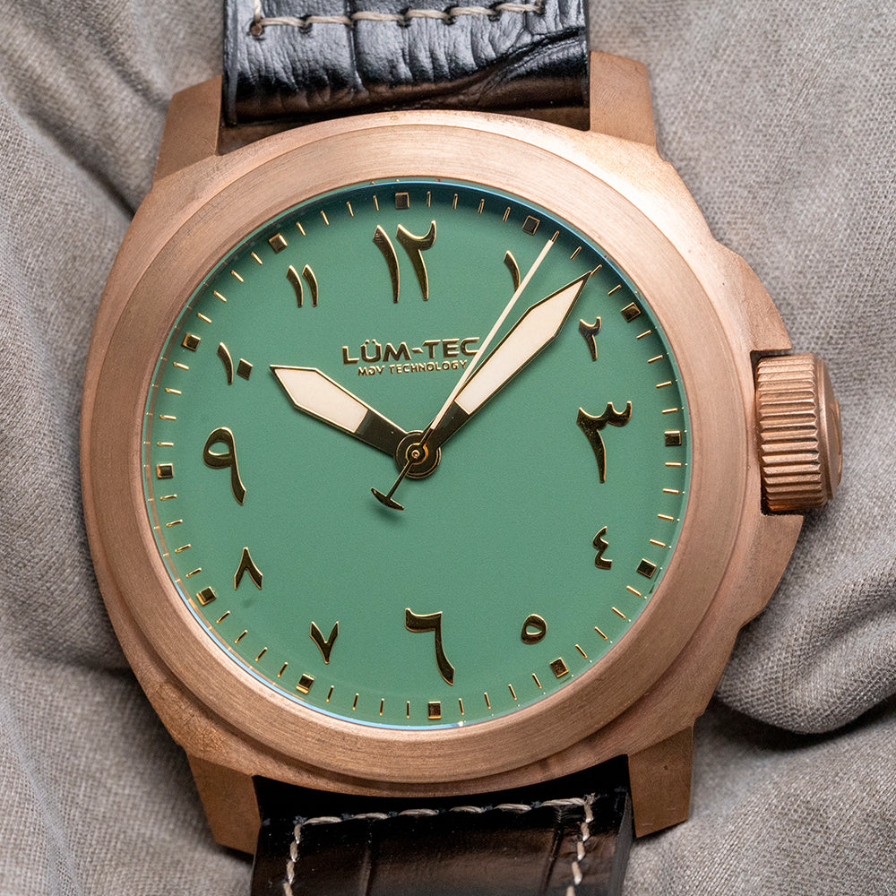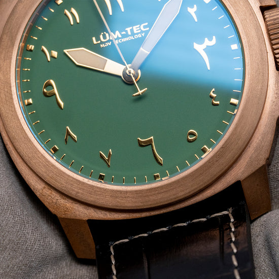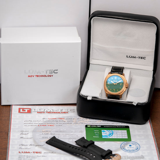 Here we have a 2025 Lum-Tec x Al Meshkah Bronze UAE GCC, a Limited Edition of 50 celebrating 40 years of the GCC cooperation, specifically the Gulf Cooperation Council, comprising Bahrain, Kuwait, Oman, Qatar, Saudi Arabia, and the United Arab Emirates, designed to assist in political, economic, social, and regional matters. This is a collaboration between LÜM-TEC x Al Meshkah. Al Mekshah is rooted in "Al Keshah," which means the ‘start of hunting’. Founded by Mohammad Al Falasi and based in Dubai, a city in the United Arab Emirates (UAE). They offer a wide range of watches for the discerning adventurer. The 44mm bronze cushion case sits comfortably on your wrist, thanks to its short, angled lugs. Its curved flanks lead to a lug-to-lug length of 51mm and a case thickness of 13mm, giving the watch an impressive presence on the wrist. On the right side, a large screw-down crown features high-tech Viton gaskets, protected by crown guards. The smooth bezel features a flat sapphire crystal, AR-coated on the inside, above a striking matte green dial. An outer minute track surrounds gold-toned Hindu–Arabic numerals, marking the hours. Broad sword hands, coated in MDV Technology Lume, are complemented by a tapered second hand. At noon, we have the LÜM-TEC motif. On the reverse, a screw-down sapphire exhibition case back houses an automatic Sellita SW200-1, 26 jewels, beating at 28,800 beats per hour. It features hand-winding, hacking seconds, and quick-set date functions for your convenience. It comes paired with two LÜM-TEC 24mm straps with a bronze-tone buckle. This watch is sold with its original LÜM-TEC box and paperwork.