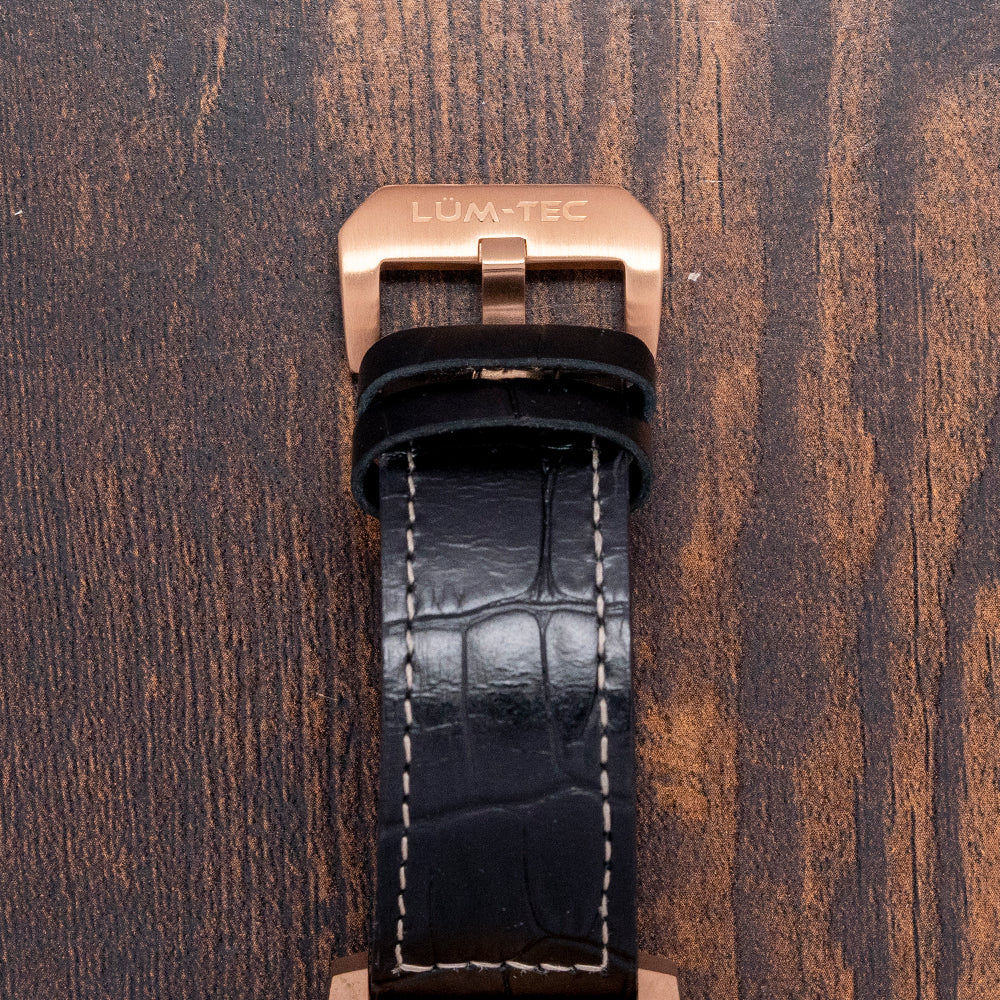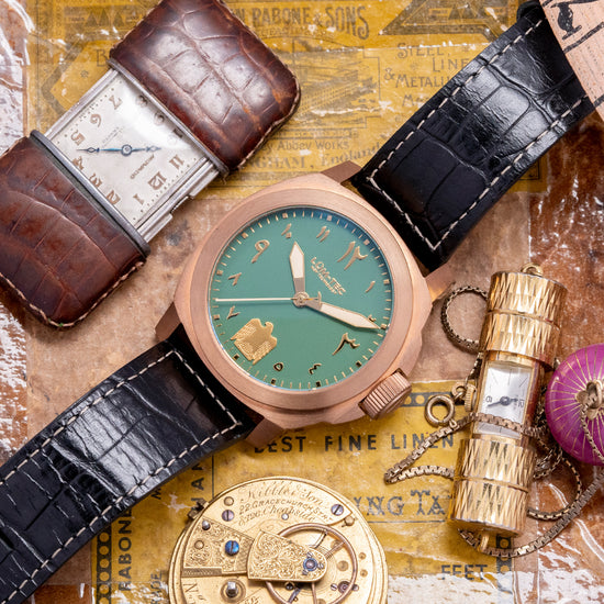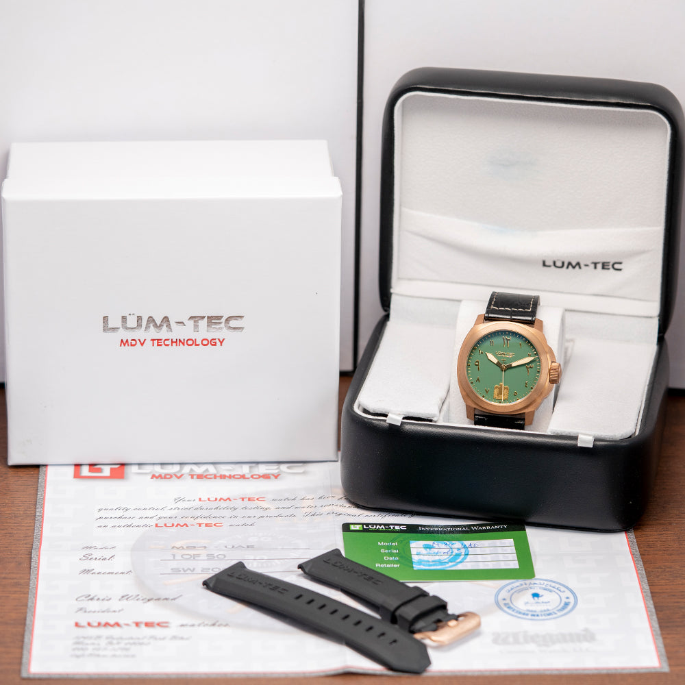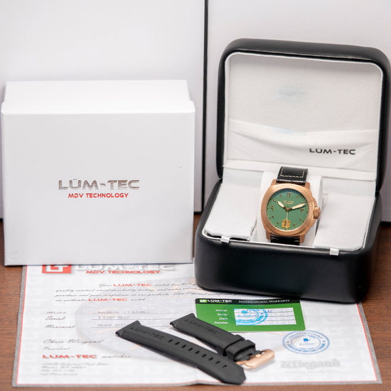Here we have a 2025 LÜM-TEC x Al Meshkah Bronze UAE 'Golden Falcon', a Limited Edition of 50, celebrating 50 years of the UAE National Day. This is a collaboration between LÜM-TEC x Al Meshkah. Al Mekshah is rooted in "Al Keshah," which means the ‘start of hunting’. Founded by Mohammad Al Falasi and based in Dubai, a city in the United Arab Emirates (UAE). They offer a wide range of watches for the discerning adventurer. The 44mm bronze cushion case sits comfortably on your wrist, thanks to its short, angled lugs. Its curved flanks lead to a lug-to-lug length of 51mm and a case thickness of 13mm, giving the watch an impressive presence on the wrist. On the right side, a large screw-down crown features high-tech Viton gaskets, protected by crown guards. The smooth bezel features a flat sapphire crystal, AR-coated on the inside, above a striking matte green dial. An outer minute track surrounds gold-toned Hindu–Arabic numerals marking the hours. Broad sword hands, also coated in MDV Technology Lume, are complemented by a tapered second hand. At noon, we have the LÜM-TEC motif and at 6 o’clock, the Golden Falcon, the national symbol of the UAE. On the reverse, a screw-down sapphire exhibition case back houses an automatic Sellita SW200-1, 26 jewels, beating at 28,800 beats per hour. It features hand-winding, hacking seconds, and quick-set date functions for your convenience. It comes paired with two LÜM-TEC 24mm straps with a bronze-tone buckle. This watch is sold with its original LÜM-TEC box and paperwork.