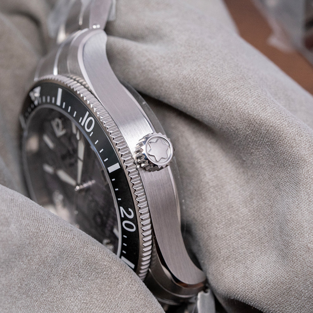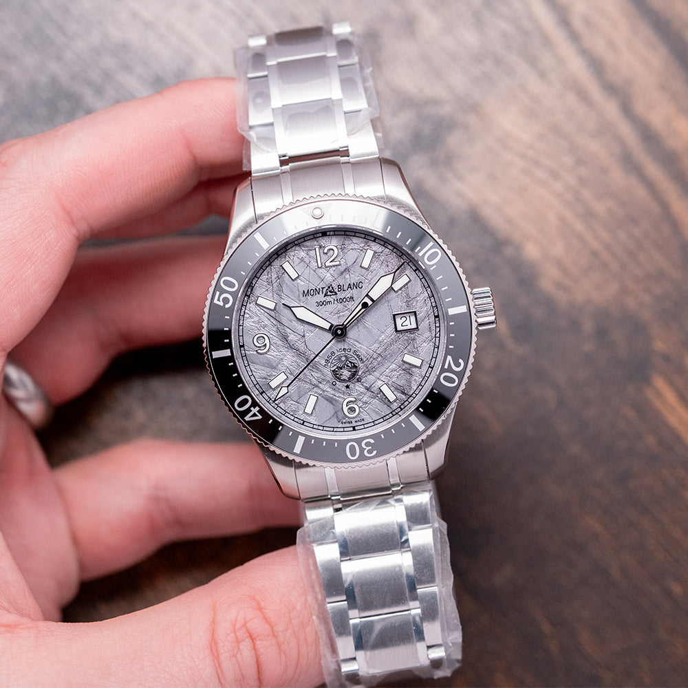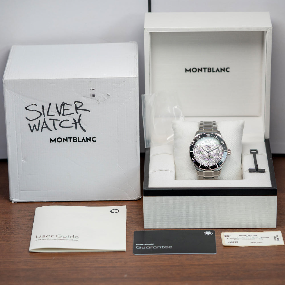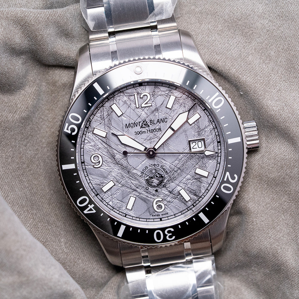 Here we have a 2025 Montblanc Iced Sea Automatic MB130793, part of their 1858 collection, which is inspired by the long history of watchmaking in Minerva, this watch takes its inspiration from the majestic Mer de Glace (Sea Ice), the largest glacier in France, and a major tourist attraction in the Chamonix valley, located on the northern side of the Mont Blanc massif in the French Alps. Featuring a 41mm brushed and polished stainless steel case that curves over your wrist with tapered lugs. Its chamfered, polished edge flows across its curvaceous flanks, leading to a lug-to-lug length of 50.5mm and a case thickness of 12.5mm, giving the watch an impressive wrist presence. On the right side, a screw-down, deeply knurled crown capped with the Montblanc emblem in relief. A unidirectional, deep knurled bezel features a black ceramic 60-minute scale in white numerals and markings supporting a domed box sapphire crystal double AR-coated above an incredible grey glacier polished and lacquered textured dial, created using Gratte-boisé. This very old traditional technique involves using a wooden tool to create a textured effect. An outer minute railroad surrounds applied rhodium-coated Arabic and baton indexes filled with Super-LumiNova, marking the hours. At 3 o’clock, a framed date window. Elegant syringe-style rhodium-coated hands are complemented by an arrow-pointed sweeping second hand. At noon, we have the Montblanc motif ‘300m-1000ft’ printed underneath, conforming to ISO 6425 standards in diving, and at 6 o’clock, a disc representing the Mer de Glace ‘1858 Iced Sea’ completes this stunning timepiece. On the reverse, a screwed-down solid case back is engraved with the watch's details around its edge and features a striking 3D engraved Glacier and diver in the centre. Inside, the automatic MB Cal. 24.17, 25 jewels, beats at 28,800 beats per hour, with a base of the Sellita SW200-1A, it has hacking seconds and a quick-set date for your convenience. It comes paired with its 20mm polished and brushed stainless steel bracelet secured by a signed push-button deployant clasp; all links are provided. This watch is sold with its original Montblanc Box and paperwork.