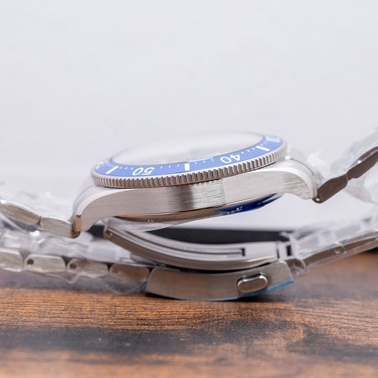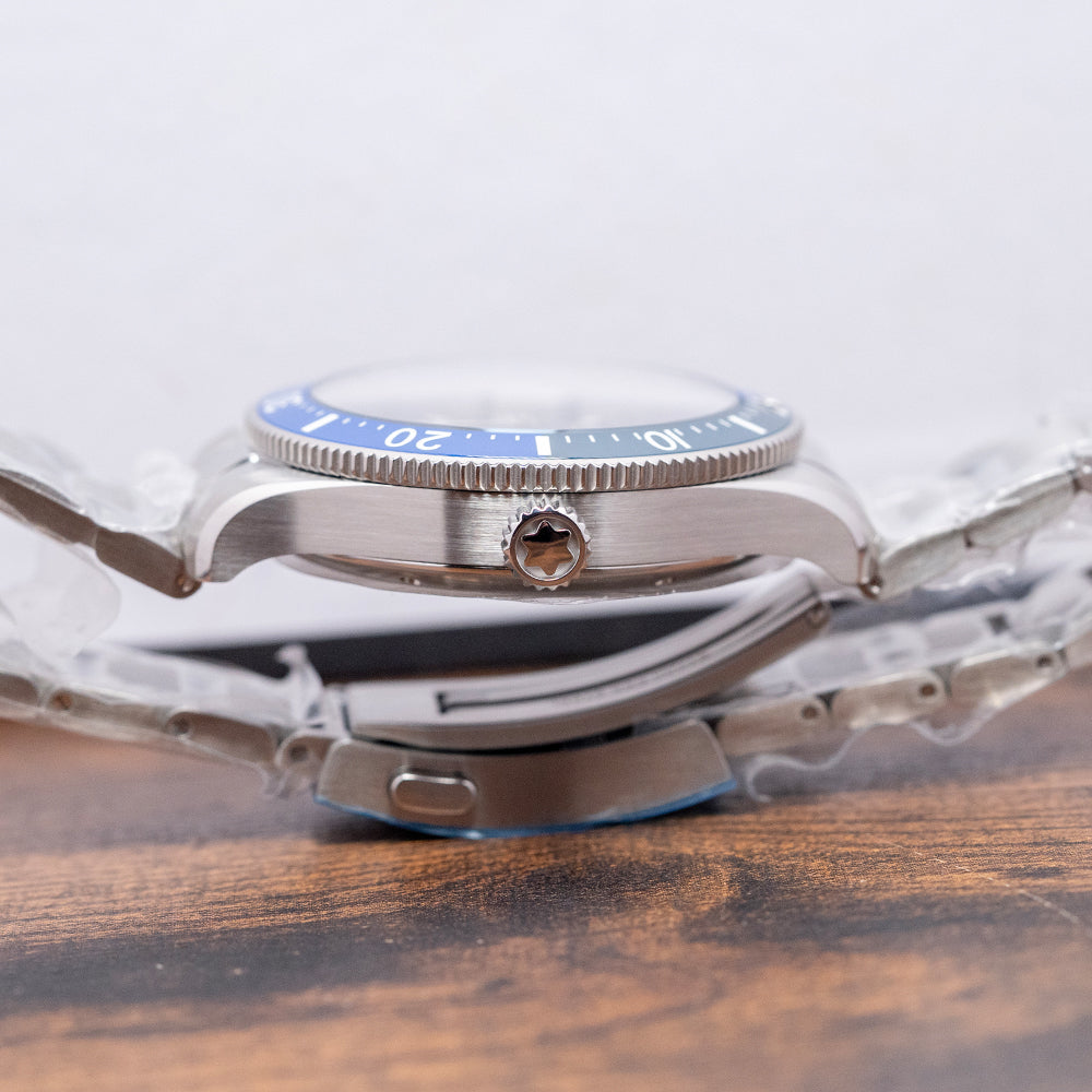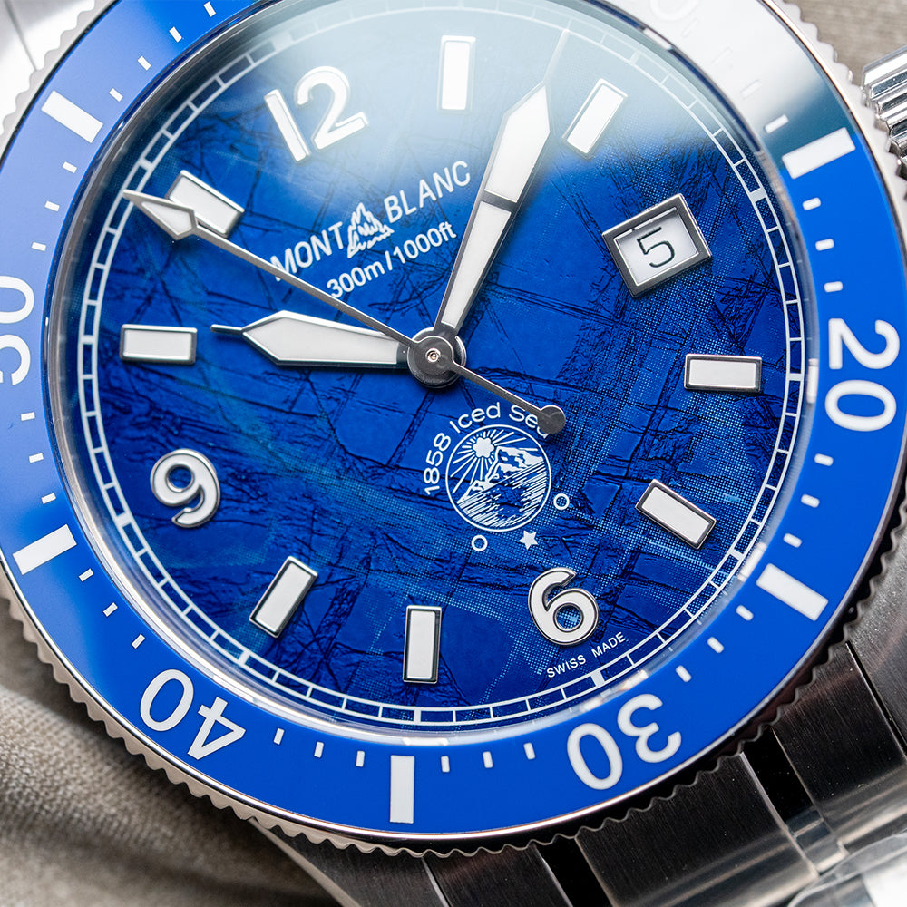 Here we have a 2025 Montblanc Iced Sea Automatic Blue 129369, part of their 1858 collection, which is inspired by the long history of watchmaking in Minerva, this watch takes its inspiration from the majestic Mer de Glace (Sea Ice), the largest glacier in France, and a major tourist attraction in the Chamonix valley, located on the northern side of the Mont Blanc massif in the French Alps. Featuring a 41mm brushed and polished stainless steel case that curves over your wrist with tapered lugs. Its chamfered, polished edge flows across its curvaceous flanks, leading to a lug-to-lug length of 50.5mm and a case thickness of 12.5mm, giving the watch an impressive wrist presence. On the right side, a screw-down, deeply knurled crown capped with the Montblanc emblem in relief. A unidirectional, deep-knurled bezel features a blue ceramic 60-minute scale with white numerals and markings, supporting a domed box sapphire crystal double AR-coated above an incredible blue glacier-polished and lacquered textured dial, created using Gratte-boisé. This very old traditional technique involves using a wooden tool to create a textured effect. An outer minute railroad surrounds applied rhodium-coated Arabic and baton indexes filled with Super-LumiNova, marking the hours. At 3 o’clock, a framed date window. Elegant syringe-style rhodium-coated hands are complemented by an arrow-pointed sweeping second hand. At noon, we have the Montblanc motif ‘300m-1000ft’ printed underneath, conforming to ISO 6425 standards in diving, and at 6 o’clock, a disc representing the Mer de Glace ‘1858 Iced Sea’ completes this stunning timepiece. On the reverse, a screwed-down solid case back is engraved with the watch's details around its edge and features a striking 3D engraved Glacier and diver in the centre. Inside, the automatic MB Cal. 24.17, 25 jewels, beats at 28,800 beats per hour, with a base of the Sellita SW200-1A; it has hacking seconds and a quick-set date for your convenience. It comes paired with its 20mm polished and brushed stainless steel bracelet secured by a signed push-button deployant clasp; all links are provided. This watch is sold with its original Montblanc Box and paperwork.