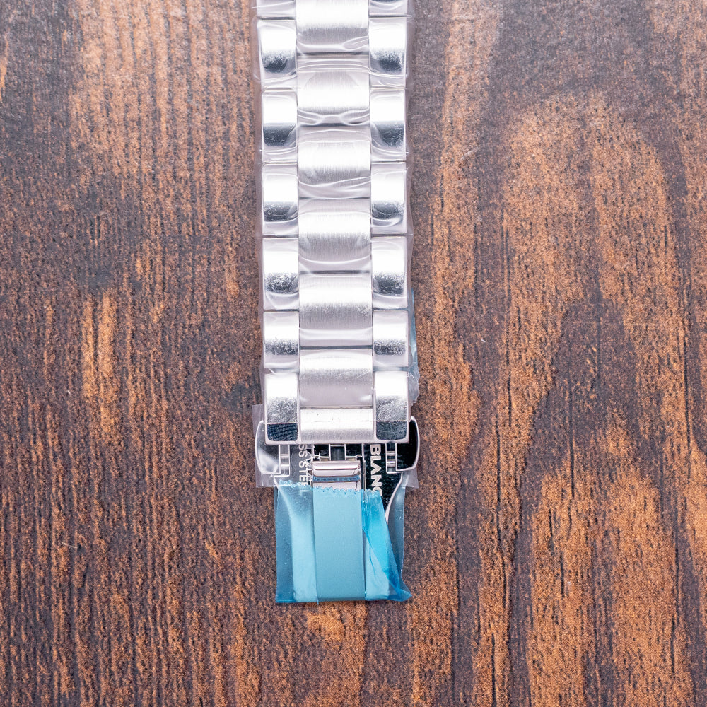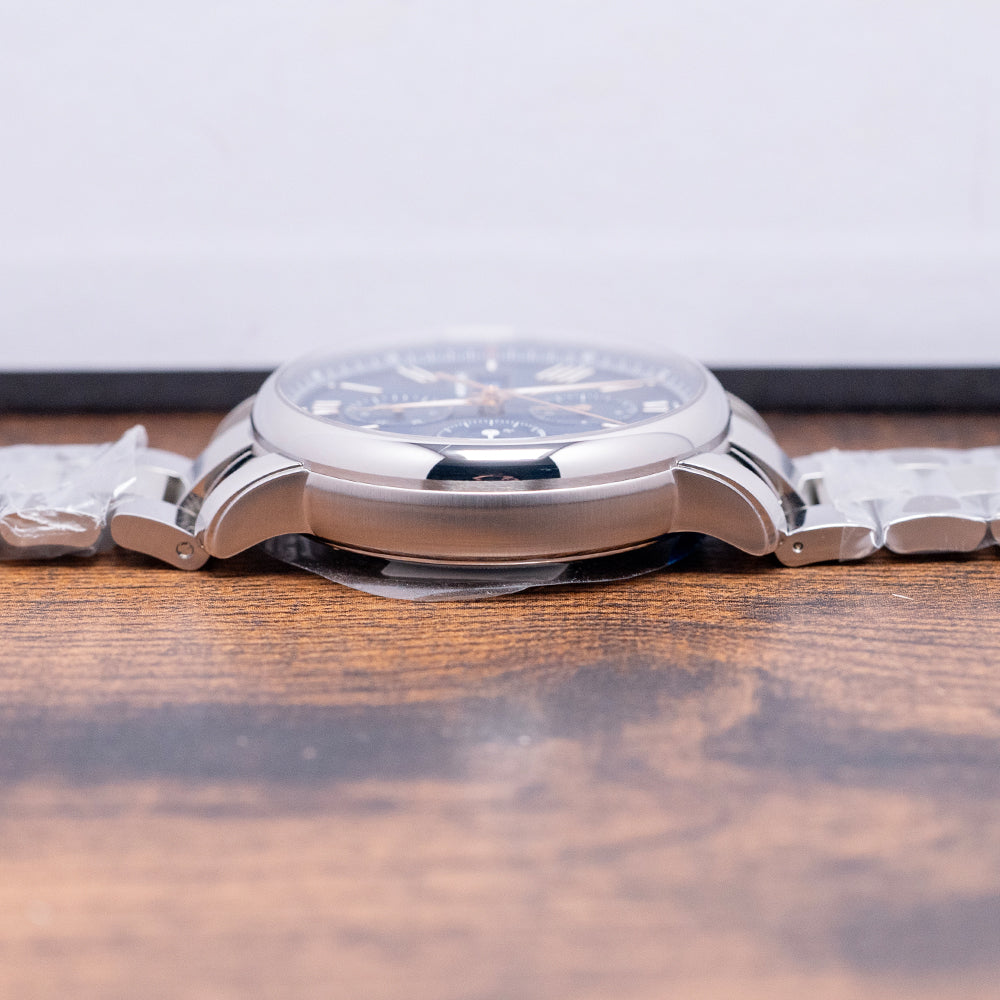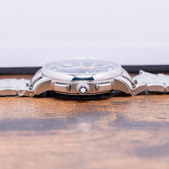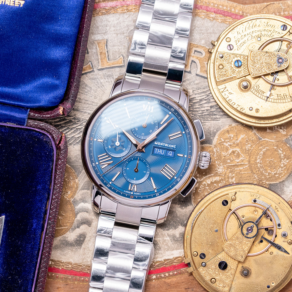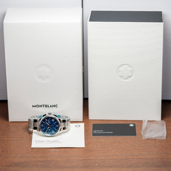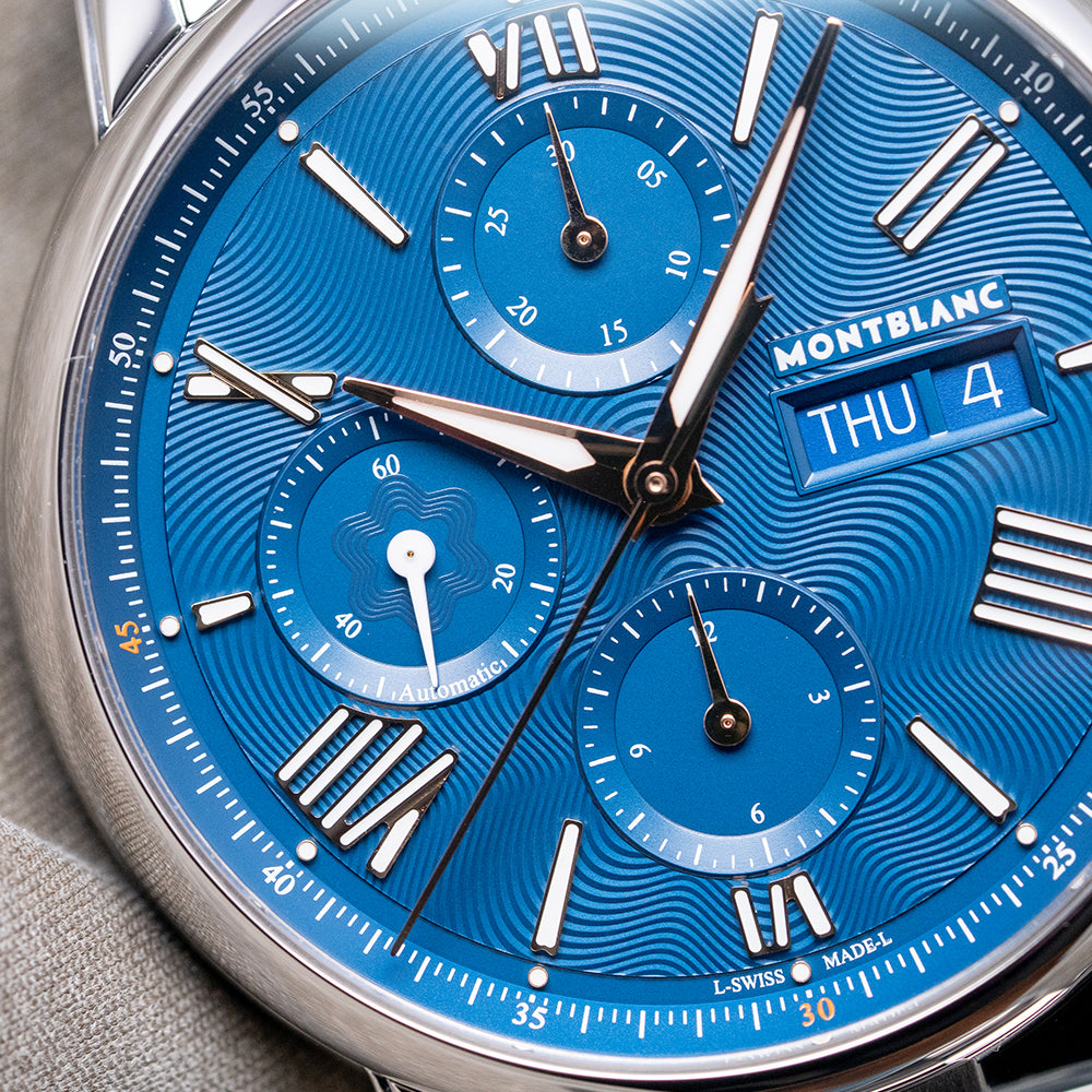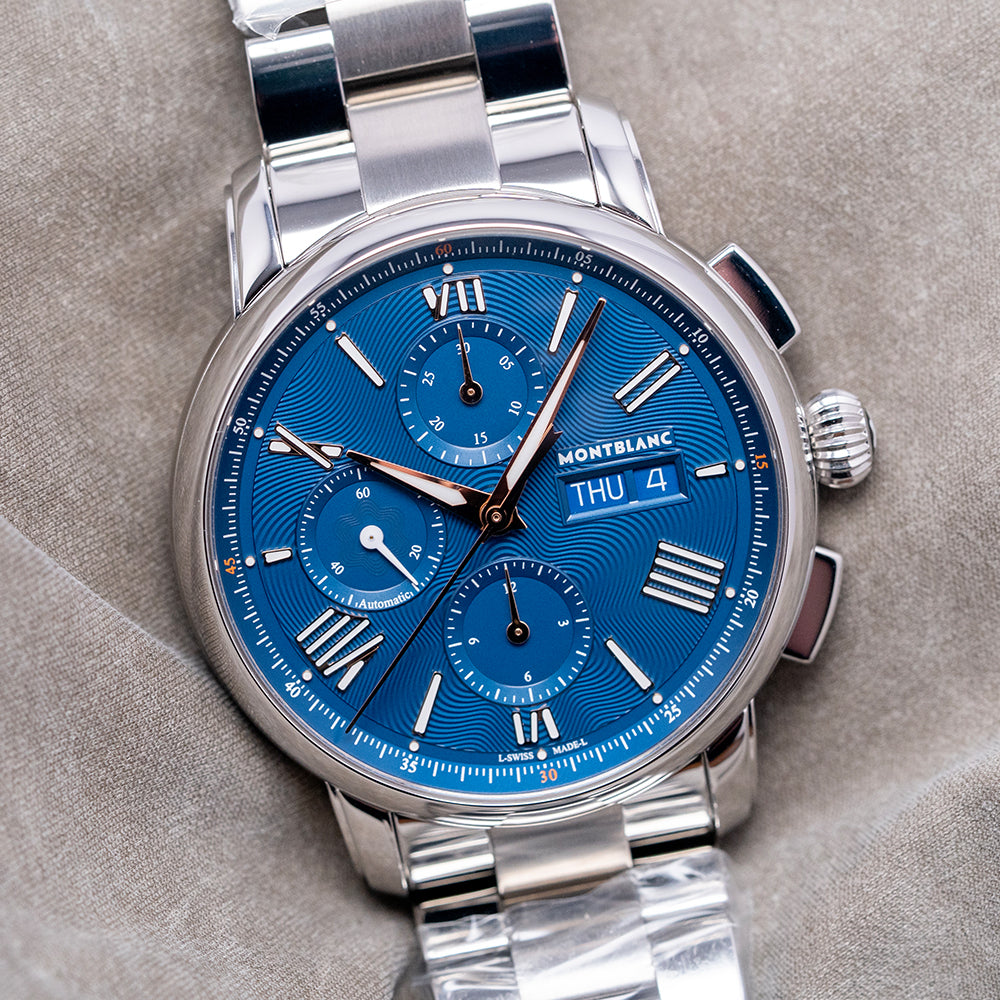 Here is a 2025 Montblanc Star Legacy Chronograph 130972, Limited Edition of 800 pieces. Featuring a round polished 43mm stainless steel case that curves over your wrist with thick stepped tapered lugs. Its curved flanks lead to a comfortable 50.5mm case lug-to-lug length and a case thickness of 15mm, giving the watch an impressive wrist presence. On the right, we have the rectangular chronograph pushers and a deep-knurled, onion-style, signed crown in the centre. A smooth, polished bezel holds a domed sapphire crystal above a stunning dial with the iconic blue exploding star guilloché pattern. An outer minute chapter ring, precisely executed with red accents, surrounds applied rose-gold coated Roman numerals and batons filled with Super-LumiNova, marking the hours. The chronograph consists of three recessed registers. 30 minutes at noon, 12 hours at 6 o’clock, and finally running seconds at 9 o’clock. A colour-matched framed Day/Date sits at 3 o’clock. Elegant rose-gold-coated Dauphine hands filled with lume are complemented by a tapered chronograph hand. The Montblanc motif is situated above the Day/Date, and ‘Automatic’ is printed at the bottom of the running seconds, completing this dynamic sports watch. On the reverse, a screwed-down sapphire exhibition case back engraved with the watch's details, inside an automatic Montblanc Cal. MB 25.07, 25 jewels, beating at 28,800 beats per hour based on the Sellita SW500-1 with a signed rotor and blued screws. It comes paired with its 21mm Montblanc 3-link stainless steel bracelet secured by a concealed push-button butterfly clasp; all links are provided. This watch is sold with its original Montblanc Box and paperwork.