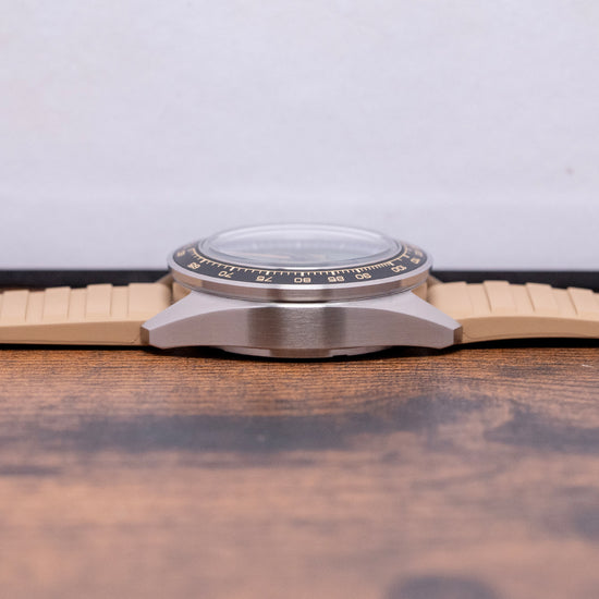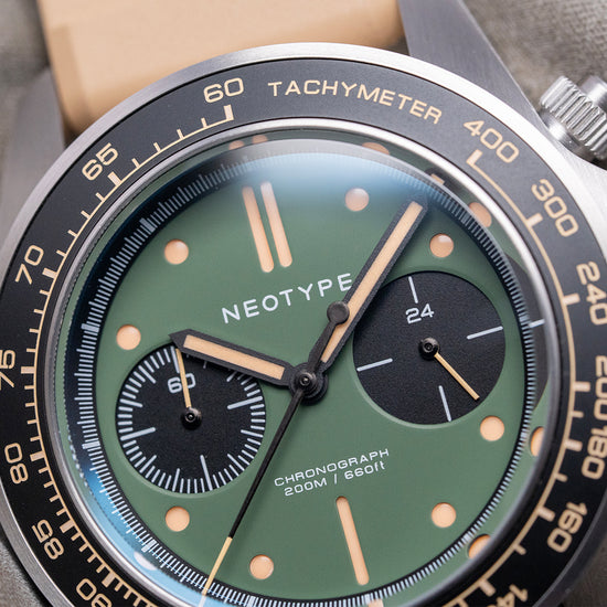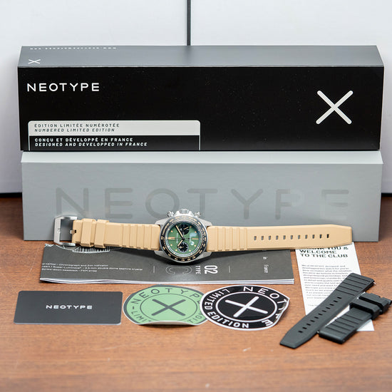 Here we have a 2025 Neotype LM02 Type C 'Green + Old Radium' Limited to 150 pieces. Inspired by the classic divers of the past, featuring a 41mm brushed stainless steel case that sits comfortably on your wrist with flat-ended, tapered lugs. Its flanks feature crisp lines, with a lug-to-lug length of 48.5mm and a case thickness of 15mm, giving the watch an impressive wrist presence. On the right side, screw-down pushers and a signed screw-down crown are protected by crown guards. A fixed bezel holds a matte black ceramic insert with a Tachymeter scale coated in Old Radium Super-LumiNova. The 3.5mm double-domed sapphire crystal sits above a distinctive green sandwich bicompax dial. An outer minute chapter ring, precisely executed, surrounding cut-out discs and the rounded baton indexes showing through Old Radium Super-LumiNova, marking the hours. The contrasting bicompax has, at 3 o’clock, a recessed 24-hour black register with a crosshair and an Old Radium-coated stick hand, and, at 9 o’clock, a recessed running seconds black register with a crosshair and an Old Radium-coated stick hand. Slender baton hands coated in the same lume are complemented by an Old radium-tipped chronograph hand. At noon, we have the Neoptype motif, and at 6 o’clock, ‘Chronograph 200M/660FT’, completes this striking sports bicompax chronograph. On the reverse, a screw-down solid case back featuring the watch details around its edge and the Limited number in the centre. Inside a MecaQuartz Seiko Cal. VK64. This mechanical quartz hybrid utilises a tuning fork-type quartz crystal. You get the same kind of mechanical resistance when you engage the pushers, and a satisfying snapback of the chronograph seconds hand on reset. It comes paired with two 22mm FKM rubber straps and a signed pin buckle. This watch is sold with its original Neotype box and paperwork.