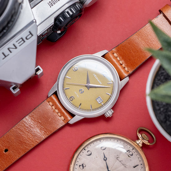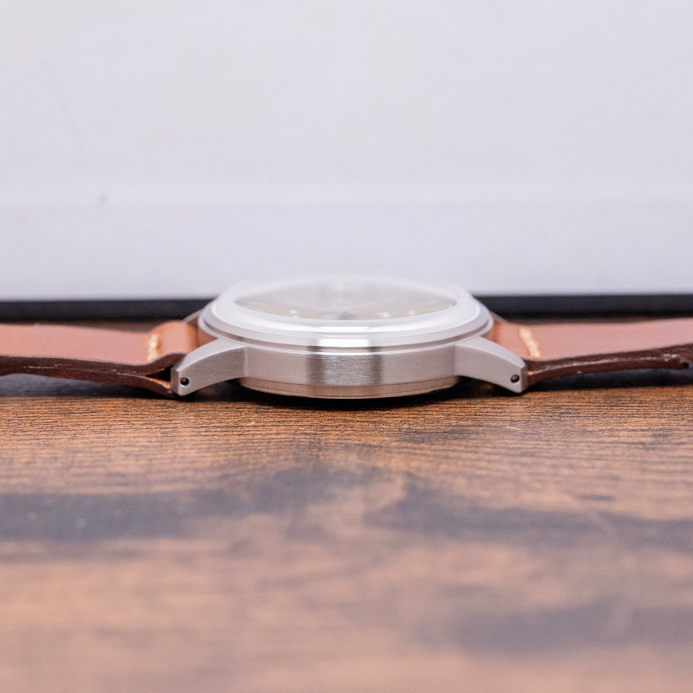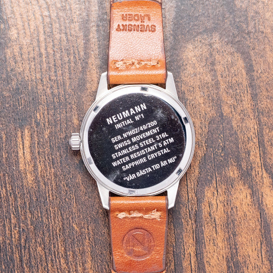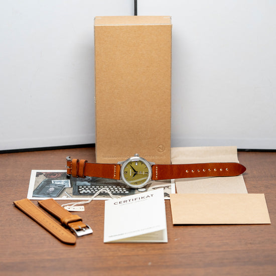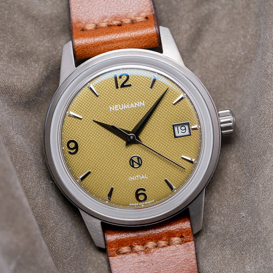 Here we have a 2025 Neumann Initial No.1 Green Textured Dial featuring a brushed 36mm stainless steel case that gently curves over your wrist with finely tapered drilled lugs. Its curved flanks lead to a comfortable lug-to-lug length of 43mm and a case thickness of 10mm. On the right side, a deep knurled signed crown. A smooth bevel-edged bezel holds a box-shaped sapphire crystal above a striking Green Textured Dial. An outer minute track surrounds applied polished numerals, and facet-edged dagger indexes marking the hours. At 3 o’clock, a framed date window. Elegant steel Dauphine hands are complemented by a tapered second hand. The polished surfaces magically play with the light as you rotate your wrist. At noon, we have the Neumann logo, and at 6 o’clock, the ‘N’ motif and ‘Initial’ printed underneath completes this vintage-inspired timepiece. On the reverse, a screw-down solid case back engraved with the watch's details, housing a Quartz Ronda movement. It comes paired with two 18mm leather straps and stainless steel pin buckles. This watch is sold with its original Neumann box, swing tag and paperwork.