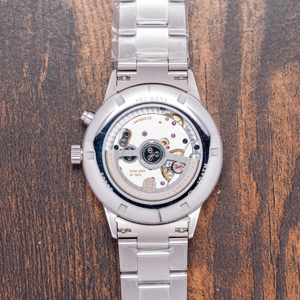 Here we have a colourful 2025 Nomos Club Sport Neomatik Worldtimer Blue, featuring a polished 40mm stainless steel case that sits comfortably on your wrist thanks to the tapered lugs. Its curved flanks lead to a lug-to-lug length of 48mm and a case thickness of 10mm. On the right side, there is a pusher to rotate the outer cities and a deep, knurled, screw-down crown; a helpful red ring indicates whether it has been fully screwed in. On the left side, at eight o’clock, there is a recessed pusher that helps to reset the local time in the 24-hour subdial; the setting pin is provided in the box. The smooth, polished bezel holds a domed, AR-coated sapphire crystal above a distinctive galvanised sunburst blue dial. A recessed, rotatable 24-City ring in blue with a red line indicator surrounds small numerals indicating the hour difference from GMT ‘0’ and Super-lumiNova-coated Arabic numerals marking the hours, at 3 o’clock, a 24-hour GMT Night/Day subdial in light blue and dark blue with a white stick hand, and at 6 o’clock, a running seconds subdial with a white stick hand, slender rhodium-plated baton hands are filled with Super-LumiNova. The Nomos Neomatik motif sits at noon, completing this distinctive traveller's companion. On the reverse, a screw-down sapphire exhibition case back is etched with the watch's details, featuring an in-house automatic Nomos Cal. DUW3202, 37 jewels, beating at 21,600 beats per hour, fitted with a bidirectional skeletonised Nomos rotor, the movement is rhodium-plated, decorated with attractive Glashütte striping, blued screws and NOMOS perlage. It comes paired with its unused 20mm 3-link stainless steel quick-release bracelet, secured by a signed push-button deployant clasp, with all links provided. This watch is sold with its original Nomos box and Nomos paperwork.
