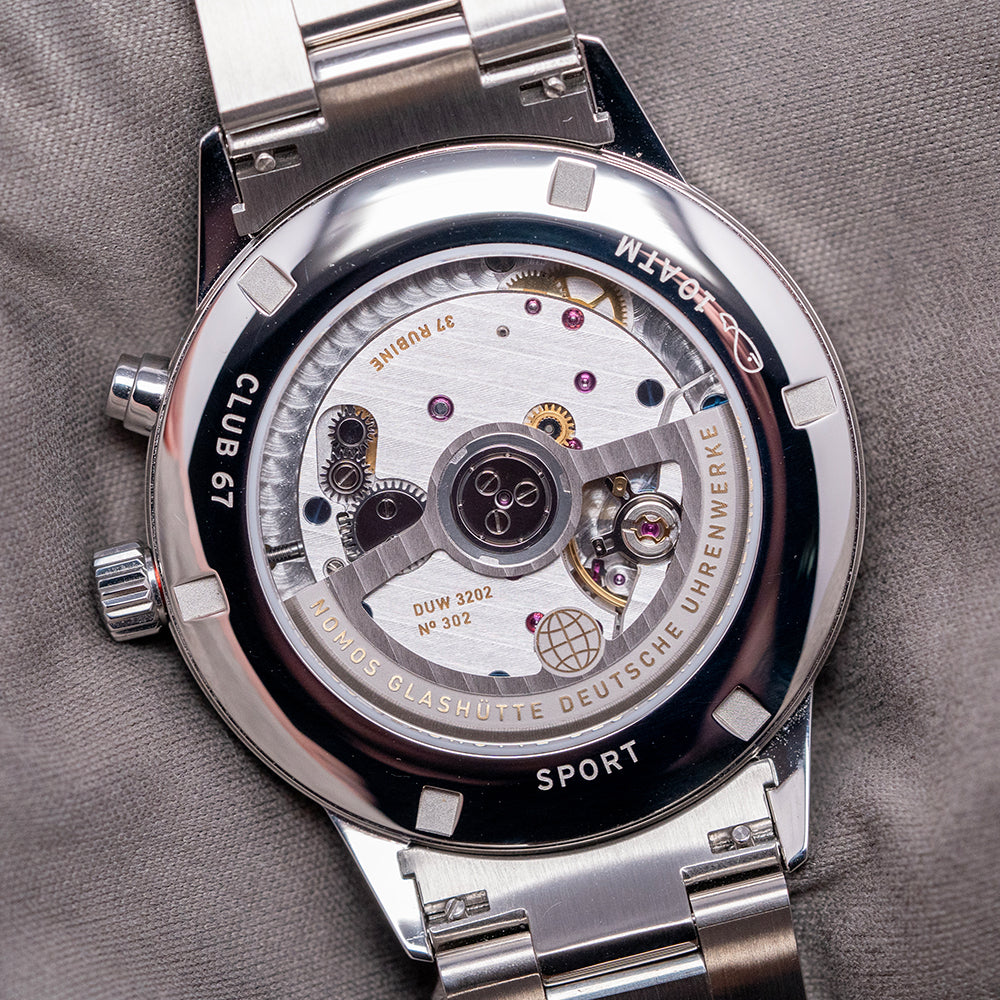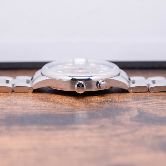 Here we have a colourful 2025 Nomos Club Sport Neomatik Worldtimer Silver 791, featuring a polished 40mm stainless steel case that sits comfortably on your wrist thanks to the tapered lugs. Its curved flanks lead to a lug-to-lug length of 48mm and a case thickness of 10mm. Down the right side, there is a pusher to rotate the outer cities and a deep knurled signed screw-down crown; a helpful red ring indicates if it has been fully screwed in. On the left side, at eight o’clock, there is a recessed pusher that helps to reset the local time in the 24-hour subdial; the setting pin is provided in the box. The smooth, polished bezel holds a domed sapphire crystal AR-coated on both sides above a distinctive galvanised rhodium-plated sunburst silver dial. A recessed, rotatable 24-City ring in blue with a red line indicator surrounds small numerals indicating the hour difference from GMT ‘0’ and Super-lumiNova-coated Arabic numerals marking the hours, at 3 o’clock, a 24-hour GMT Night/Day subdial in blue and red with a red stick hand, and at 6 o’clock, a running seconds subdial with a white stick hand, slender rhodium-plated baton hands are filled with Super-LumiNova. The Nomos Neomatik motif sits at noon, completing this distinctive traveller's companion. On the reverse, a screw-down sapphire exhibition case back is etched with the watch's details, featuring an in-house automatic Nomos Cal. DUW3202, 37 jewels, beating at 21,600 beats per hour, fitted with a bidirectional skeletonised Nomos rotor, the movement is rhodium-plated, decorated with attractive Glashütte striping, blued screws and NOMOS perlage. It comes paired with its 20mm 3-link stainless steel quick-release bracelet, secured by a signed push-button deployant clasp, with all links provided. This watch is sold with its original Nomos box and Nomos paperwork.