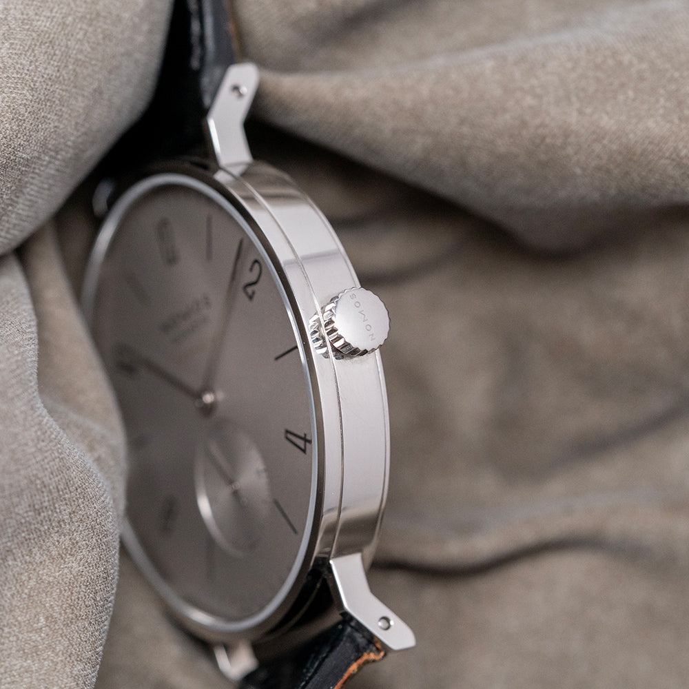 Here we have a 2025 Nomos Tangente Neomatik Platinum Grey 144 featuring a curvaceous 39mm polished stainless steel case that sits comfortably on your wrist, with the signature thin, angled, drilled lugs leading to a lug-to-lug length of 47.5mm and a case thickness of just 7mm. At 3 o’clock, a signed polished crown with a coin edge for grip. A thin, smooth, polished bezel holds a flat sapphire crystal, AR-coated on the inside, over a galvanised rhodium-plated Platinum Grey dial. An outer minute track surrounds the characteristic Tangente numeral and stick indexes marking the hours. Its Bauhaus-infused aesthetic is pleasing to the eye. Rhodium-plated stick hands sit above a recessed concentric circular patterned sundial, complete with its Rhodium-plated stick hand. At noon, we have the Nomos Glashütte motif and ‘neomatik’ underneath, which completes this sophisticated dress watch. On the reverse, a screw-down sapphire exhibition caseback, inside an automatic Nomos Cal. DUW3001, 27 jewels, 21,600 beats per hour. The movement features the NOMOS Swing System, the brand's in-house escapement, which provides excellent accuracy. Exquisite Cotes de Geneve and perlage decoration cover this movement. Tempered blued screws and the skeletonised rotor show off the attention to detail that a Nomos watch gives you. It comes paired with its NOMOS 19mm Horween Cordovan leather strap with a signed pin buckle. This watch is sold with its original NOMOS presentation box and paperwork.