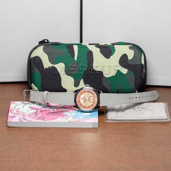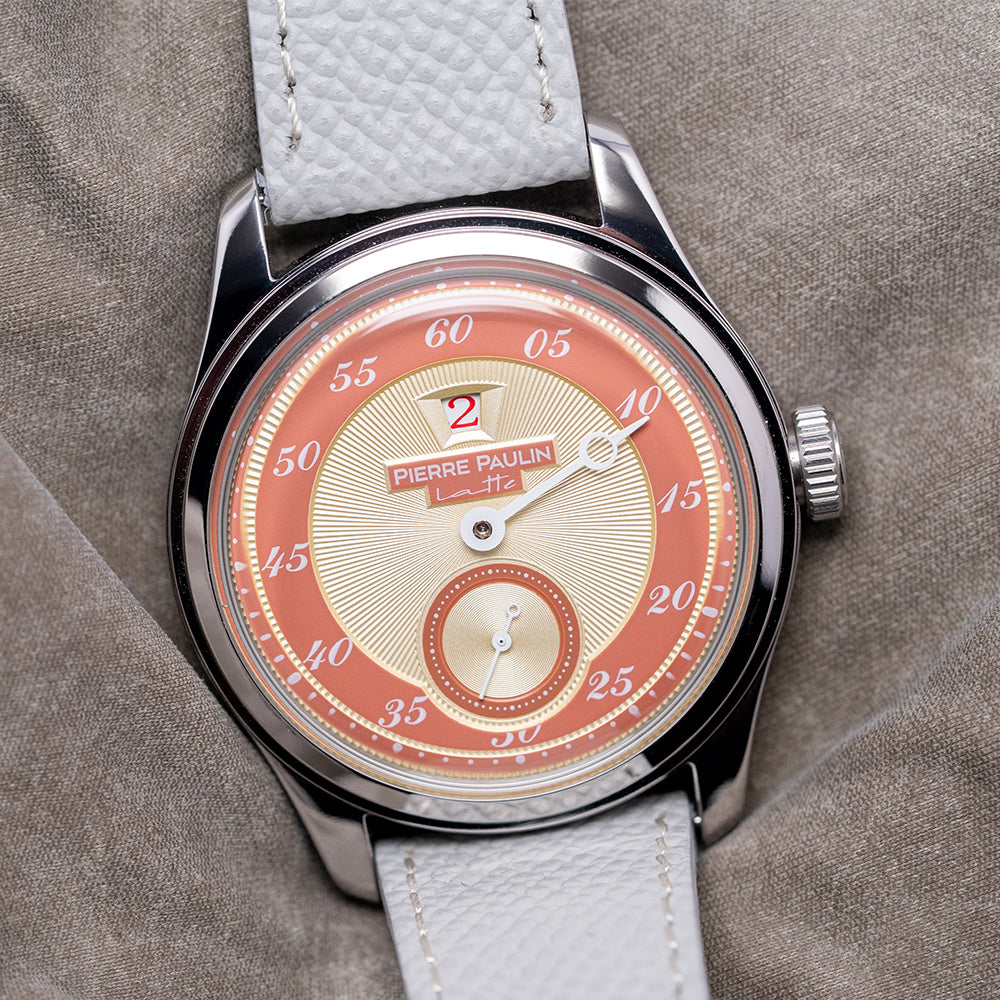 Here we have a 2025 Pierre Paulin Jumping Hour Automatic 'Beige Red' featuring a 38mm polished stainless steel case that sits comfortably on your wrist with fine tapered drilled lugs. Its curved flanks lead to a lug-to-lug length of 46.5mm and a case thickness of 13mm. On the right side, a deep knurled crown. A smooth, bevel-edged, polished bezel holds a domed K1 glass crystal above a striking 'Beige Red' jump-hour sector dial. An outer minute track and white numerals marking the minutes sit on a red ring, with beige highlights surrounding a beige sunburst-pattern centre, adding depth and interest. At noon, we have the jump hour with red numerals above the Pierre Paulin motif. The white Breguet-style minute hand sits above the large sub-seconds, complete with a concentric circular pattern and a second hand. On the reverse, a solid case back, inside an automatic Seagull Cal. ST17. It comes paired with its 20mm leather strap and pin buckle. This watch is sold with its original Pierre Paulin box and paperwork.