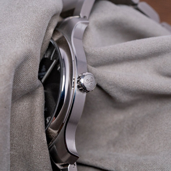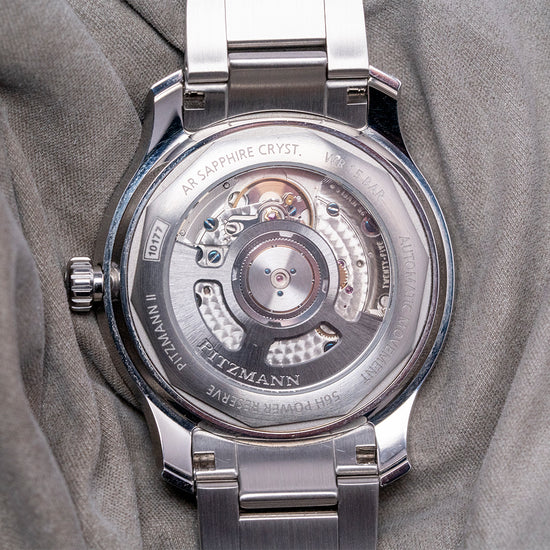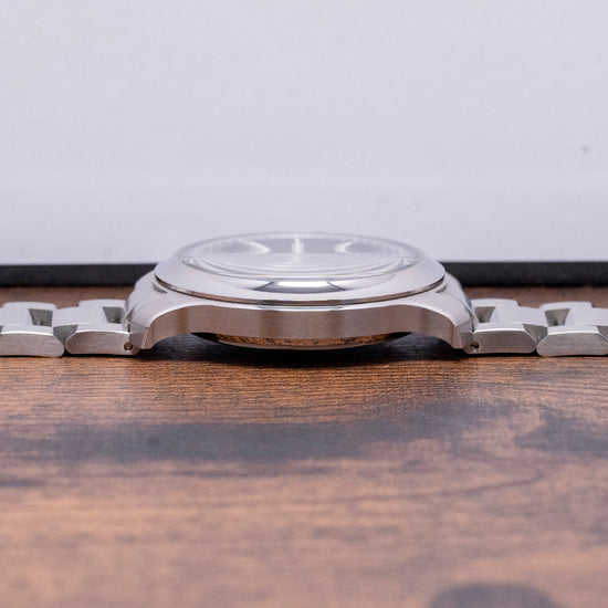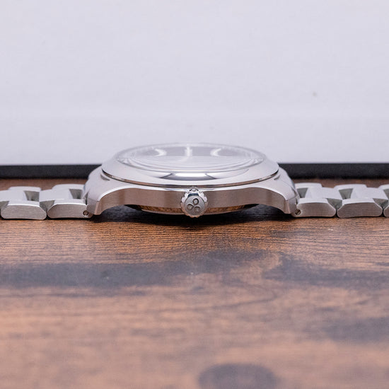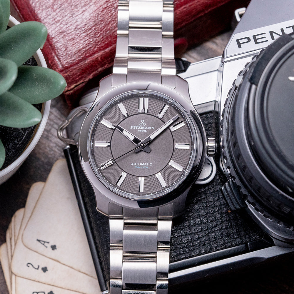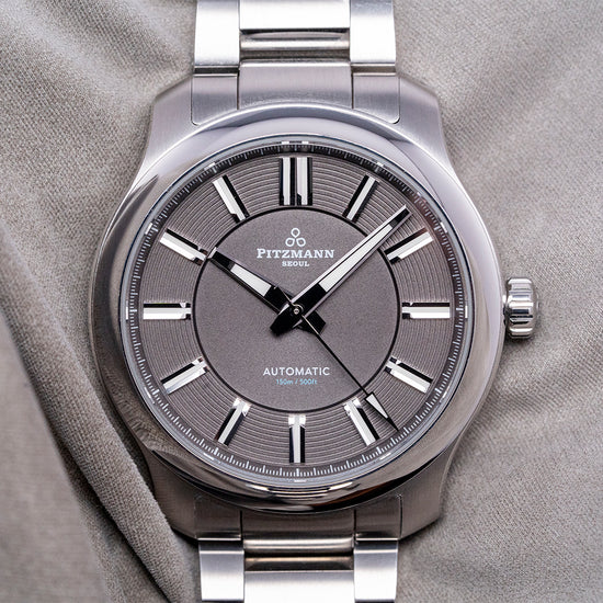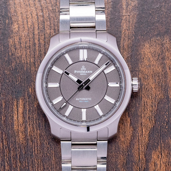 Here we have a 2025 Pitzmann II Grey Dial Seoul Korea Automatic with a 40mm brushed and polished stainless steel case that curves over your wrist thanks to the fat, tapered, sculpted lugs. Its curvaceous flanks, inspired by GIWA, a Korean traditional roof tile, lead to a lug-to-lug length of 46mm and a case thickness of 11mm, ensuring a comfortable fit. On the right side, a signed crown with deep knurling for grip. A smooth, polished bezel holds a flat sapphire crystal AR-coated on the inside above a striking grey sector dial. An outer minute chapter ring, precisely executed, surrounds concentric circles with facet-polished baton indexes filled with SuperLumiNova, marking the hours. Thick, polished steel hands have sharp facet edges matching the indexes and magically catch the light as you rotate your wrist, complemented by an arrow point sweeping second hand. At noon, we have the Pitzmann motif, and at 6 o’clock, ‘Automatic 150m/500ft’ completes this dynamic sports watch. On the reverse, a screw-down exhibition case back engraved with the details of the watch around its edge, inside an Automatic Sellita Cal. SW300-1, 25 jewels, beating at 28,800 beats per hour, it has hand winding and hacking seconds for your convenience, a signed skeletonised bidirectional rotor and the movement is decorated in perlage. It comes paired on a polished stainless steel bracelet secured by a signed push-button released deployant clasp. This watch is sold with its original Pitzmann box and paperwork.