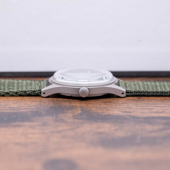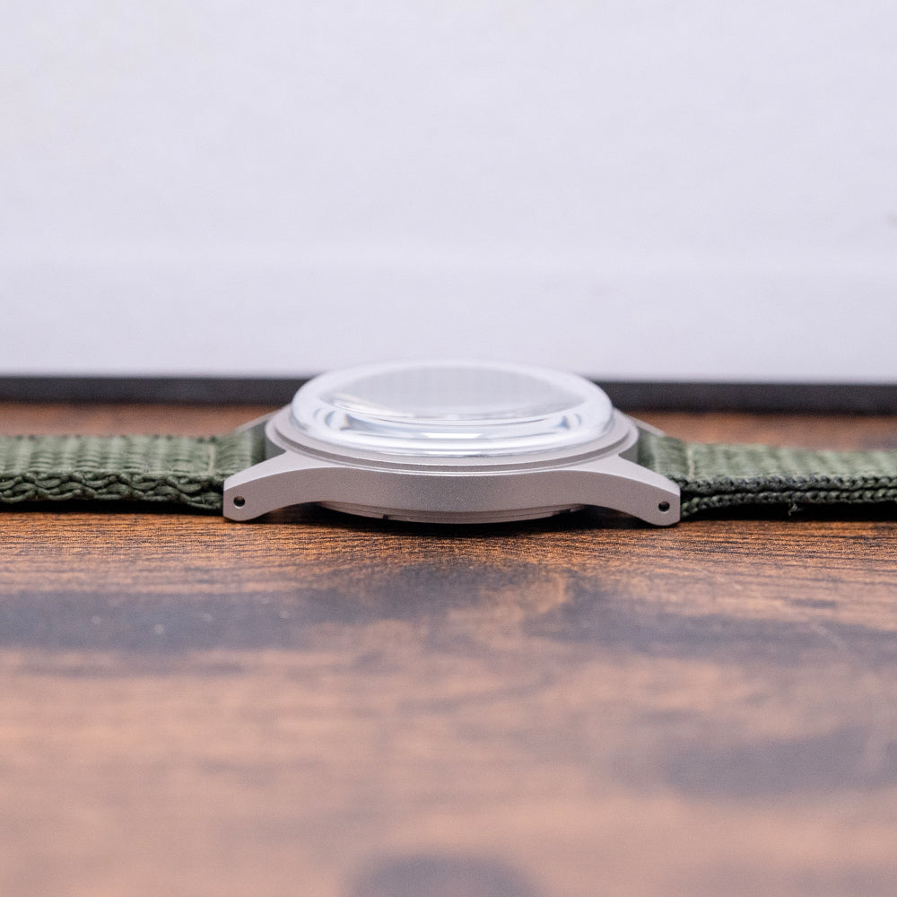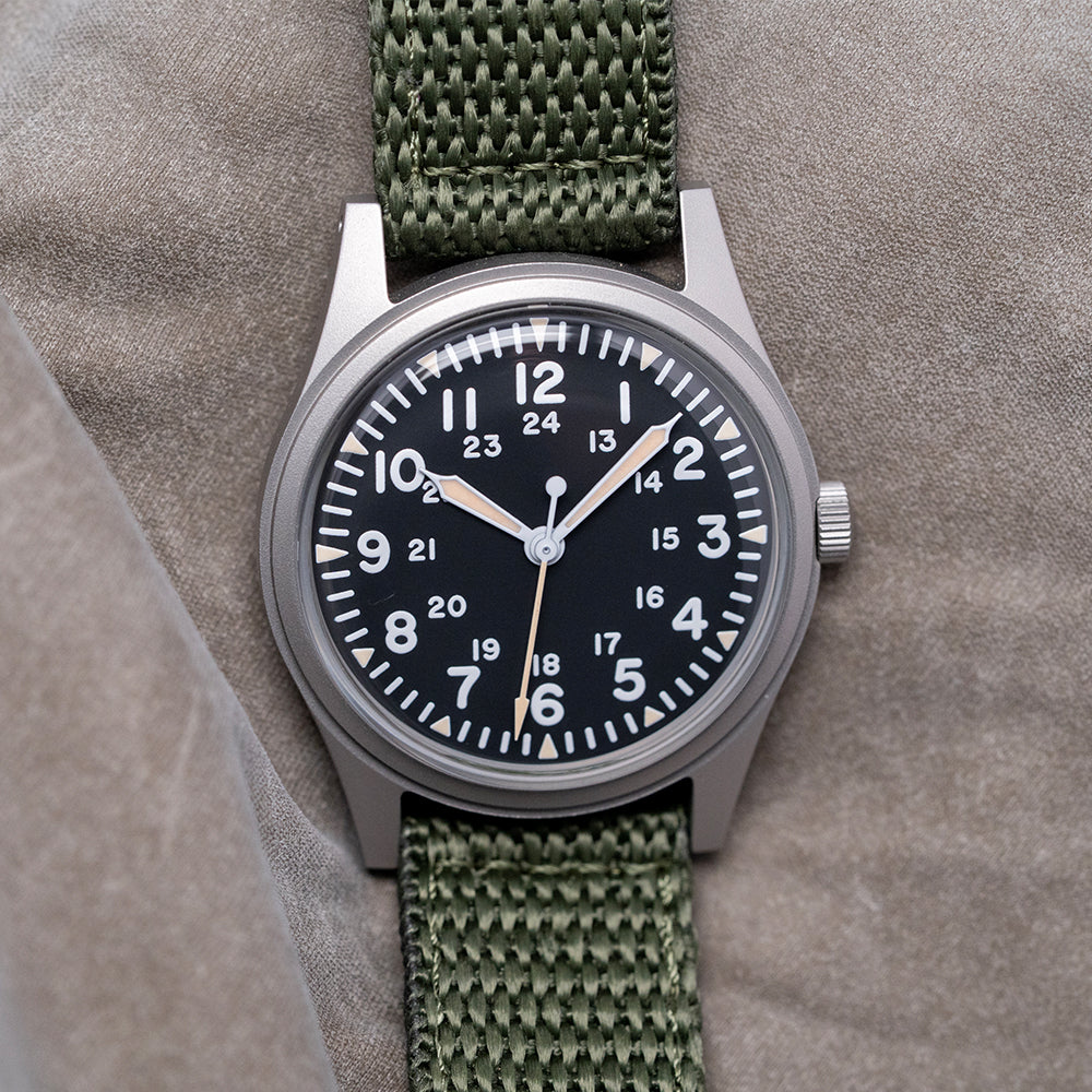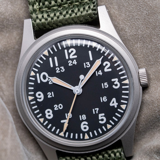 Here we have a 2025 Rdunae RA03 Military-Style Field Watch Quartz, inspired by the Benrus Vietnam-era field watch. Featuring a 34.5mm sandblasted stainless steel round case that sits comfortably on your wrist with tapered flat-ended drilled lugs. Its curved flanks lead to a lug-to-lug length of 41.5mm and a case thickness of 10mm. On the right side, a coin-edged push-pull crown. The smooth bezel holds a K1 mineral crystal above a matte black dial. An outer minute track features triangle hour markers coated in Super-LumiNova, surrounding white 12/24-hour Arabic numerals. White-bordered syringe hands are filled with Super-LumiNova and complemented by an arrow-pointed second hand. On the reverse, a screw-down solid case back stamped with the watch's details, inside a Quartz Miyota Cal. 2035 movement. It comes paired with its 18mm nylon NATO strap and pin buckle.