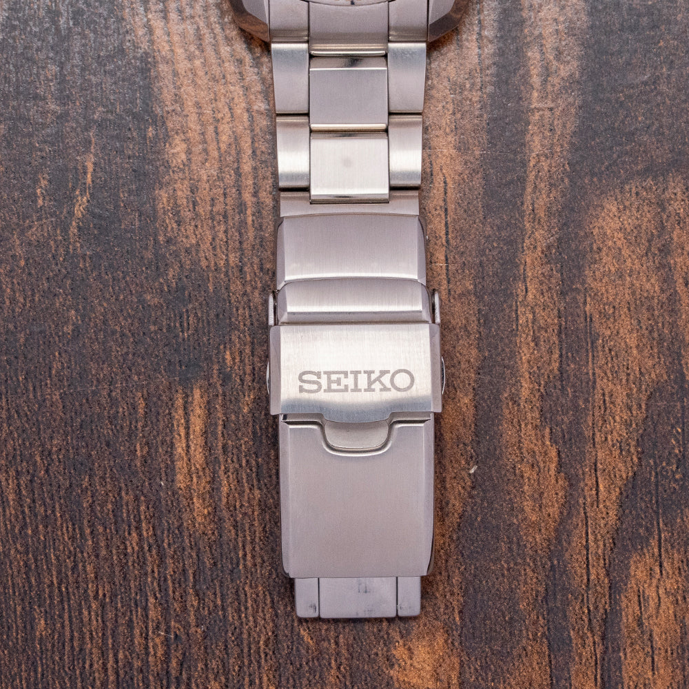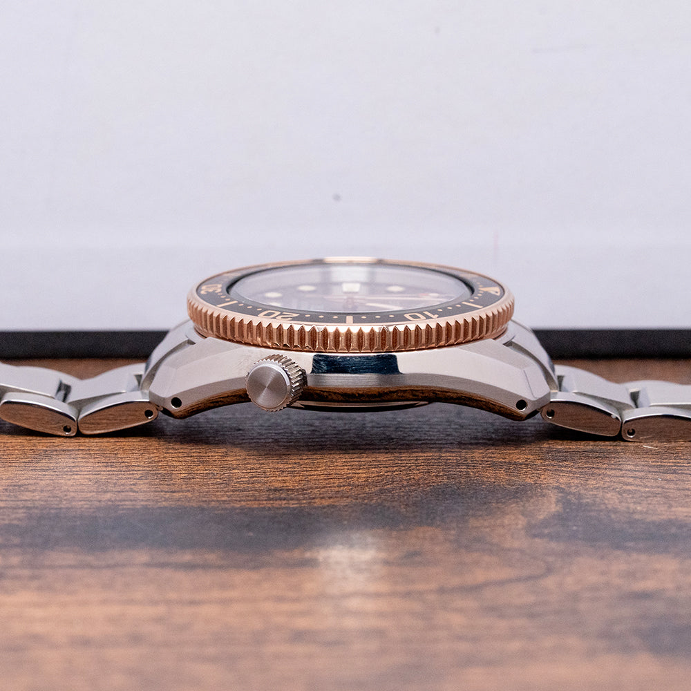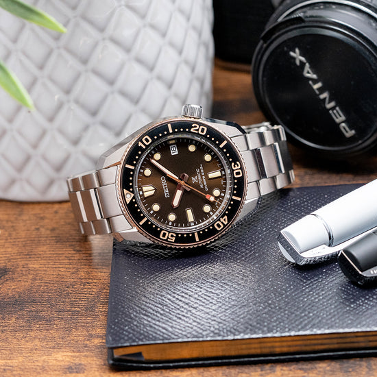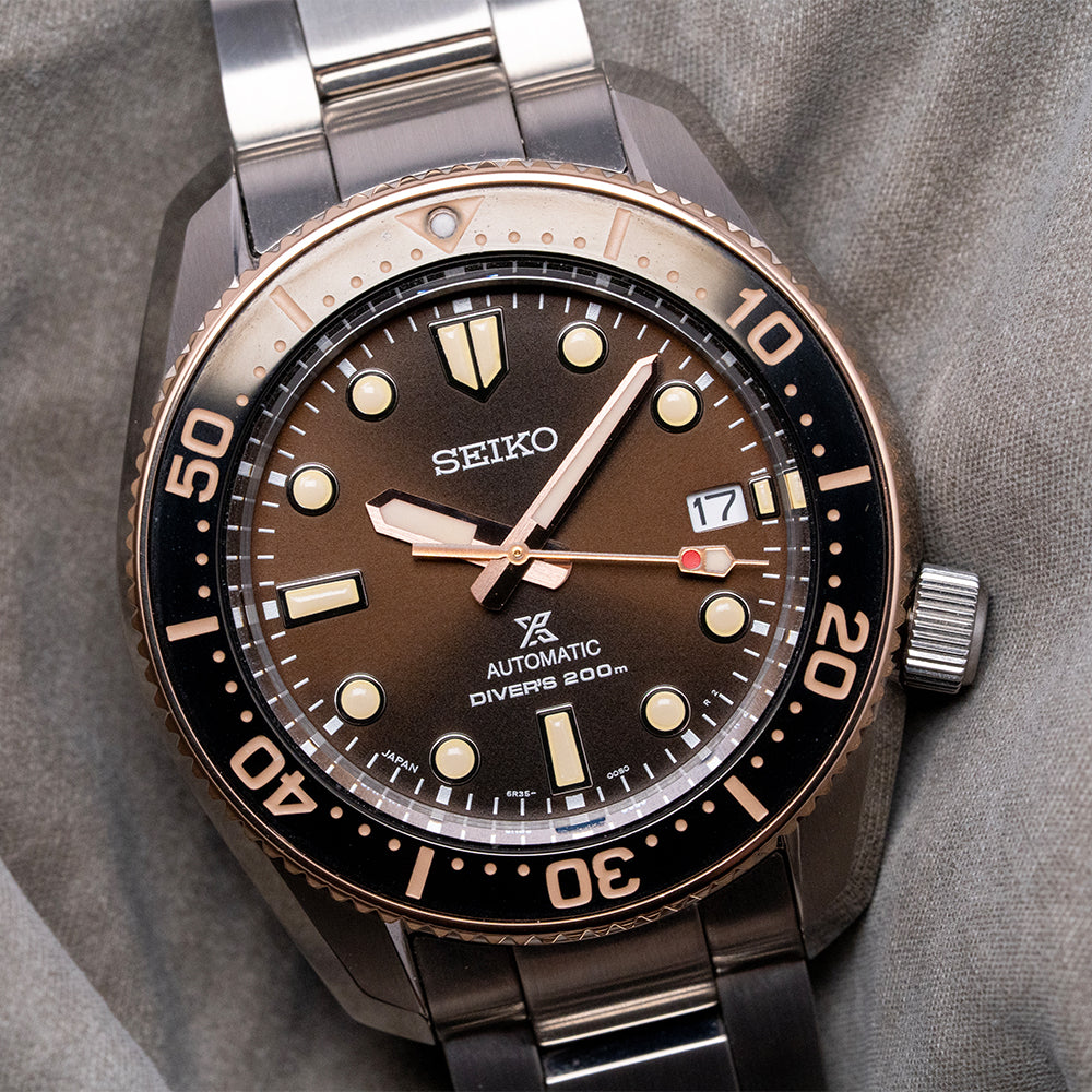 This 2025 Seiko Prospex 1968 Re-Interpretation Boutique SPB240J1 is inspired by Seiko's 1968 Hi-Beat professional dive watch, the ref: 6159-7001. This watch is a modern interpretation of that "Professional" dive watch and is exclusive to the Seiko Boutique. A 42mm brushed and facet-polished angular stainless steel case is coated in Seiko’s Diashield super-hard coating. The case shape sits on the wrist like a cushion. Seiko gets ergonomics so right. A lug-to-lug length of 48.5mm and a thickness of 13mm give the watch an impressive wrist presence. The facet-polished edges lead the eye towards the broad drilled lugs. On the right side at 4 o’clock, a screw-down crown. The 120-click unidirectional bezel has a rose-gold coloured knurled edge for grip and a glossy brown insert with a deep engraved 60-minute scale in brown numerals and markings. A flat sapphire crystal AR-coated sits above a sunburst brown dial. An outer minute chapter ring with applied disc and baton indexes is outlined in a rose-gold colour and filled in LumiBrite, marking the hours. At 3 o’clock, a date window. Rose-gold coloured broad sword hands, expertly polished, are filled in LumiBrite, complemented by a lume-tipped traffic light sweeping seconds hand. Text is printed on the dial with a Seiko motif, Prospex logo, and Automatic Diver’s 200m, completing this modern, vintage-inspired dive watch. On the reverse, a screw-down solid case back is etched with the watch's specifications. Embossed in the centre is the characteristic Seiko Tsunami. Inside an automatic Seiko Cal. 6R35, 24 jewels, 21,600 beats per hour. This workhorse movement has hacking and hand-winding for your convenience. It comes with its original Seiko 20mm stainless steel bracelet with brushed surfaces and polished edges, complete with a Seiko folding clasp, dive extension, and flip-lock; all links are provided, plus an additional 20mm Seiko rubber strap and signed pin buckle. The watch comes with its Seiko presentation box, swing tag and papers.