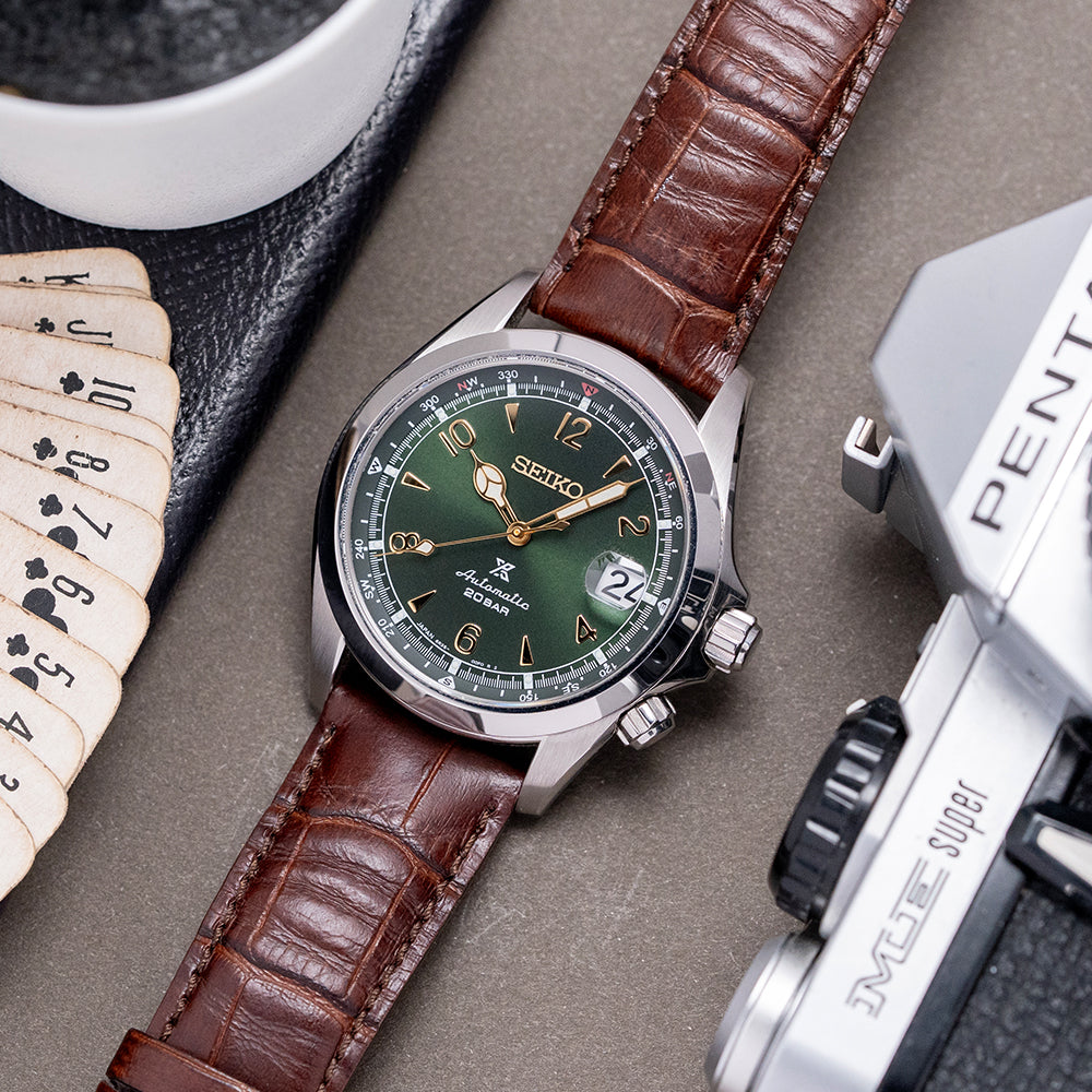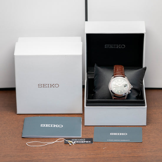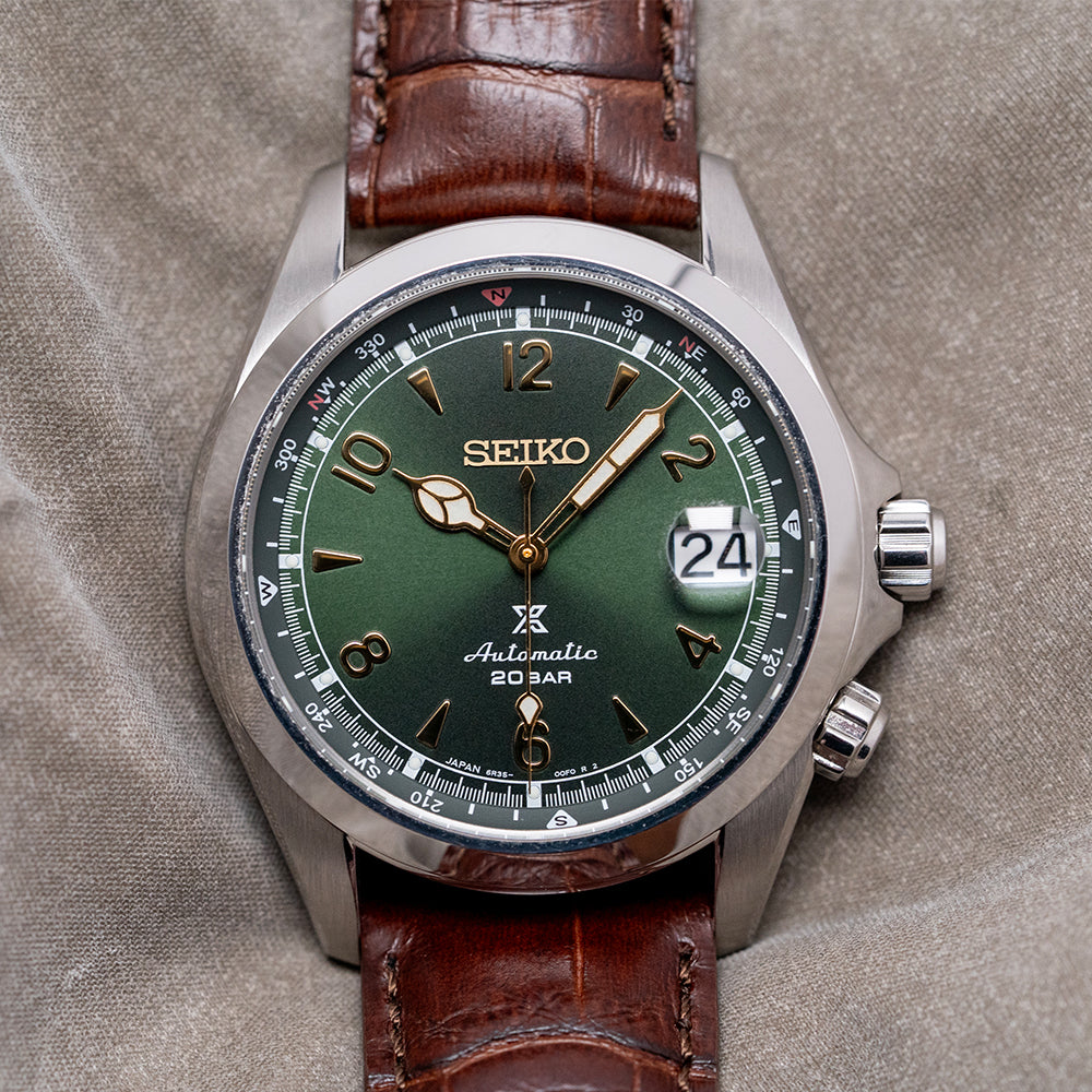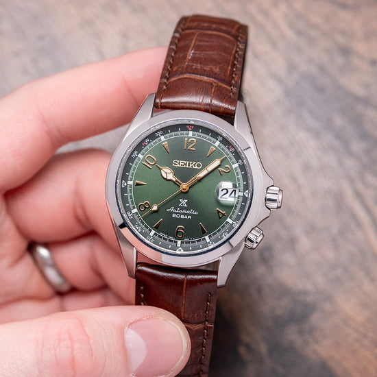 When it comes to modern Seikos and references, there really aren't many that come close to the Alpinist in terms of fame. Seiko introduced the Alpinist in 1961 under its Laurel sub-brand, which is Seiko's oldest sub-brand, first introduced in 1913. It was inspired by the Japanese term Yama-Otoko, meaning "Mountain Man." These men required equipment that was robust and accurate, as they led many expeditions. Seiko reintroduced the Alpinist in 1995 after a 30-year gap. Here we have the classic 2025 Seiko Prospex 'Alpinist' Green Automatic SPB121J1. Featuring a satin-brushed 39mm stainless steel case with tapering lugs and polished and brushed flanks, leads to a lug-to-lug length of 46mm and a thickness of 12.5mm, ensuring a comfortable fit on your wrist. On the right side, we have a screw-down crown with crown guards, and at 4 o’clock, a second crown is used to adjust the rotating inner compass bezel. A stepped, smooth-brushed bezel holds a flat, scratch-resistant sapphire crystal, AR-coated on the inside. An outer rotating compass chapter ring encircles the striking sunburst green dial. An outer rotating 360-degree compass minute surrounds a minute track that is precisely executed with LumiBrite pips. Attractive applied gilt Arabic numerals with alternating dagger indexes mark the hours. At 3 o’clock, there is a date window with Cyclops magnification on the sapphire crystal. Elegant LumiBrite-filled gilt cathedral-style hands are complemented by an arrow-point centre-seconds hand. Giving the watch a vintage look and feel. At noon, we have the gold-cloured Seiko, and at 6 o’clock, the Prospex motif Automatic 20Bar completes this striking classic adventurer's timepiece. On the reverse, there is a screw-down exhibition case back, inside an automatic Seiko 6R35, 24 jewels, 21,600 beats per hour. It is paired with its Seiko 20mm strap and a folding clasp. It also comes with a Seiko presentation box, swing tag and papers.