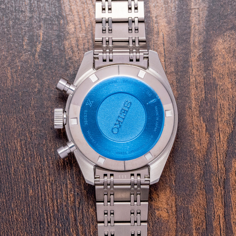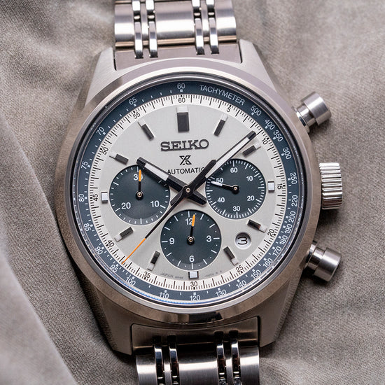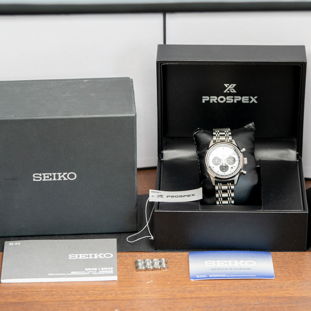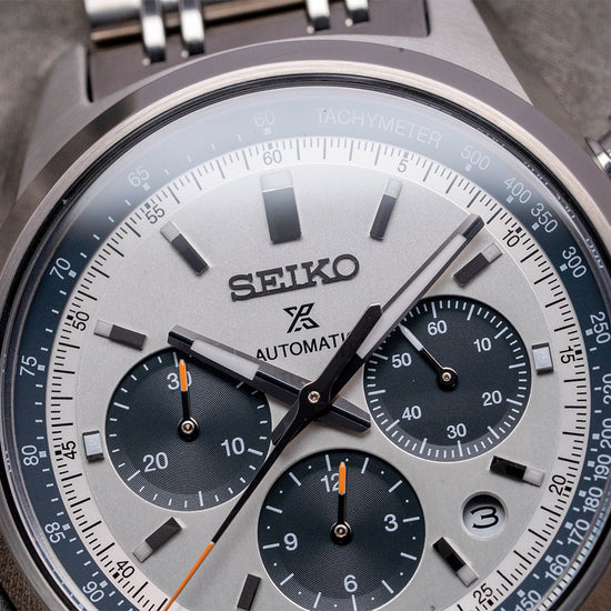 Here we have a modern recreation of their 1972 Panda Chronograph, first released by Seiko in 1969 as the ref: 6139. The 2025 Seiko Prospex Speedtimer Panda 1972 Re-Interpretation SRQ047J1 features a 42mm stainless steel case coated with a proprietary super-hard coating, along with flat-ended, tapered lugs for a comfortable fit. The brushed and polished surfaces transition with crisp lines, leading to a lug-to-lug length of 49.5mm and a case thickness of 14.5mm, which gives the watch an impressive wrist presence. On the right side, we have piston chronograph pushers and a signed, coin-edged crown at the centre. A smooth, polished, and brushed bezel holds a dual-curved sapphire crystal AR-coated on the inside above a dynamic silver panda dial. A gunmetal grey Tachymetre scale chapter ring sits atop the silver minute track, precisely executed, surrounding a vertically brushed silver dial with applied steel baton indexes tipped with Lumibrite, marking the hours. The chronograph consists of three gunmetal grey contrasting recessed registers: at 3 o’clock, a running seconds register with a white tipped stick hand: at 6 o’clock, a 30-minute register with an orange tipped stick hand: at 4.30, a round framed date window and finally at 9 o’clock, a 30-minute register with an orange tipped stick hand. At noon, we have the applied Seiko motif, printed underneath the Prospex logo, Automatic, which completes this vintage-inspired, modern reinterpretation tricompax chronograph. Facet-edged polished steel baton hands filled with Lumibrite are complemented by an orange-tipped chronograph hand. On the reverse, a screw-down solid case back engraved with the details of the watch around its edge and a high-relief ‘Seiko’ in the centre, inside an automatic Seiko Cal. 8R48, 34 jewels, beating at 28,800 beats per hour, this column wheel vertical clutch chronograph features hand-winding and quick-set date functionality for your convenience. It comes paired with its 20mm polished and brushed multi-link stainless steel bracelet, secured by a three-fold push-button signed clasp; all links are provided.