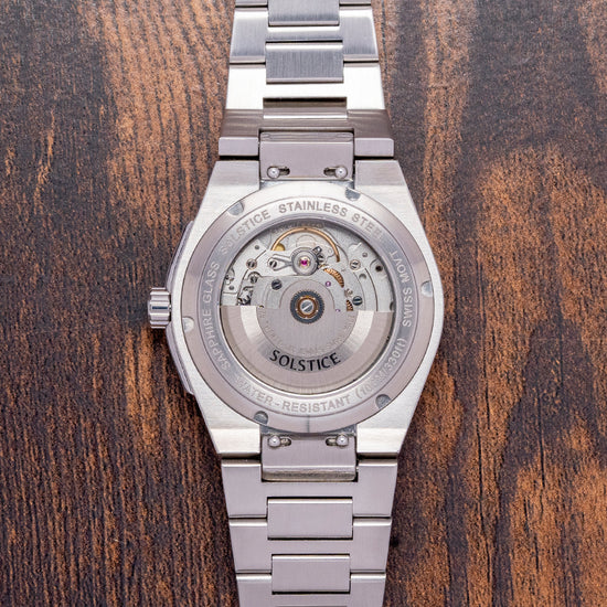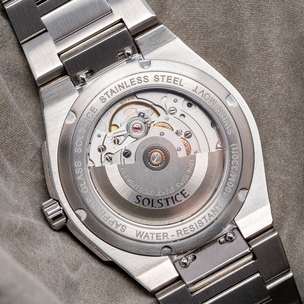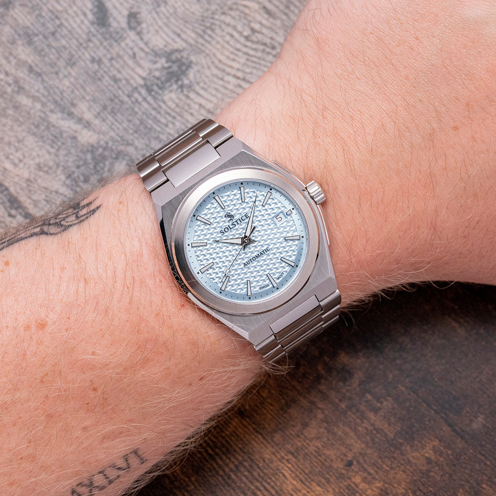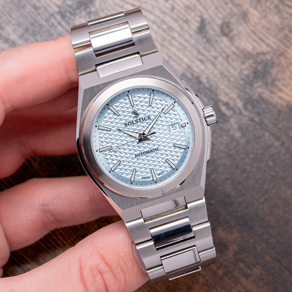Here we have a 2025 Solstice 'The Revival' Automatic Ice Blue with a 40mm polished and brushed marine-grade stainless steel tonneau-shaped case, its sharp angles and chamfered edges give the watch a 1970s Gerald Genta aesthetic, thanks to the flowing integrated bracelet and flat-ended lugs. Polished chamfered edges lead the eye to a lug-to-lug length of 46.5mm and a case thickness of 10.5mm, ensuring a comfortable fit on your wrist. On the right side, a signed, deeply knurled crown is protected by long, brushed and polished crown guards. The stepped, polished, and brushed smooth bezel holds a flat sapphire crystal AR-coated above a stunning 3D interlocking cube-patterned Ice blue dial, creating interest and depth. An outer minute track surrounds the applied polished steel indexes coated in Super-LumiNova BWG9, marking the hours. At 3 o’clock, a date window, elegant polished steel Dauphine hands filled with Super-LumiNova BWG9, are complemented by an arrow pointed sweeping second hand. At noon, we have the Solstice motif, and at 6 o’clock, ‘Automatic’ completes this striking, versatile sports watch. On the reverse, a screw-down exhibition case back engraved with the details of the watch around its edge, inside an automatic Sellita SW200-1, 26 jewels, beating at 28,800 beats per hour, decorated signed rotor and blue screws, this workhorse movement has hand winding, hacking seconds and quick-set date. It comes paired with its quick-release 24mm integrated polished and brushed stainless steel bracelet, secured by a push-button signed butterfly clasp. All links are provided, along with a 24mm additional quick-release white leather strap and a signed deployant clasp. This watch is sold with its original Solstice box and paperwork.