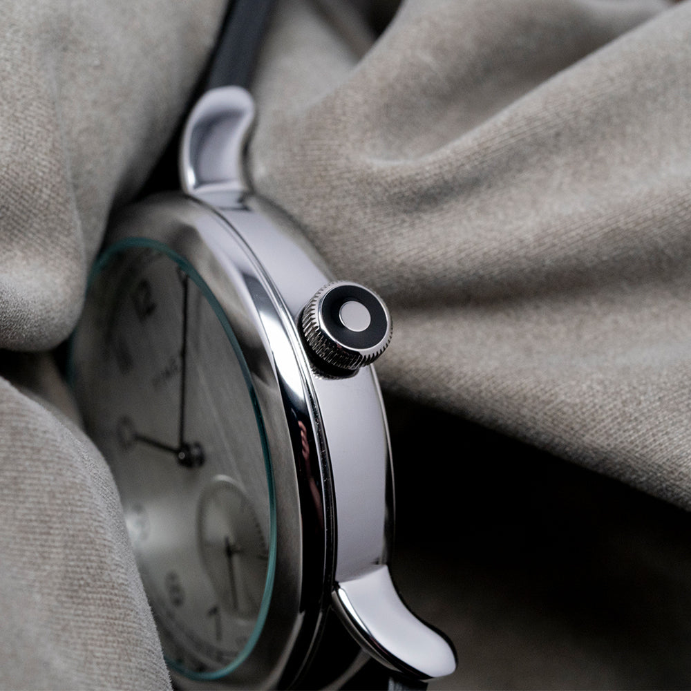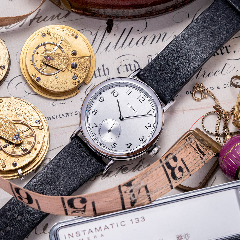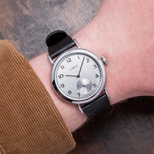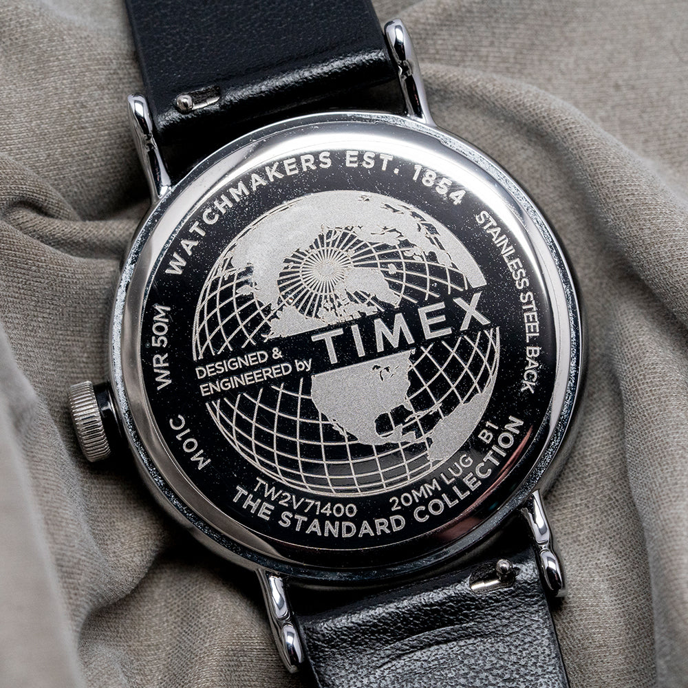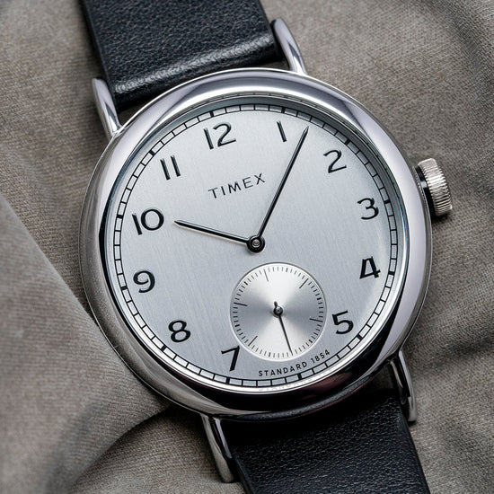 Here, we have a 2025 Timex Standard Sub-Second '1815' TW2V71400 with a 40mm polished silver-toned low-lead brass (LLB) round case that curves over your wrist, thanks to the curved lugs. The bowl-shaped flanks lead to a lug-to-lug length of 48.5mm and a case thickness of 10mm, ensuring a comfortable fit. On the right side, there is a coin-edged push/pull crown. The polished silver-toned brass bezel holds a mineral crystal above a vertically brushed silver dial. An outer minute track has thick black markers surrounding black Arabic numerals marking the hours; this striking configuration reminds us of the iconic A. Lange and Sohne 1815. Slim black stick hands sit above a recessed sunburst silver sub-seconds with a concentric circular pattern; at 12, we have the Timex motif completing this distinctive dress watch. On the reverse, a snap-on solid stainless steel case back etched with the details of the watch around its edge and the world globe showing the Northern Hemisphere and proudly stating “Designed and Engineered by Timex”, inside a Quartz movement. It comes paired with its original Timex 20mm leather strap with a signed polished buckle. This watch is sold with its original Timex box and paperwork.