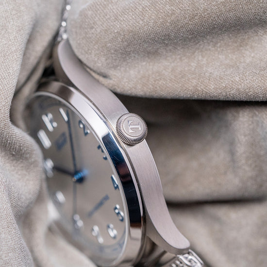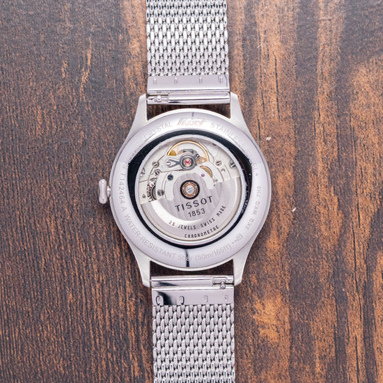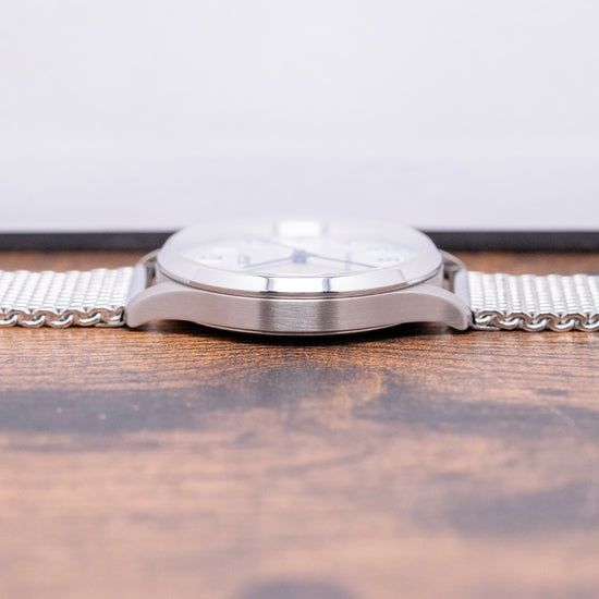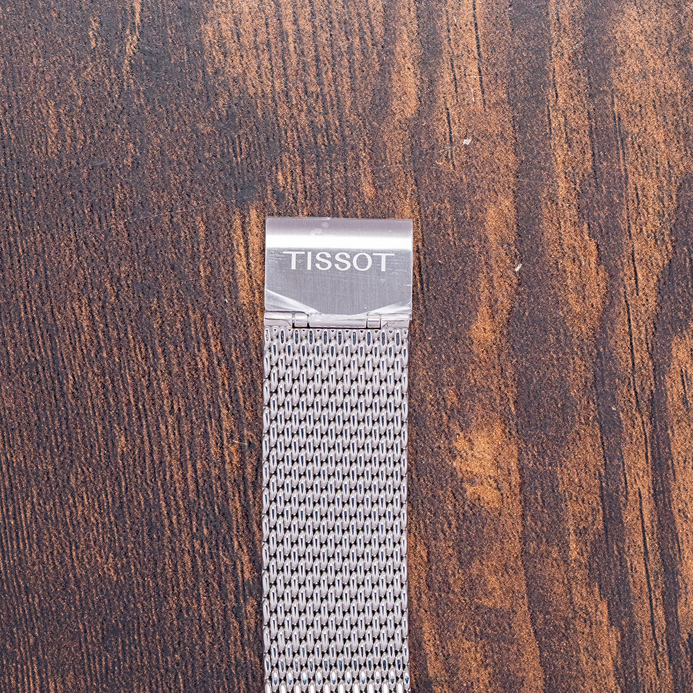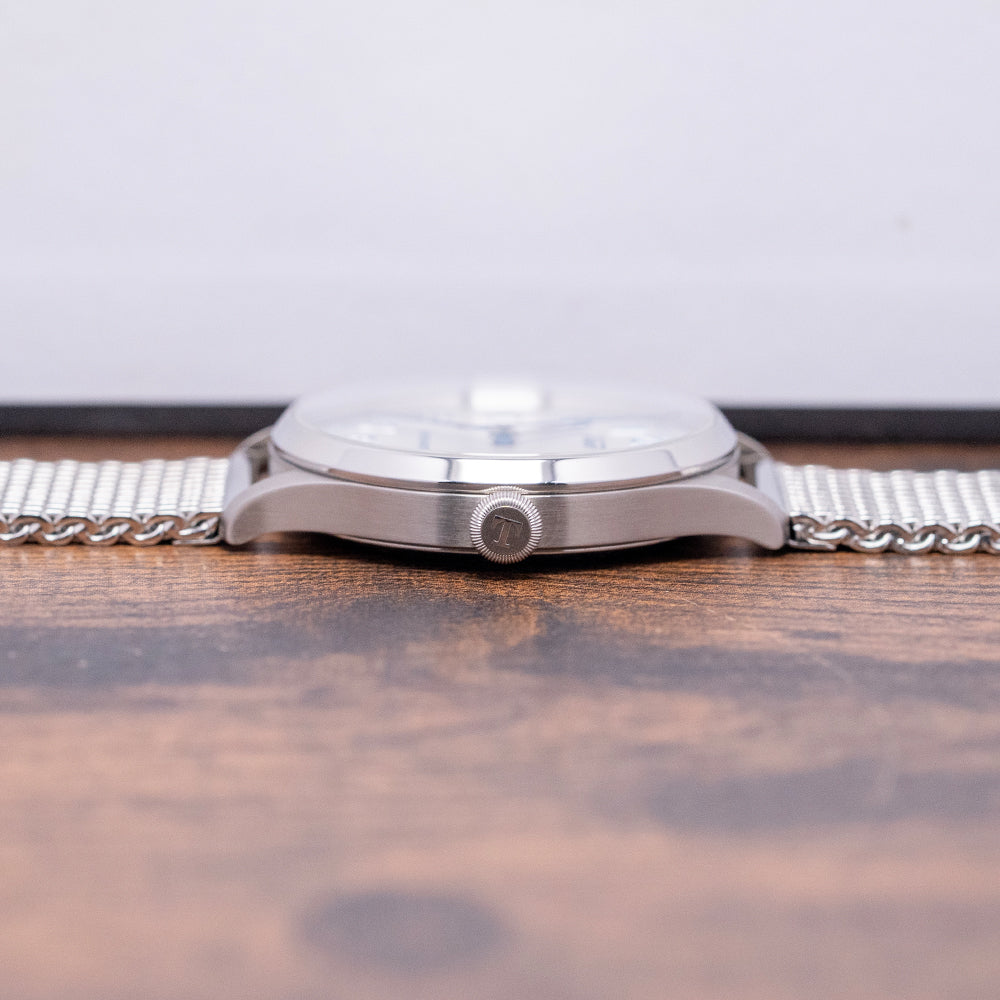 Here we have a 2025 Tissot Heritage 1938 Chronometre, inspired by their elegant 1930s designs, featuring a 39mm brushed stainless steel case that gently curves over your wrist and finely tapered lugs. Its curved flanks lead to a lug-to-lug length of 46.5mm and a case thickness of 11mm, ensuring a comfortable fit. On the right side, a signed coin-edged crown. A polished, smooth bezel holds a domed AR-coated sapphire crystal above a sandblasted white dial. An outer blue minute rail track surrounds blue Arabic numerals marking the hours. Elegant pencil hands are complemented by a tapered, sweeping second hand. At noon, we have the Tissot motif, and at 6 o’clock, ‘Chronometer’ completes this vintage-inspired, sophisticated dress watch. On the reverse, a screw-down exhibition case back is engraved with the watch details around its edge. Inside an automatic ETA Cal. 2824-2, 25 jewels, beating at 28,800 beats per hour, COSC-Certified. Featuring a gold-toned bidirectional rotor, hacking seconds and manual winding for your convenience. It comes paired with its 20mm mesh stainless steel adjustable bracelet, plus a quick-release 20mm Tissot leather strap and signed pin buckle. This watch is sold with its original Tissot box, swing tags and paperwork.