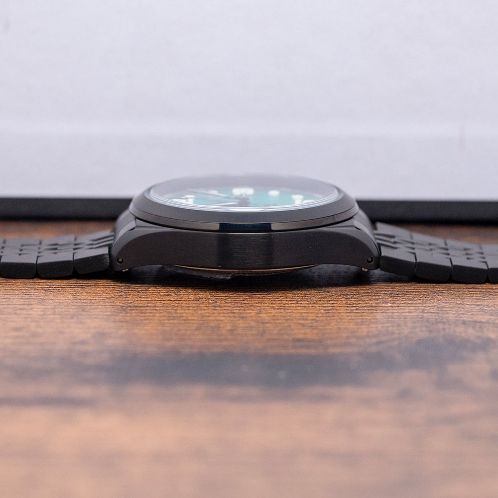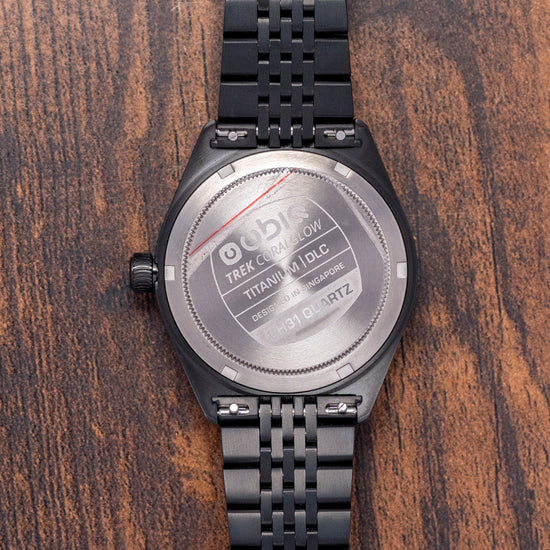 Here we have a stealthy 2025 UBIQ TREK CoralGlow Dial Mechaquartz featuring a 38mm Titanium case coated in scratch-resistant black DLC to a hardness of 600 HV. Its tapered lugs sit comfortably on your wrist with curved flanks leading to a lug-to-lug length of 44mm and a case thickness of 11.5mm. On the right side, a screw-down deep knurled crown. The smooth, radially brushed bezel holds a raised, flat sapphire crystal, AR-coated on the inside, above a stepped CoralGlow Dial. An outer 24-hour chapter ring surrounds a minute track above the applied blocks and numerals of Super-LumiNova BGW9, creating depth and interest to this incredible coloured dial that reflects the tones of a coral reef. Custom hands filled with the same Super-LumiNova BGW9 are complemented by a grey tapered seconds hand. At noon, we have the UBIQ motif and ‘TREK 10 BAR’ completes this sports dive watch. On the reverse, a screw-down Titanium solid case back is engraved with the watch's details. Inside a Mechaquartz Seiko Cal. VH31, released in 2015, features a stepper motor for a smooth four beats per second rather than the usual one beat per second quartz. It comes paired with a 20mm quick-release black DLC Titanium hardened to 600HV multilink bracelet secured by a push-button depolyant clasp, plus two additional 20mm straps in the box. The watch comes with its UBIQ presentation box, watch travel roll and paperwork.