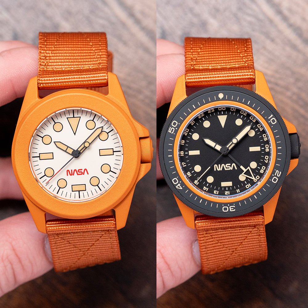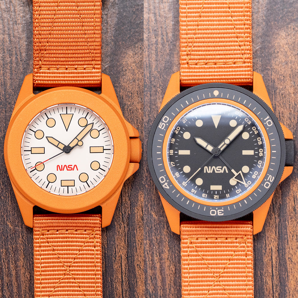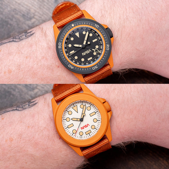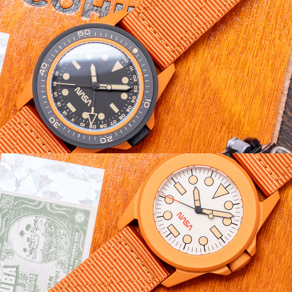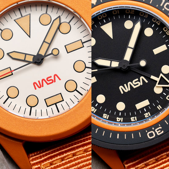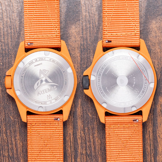 Here we have a 2025 Unimatic "NASA" Box Set Limited Edition U1-SPGS & UT4-SPT launched in 2025 to celebrate the NASA Artemis program, which aims to send the first astronauts to the Moon since the Apollo missions of the 1960s and 1970s and limited to 50 pieces—featuring a Modello Uno U1-SPGS with a 40mm “NASA Artemis” burnt orange Cerakote-coated 316L stainless steel case. Cerakote is a specialised ceramic-based paint that’s often used on aeroplanes and cars. It not only looks great but also helps protect surfaces from rust and damage due to its anti-corrosive properties. On the right side, a black Cerakote-coated coin-edged crown signed with the Alchemical Sun is protected by crown guards. The unidirectional 120-click bezel is coated in black Cerakote and features a 60-minute scale, a 2.5mm double-domed sapphire crystal AR-coated on the inside, and a matte black dial. A 24-hour scale surrounds the minute track above disc and baton indexes marking the hours, all coated in Super-LumiNova GL light old radium. Matte black Unimatic ladder hands filled with the same lume are complemented by a reverse lollipop sweeping second hand and a matte black and Super-LumiNova GL light old radium coated hollow arrow pointed GMT hand. At 6 o’clock, we have the NASA logo completing this space-themed traveller's companion. On the reverse, a solid case back with the watch details and the engraved NASA Artemis emblem, inside an Automatic Seiko Calibre. NH34A, 24 Jewels beating at 21,600 Beats per hour. It comes paired with a 22mm Unimatic burnt-orange strap and a burnt-orange Cerakote-coated signed buckle. The second watch in the set is the Modello Quattro UT4-SPT “NASA Artemis II,” limited to 99 pieces, featuring a 39mm “NASA Artemis II” burnt-orange Cerakote-coated 316L stainless steel case, tested to the MIL-STD-810H standard, a U.S. Department of Defense standard for testing military equipment's durability against harsh environmental conditions like extreme temperatures, shock, humidity, vibration, and dust, ensuring it survives its service life. On the right side, a burnt-orange Cerakote-coated coin-edged crown signed with the Alchemical Sun is protected by crown guards. The fixed, burnt-orange Cerakote™-coated bezel holds a 2.5mm double-domed sapphire crystal, AR-coated on the inside, above a white dial. An outer minute track sits above the disc and baton indexes, marking the hours, coated in Super-LumiNova Cream Old Radium. Matte black Unimatic ladder hands filled with the same lume are complemented by a reverse lollipop red-tipped sweeping second hand. At 6 o’clock, the red NASA logo completes this space-themed toolwatch. On the reverse, a solid case back with the watch details and the engraved NASA Artemis emblem, inside a Quartz Seiko Cal. Seiko VH31, tested to the MIL-STD-810H standard for accuracy. It comes paired with a 22mm Unimatic burnt-orange nylon strap and a burnt-orange Cerakote-coated signed buckle. This watch is sold with its original tough case, Unimatic "NASA" Box Set, NASA velcro patch and paperwork.