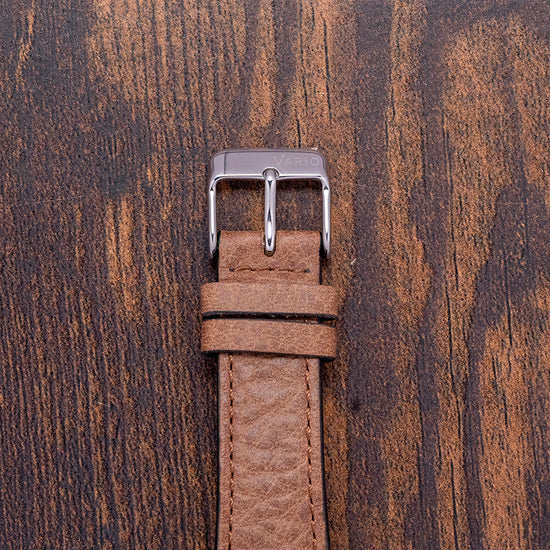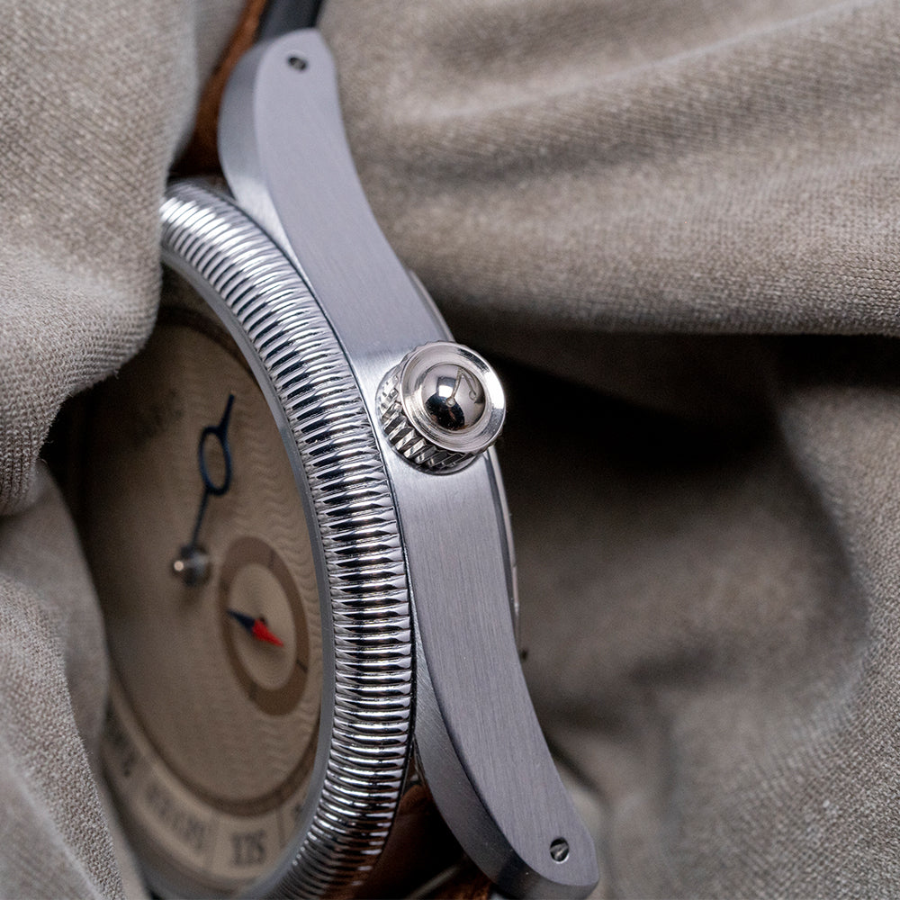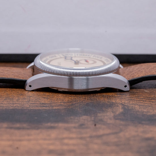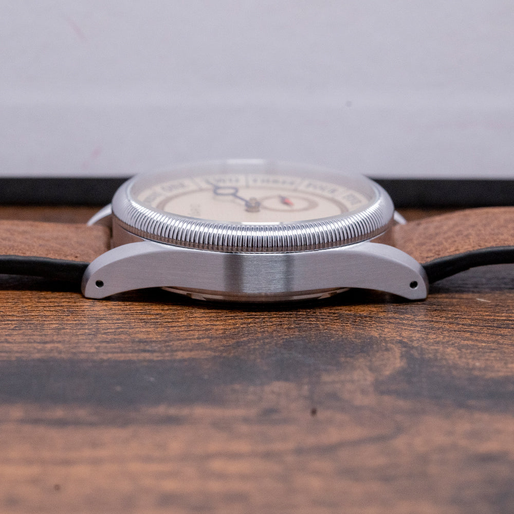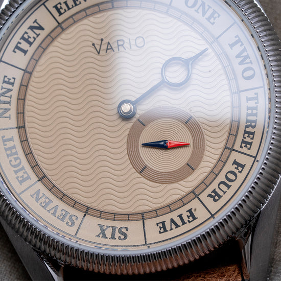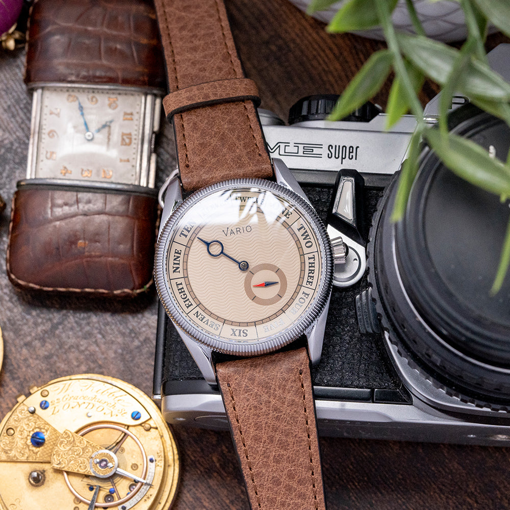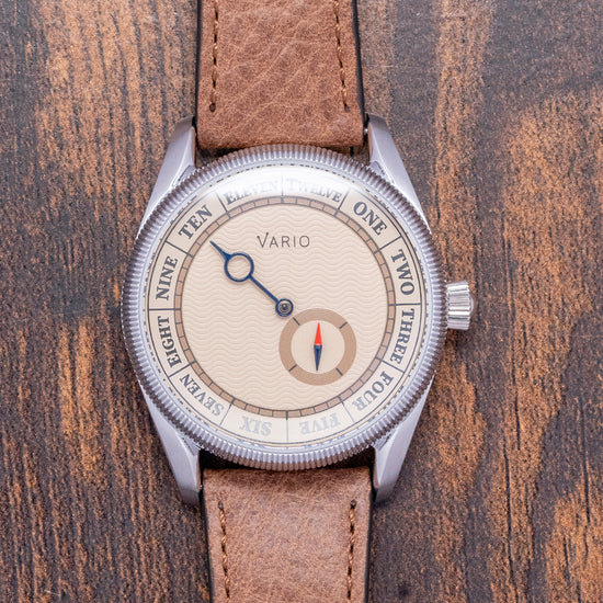 Here we have the 2025 Vario Navi Single Hand Sand Beige Compass, limited 43/60 pieces. Featuring a 38mm brushed stainless steel case with a scratch-resistant coating, that curves over your wrist thanks to the brushed and polished tapered drilled lugs. Its brushed curved flanks lead to a plug-to-lug length of 46mm and a case thickness of 12mm, ensuring a comfortable fit. On the right side, there is a domed, deeply knurled crown. A coin-edged bezel holds a domed sapphire crystal, AR-coated on the inside, above a striking beige-coloured dial. The 12-hour sections are divided into 15-minute intervals. Its single black Breguet-style hand hits each marker perfectly, providing a unique way of telling the time. At 4:30 a running seconds subdial with an orange and black hand. The Vario motif sits at noon, completing this distinctive timepiece. On the reverse, a screw-down solid case back engraved with the details of the watch around its edge and a compass engraved in the centre, inside an automatic Miyota Cal. 82S5, 21 jewels, beating at 21,600 beats per hour. It comes paired with its quick-release 20mm Vario leather strap and signed pin buckle.